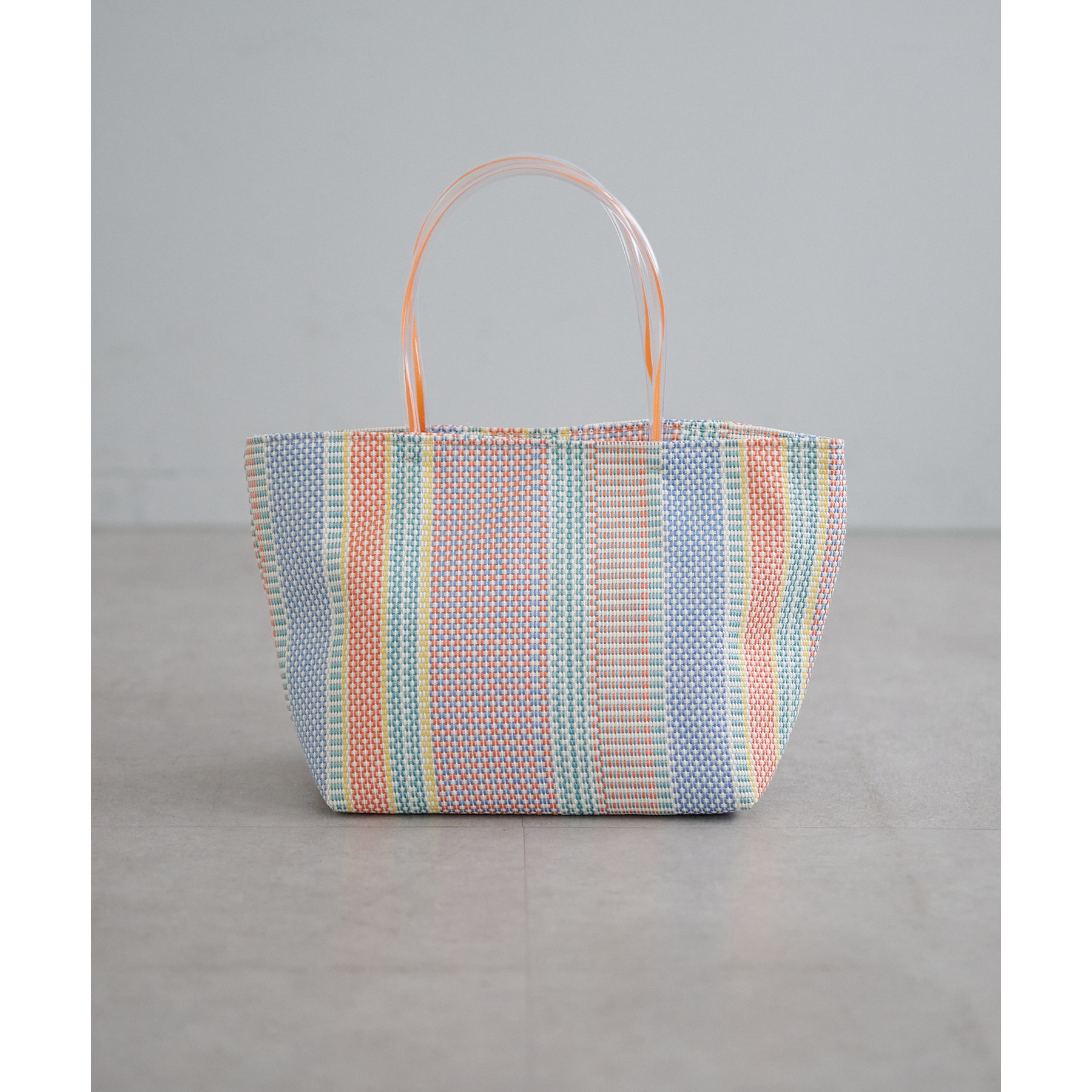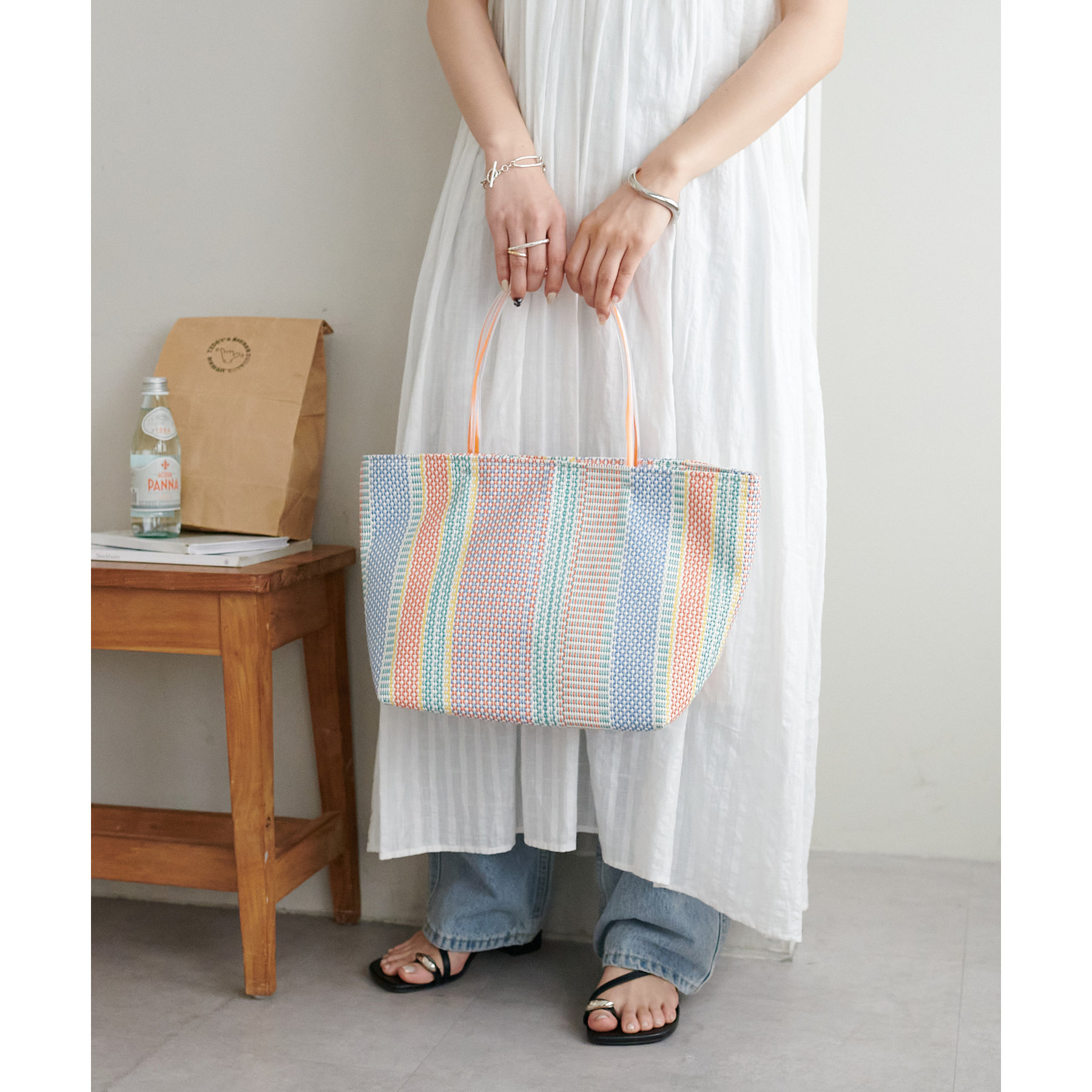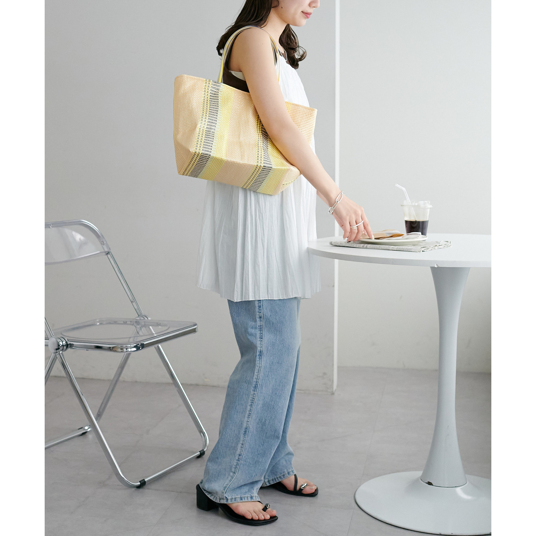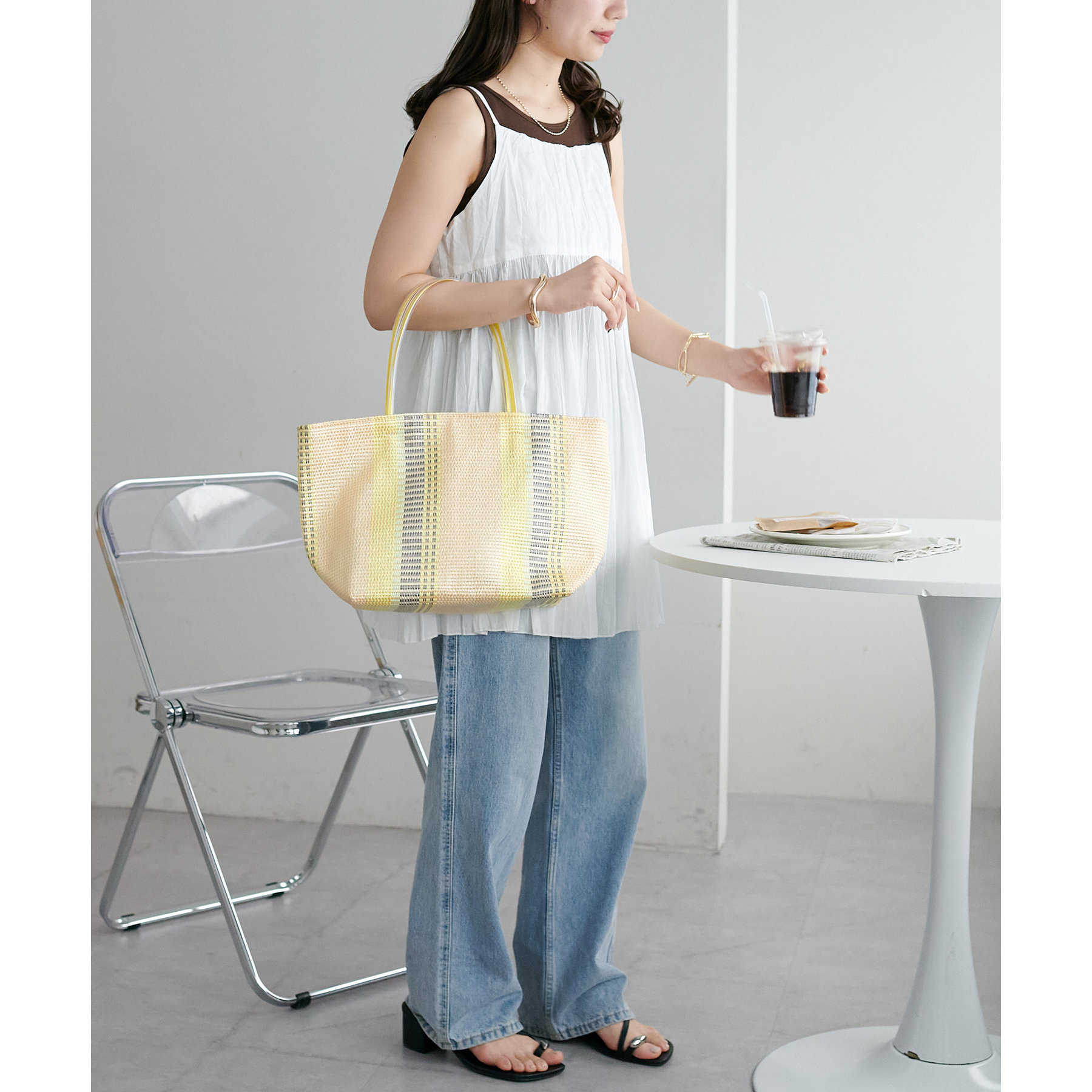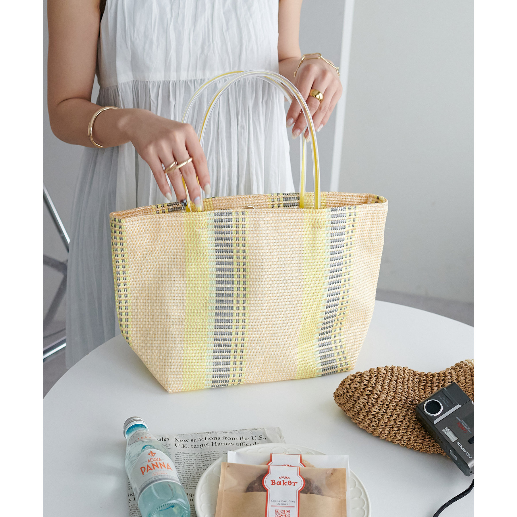 夏らしい素材のチューブハンドルストライプトートバッグ。