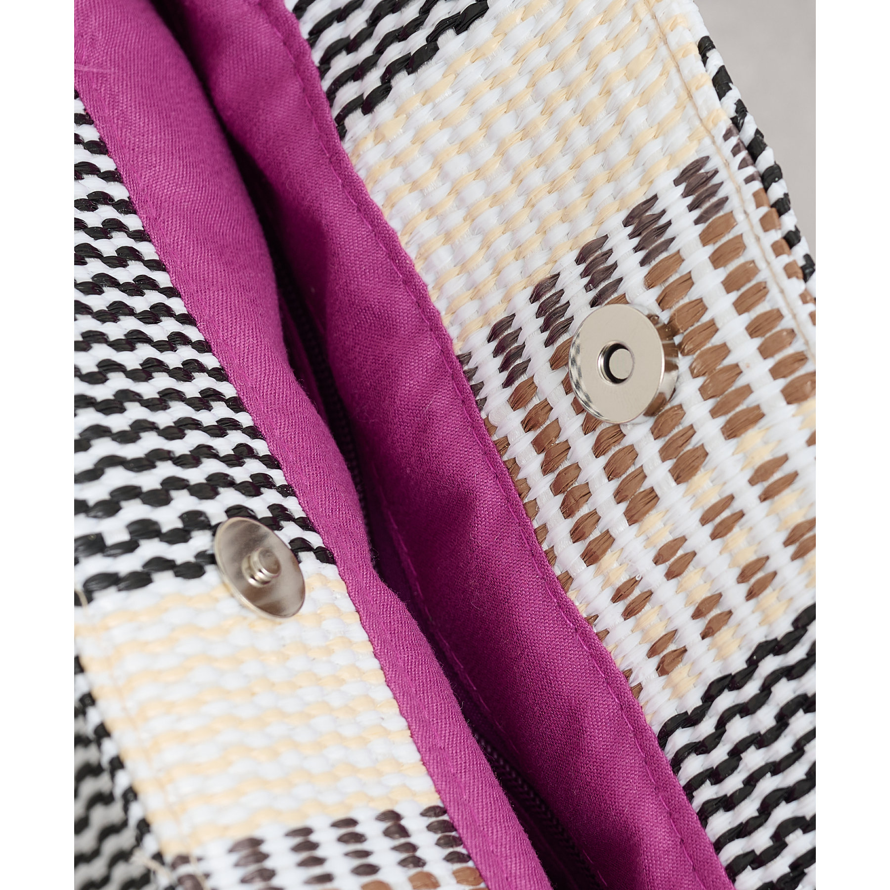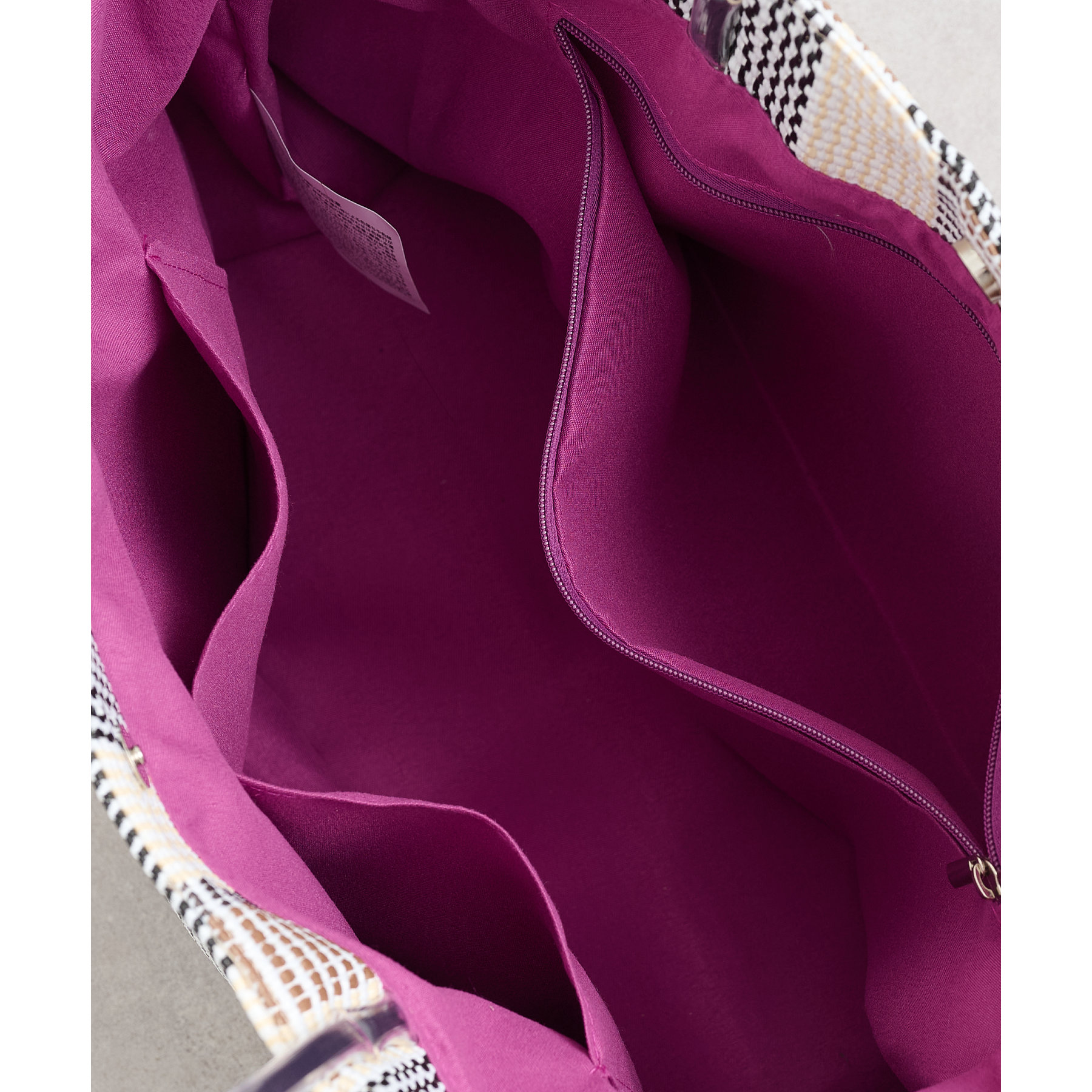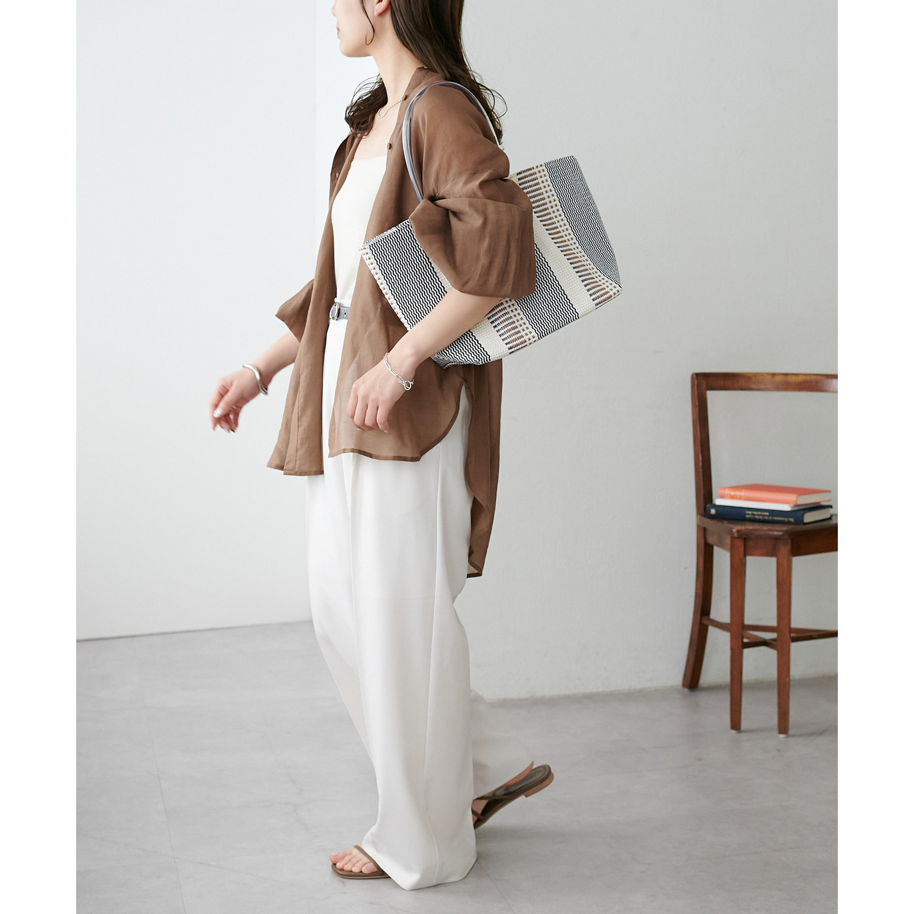 持ち手は夏らしい軽量なクリア素材のチューブなので握りやすく、サマームードを盛り上げてくれるトートバッグ。普段使いにちょうどいいサイズ感ですが、マチが16.5cmと広いため、見た目以上の収納力があります♪間口が大きめで開閉がスムーズなマグネット付きなので中身が見えにくく飛び出しにくいです。また、内ポケットもあるので整理整頓しながら小物も収納できます。レトロな雰囲気がかわいく、ストライプ柄がコーデのアクセントに◎