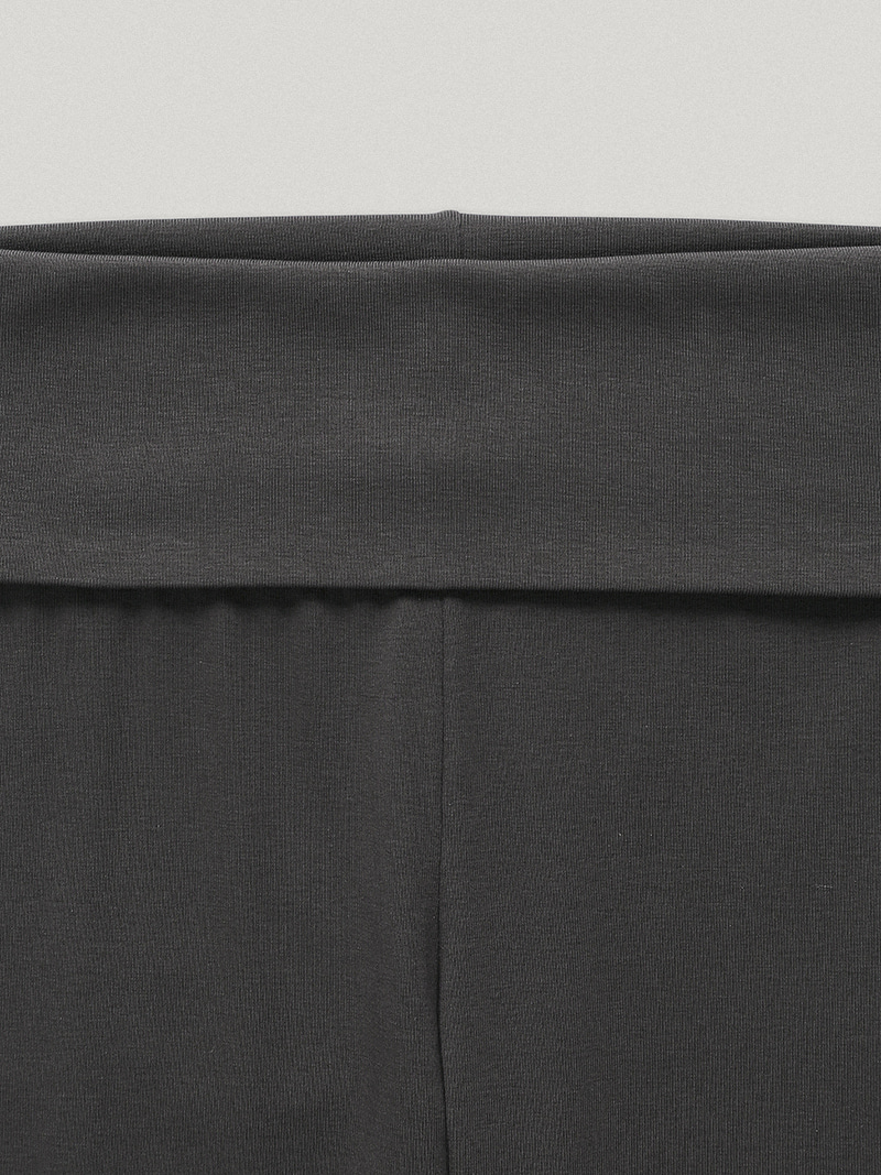 これはオフのレギンスで、日常生活やリラックスに使える。軽量で柔軟な綿とスパンデックスのブレンド素材で作られています。レギンスパンツは日常着として楽しめます。レギンスは非常に伸縮性が高く、乾燥した感触があり、まるで自分の肌のように快適なフィット感があります。セミフレアのラインデザインででき、脚のラインはとても細く長く見えます。ウエストのバンドは折りたたんでフォールドオーバーになり、官能的な雰囲気を楽しめます。高品質な縫製で丁寧に仕上げられます。オフデューティのボタンTシャツやセットアップにもお合わせできます。お気に入りのニットウェアやシャツ、ナチュラルなコーディネートをお楽しみください。豪華なダークグレーチャコールカラー、コットン92%スパンデックス、8%フォードオーバーバンディング、セミフレアライン