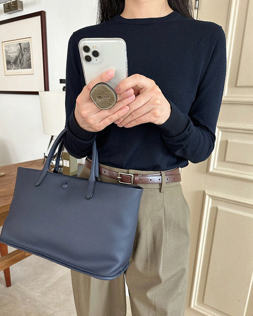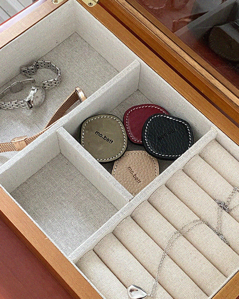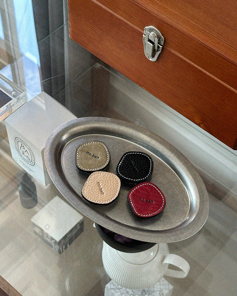 レザーとアクリルの精密な結合のため手作業で製作しており、その過程で生じる微細な接着剤跡や気泡などは商品の自然な特徴です。