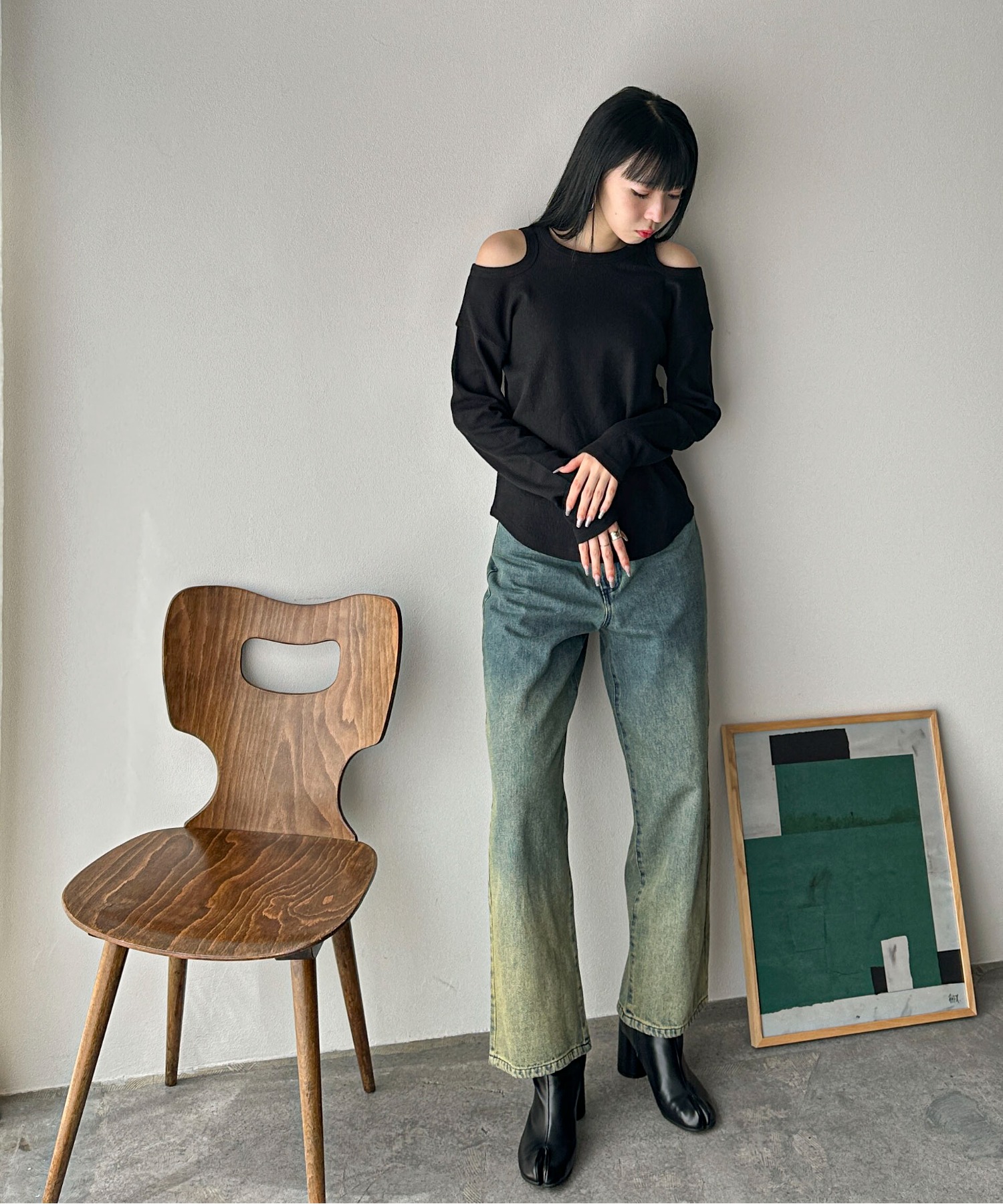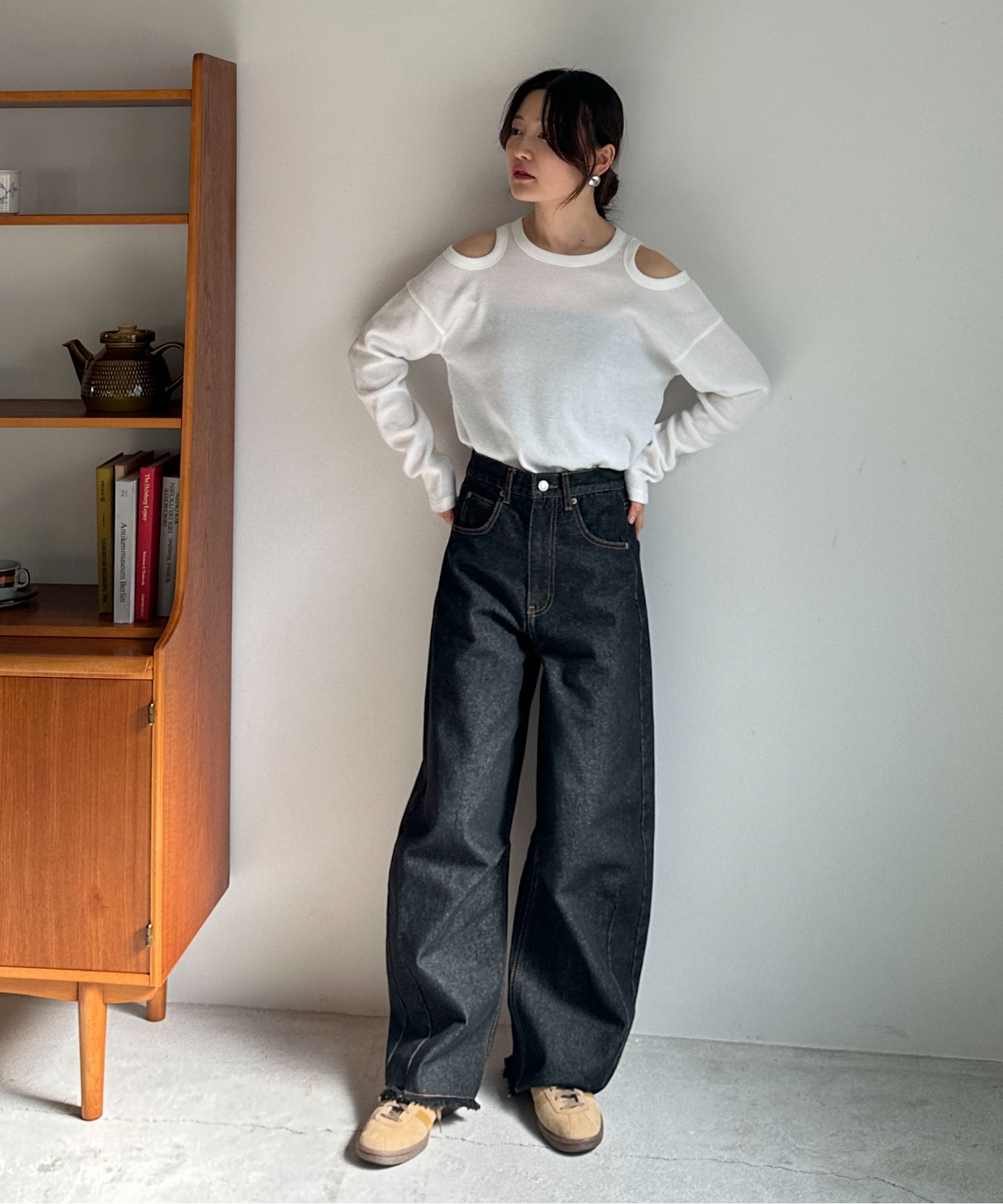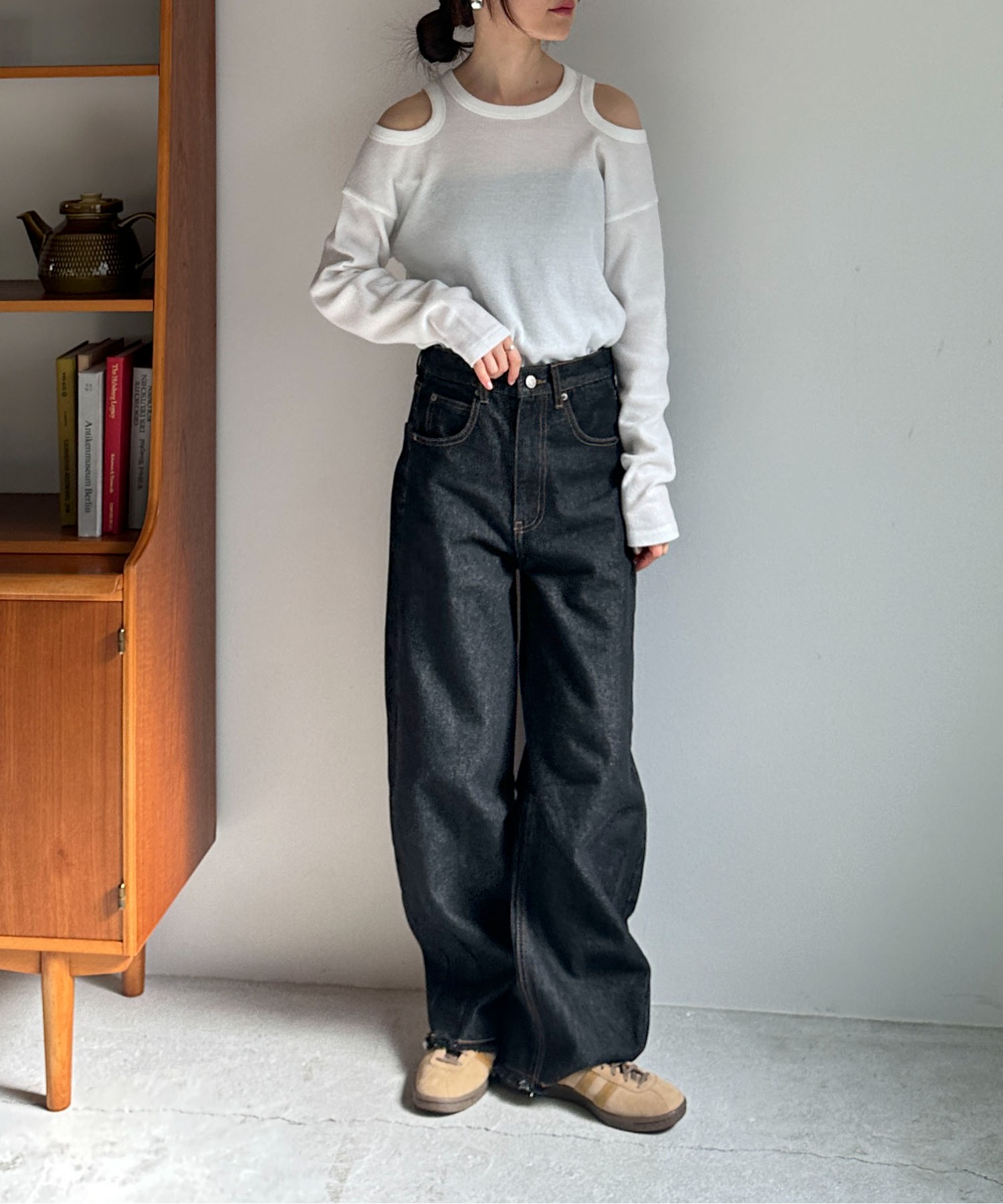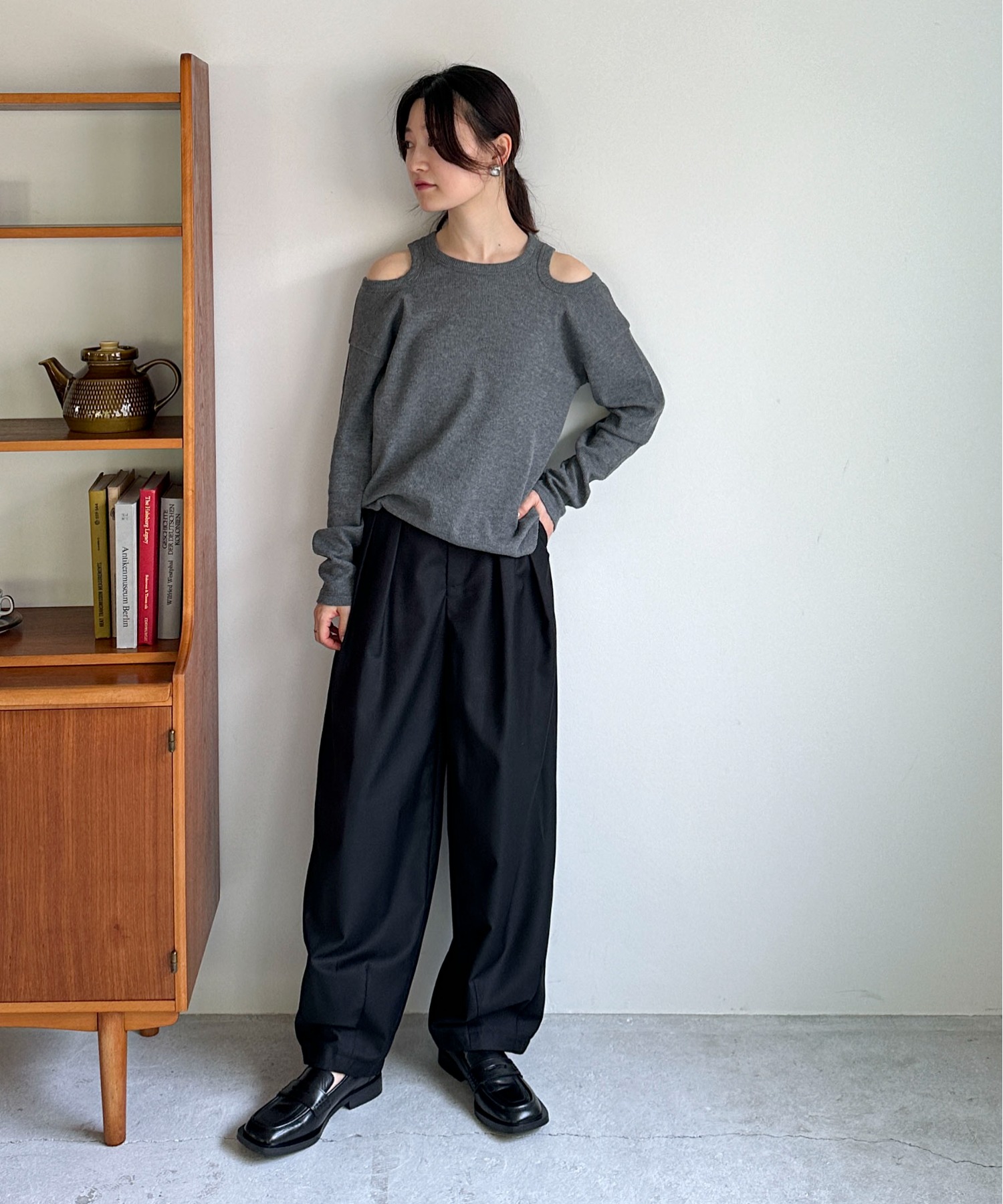 肩の開きがポイントなためベアトップやビスチェとの合わせなどもおすすめです。