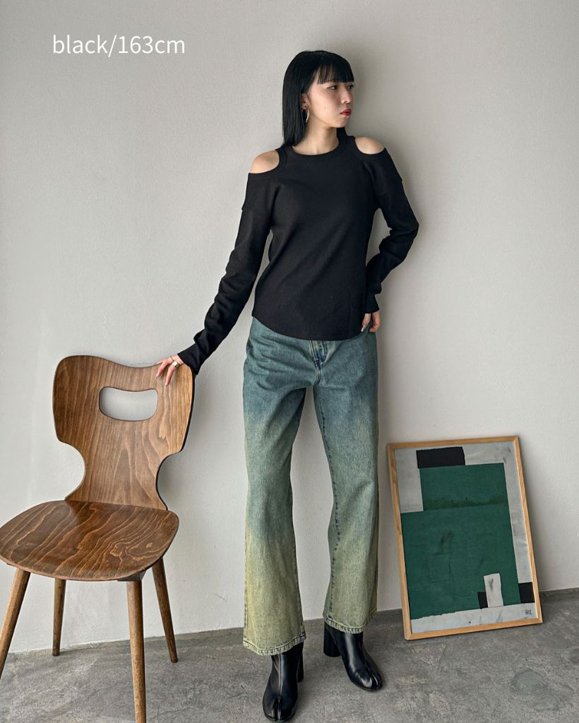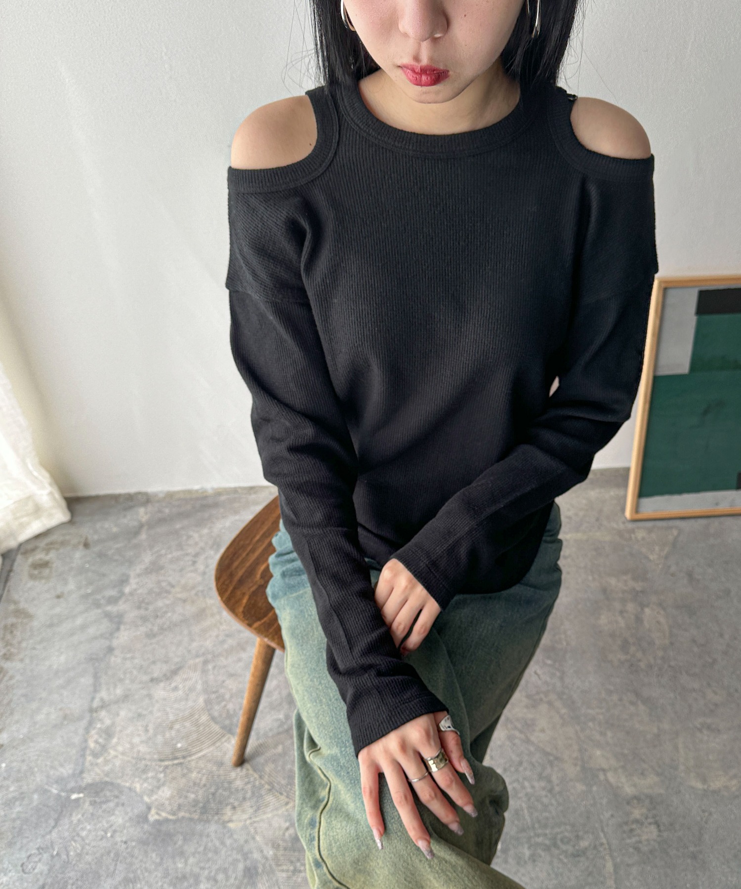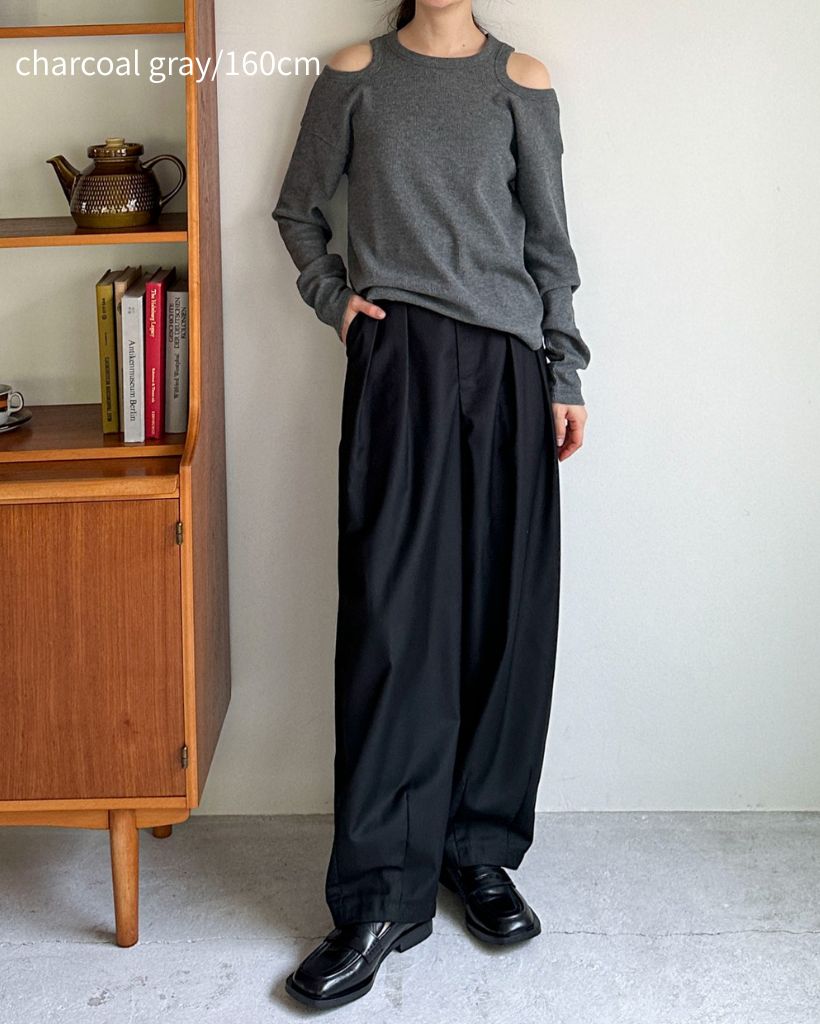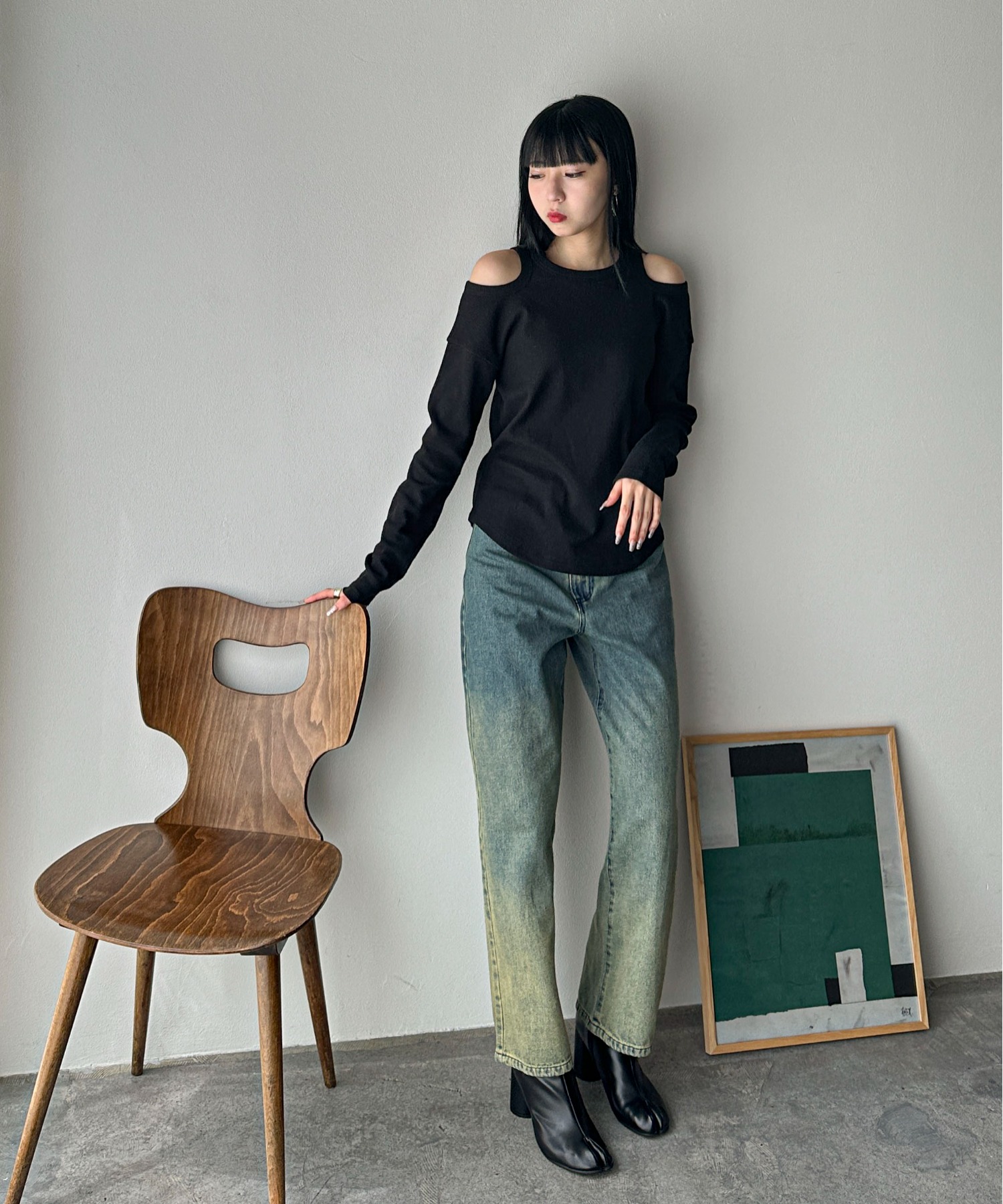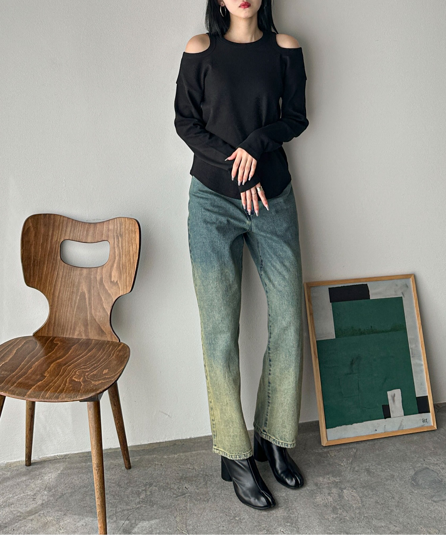肩の開きがポイントなためベアトップやビスチェとの合わせなどもおすすめです。