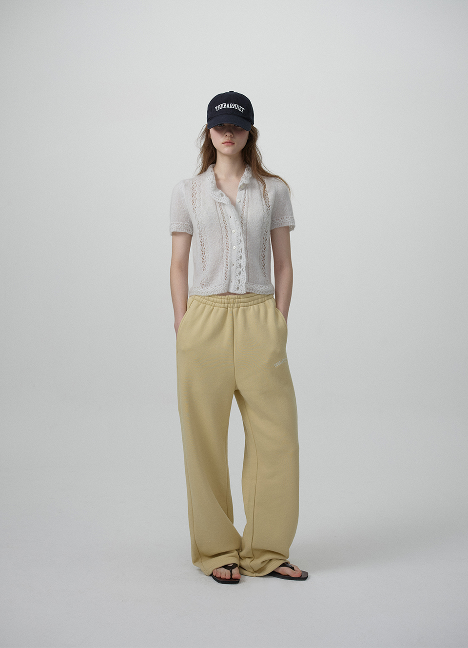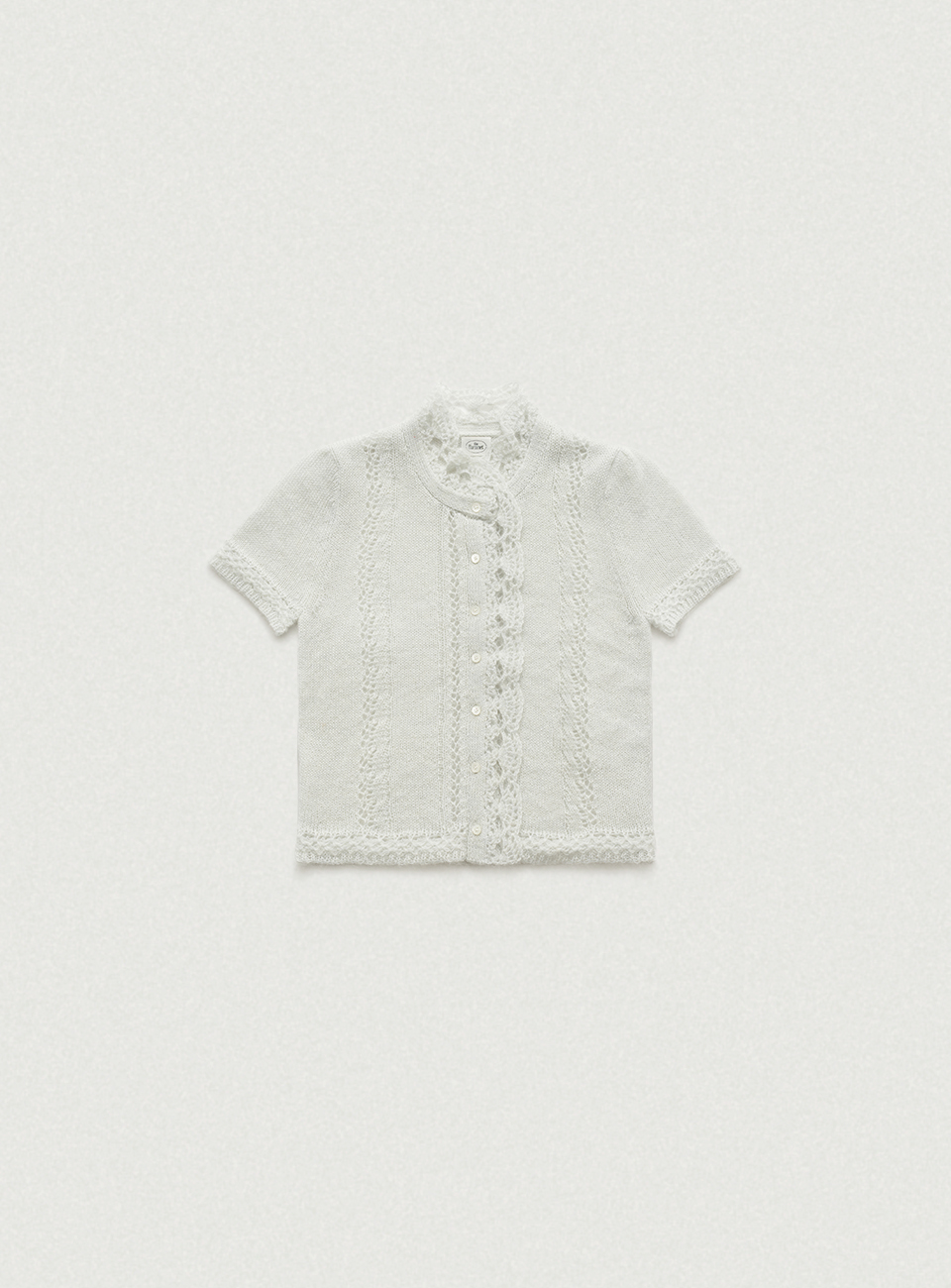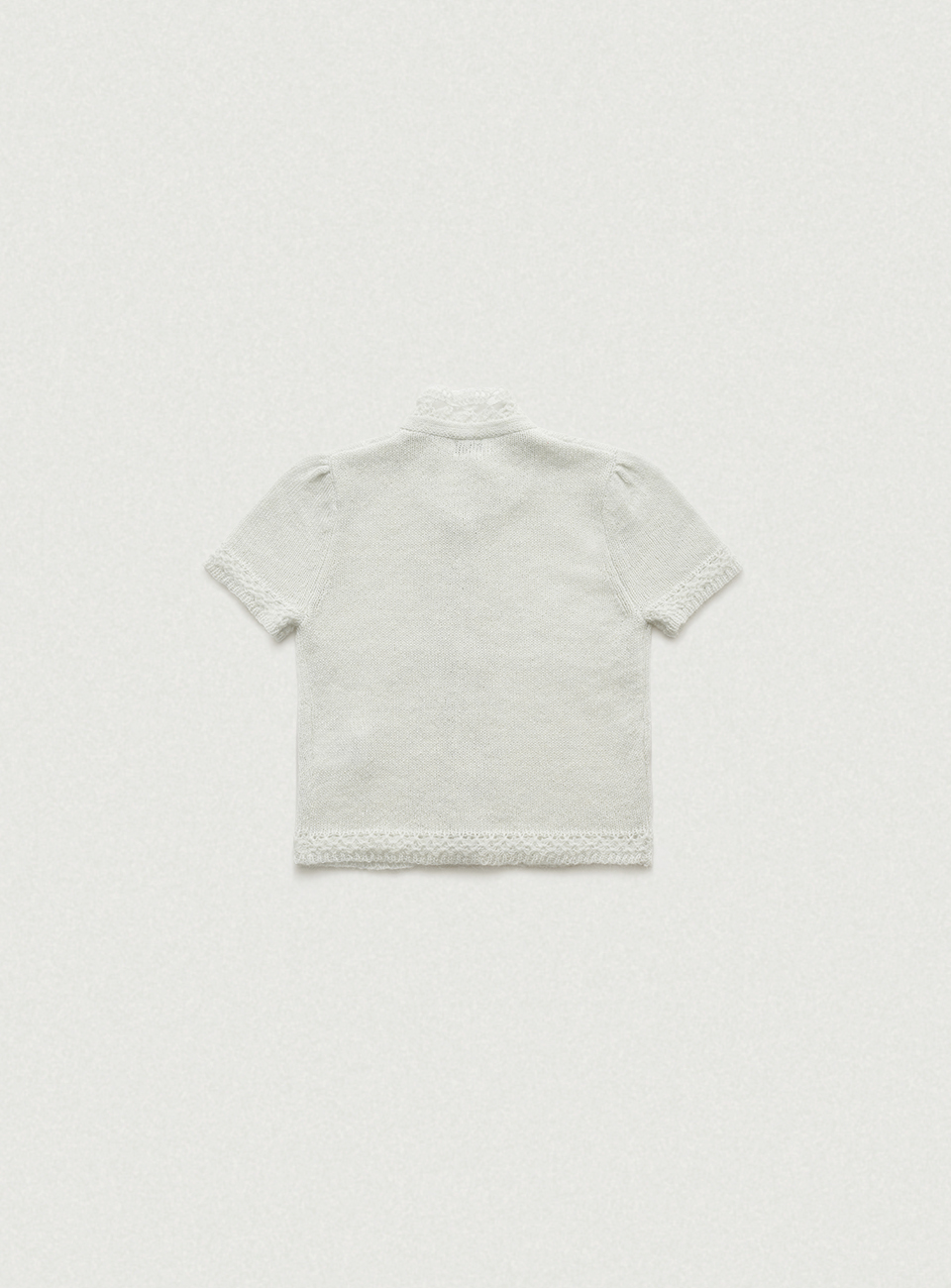貝ボタンを使用したボタン留め仕様の半袖ニットカーディガン