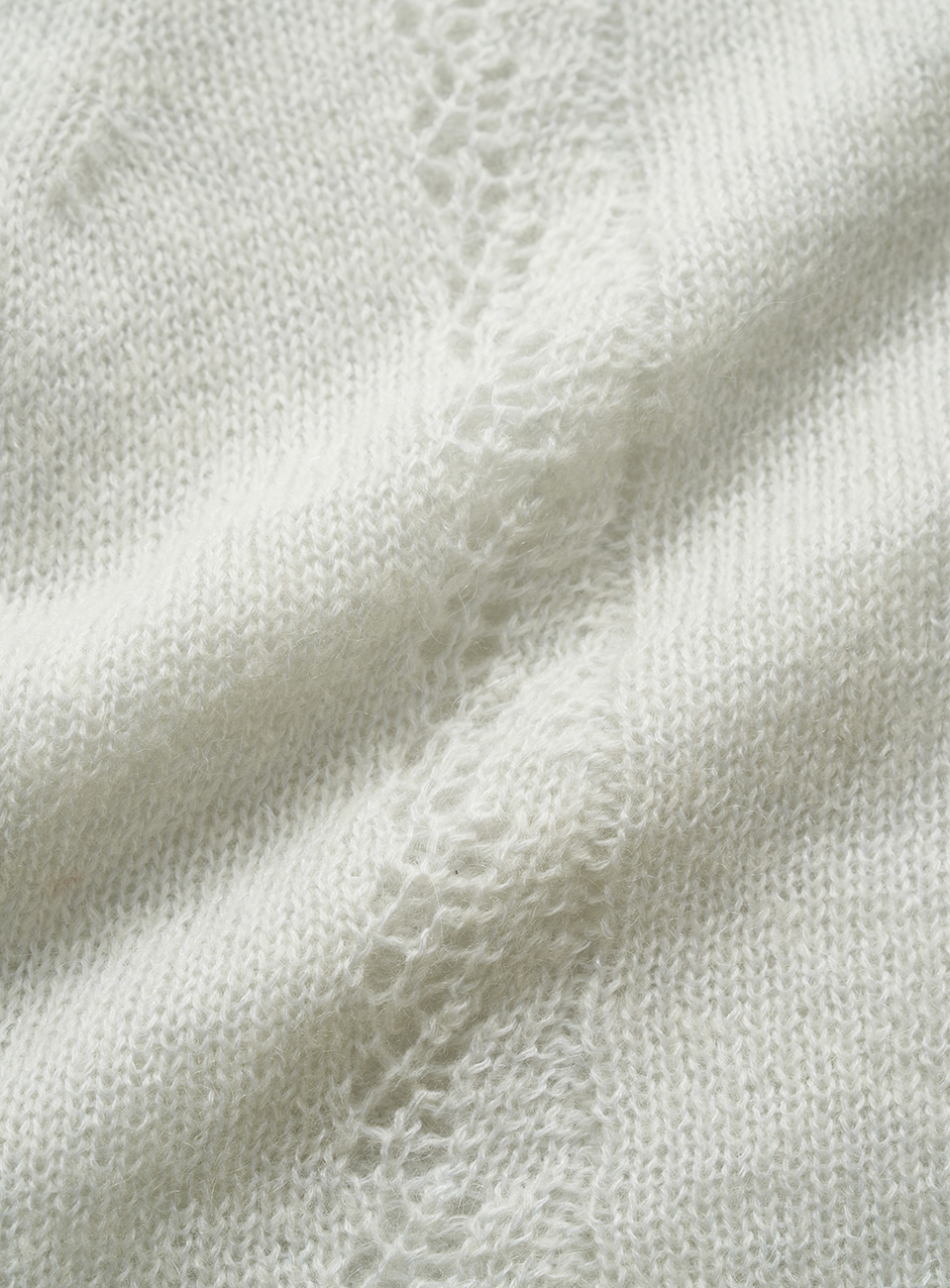 温かみのあるライトブルーで、ヘアリーな糸が特徴のモヘア×ウール混ニット