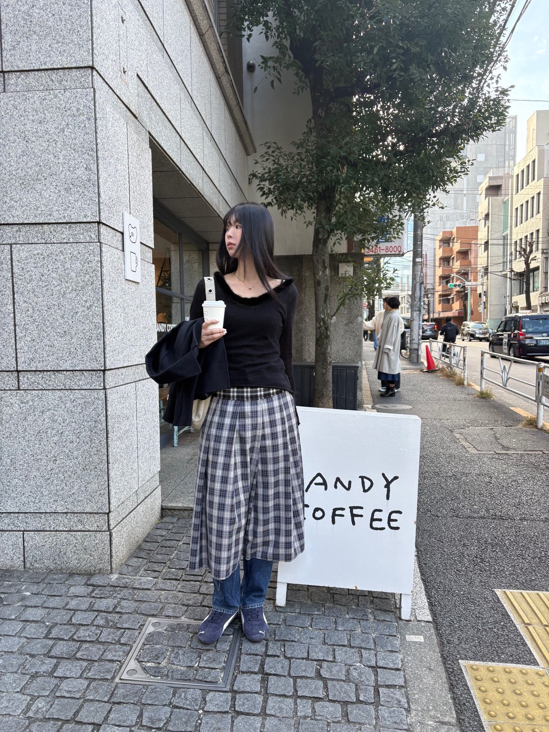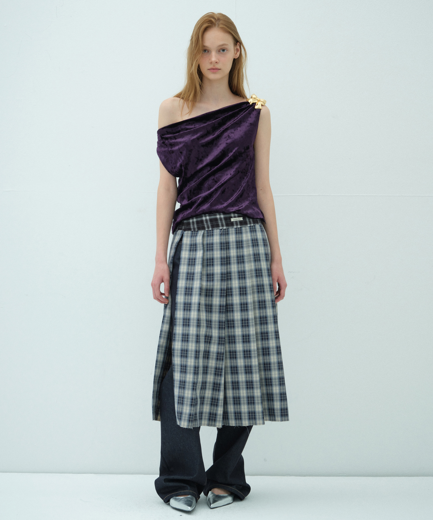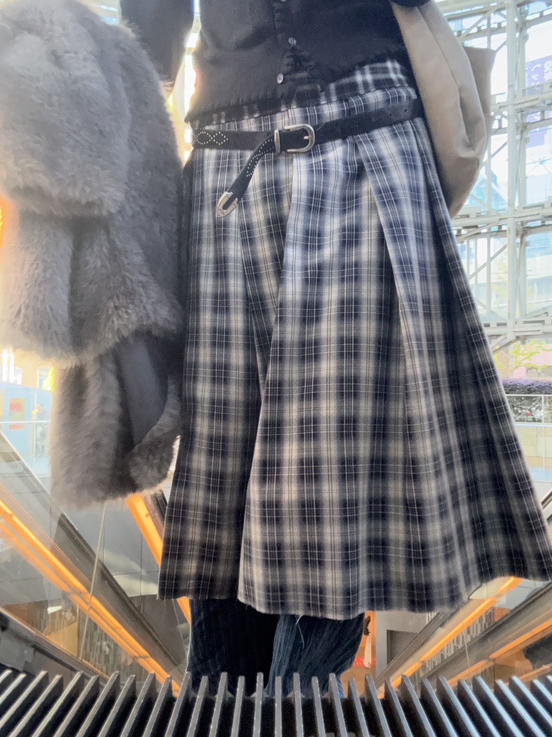 ウエスト部分にはブラックモノチェック、スカート部分にはネイビーベースチェックと、それぞれ異なる素材を組み合わせ、ヴィンテージでカジュアルなムードにデザインしました。