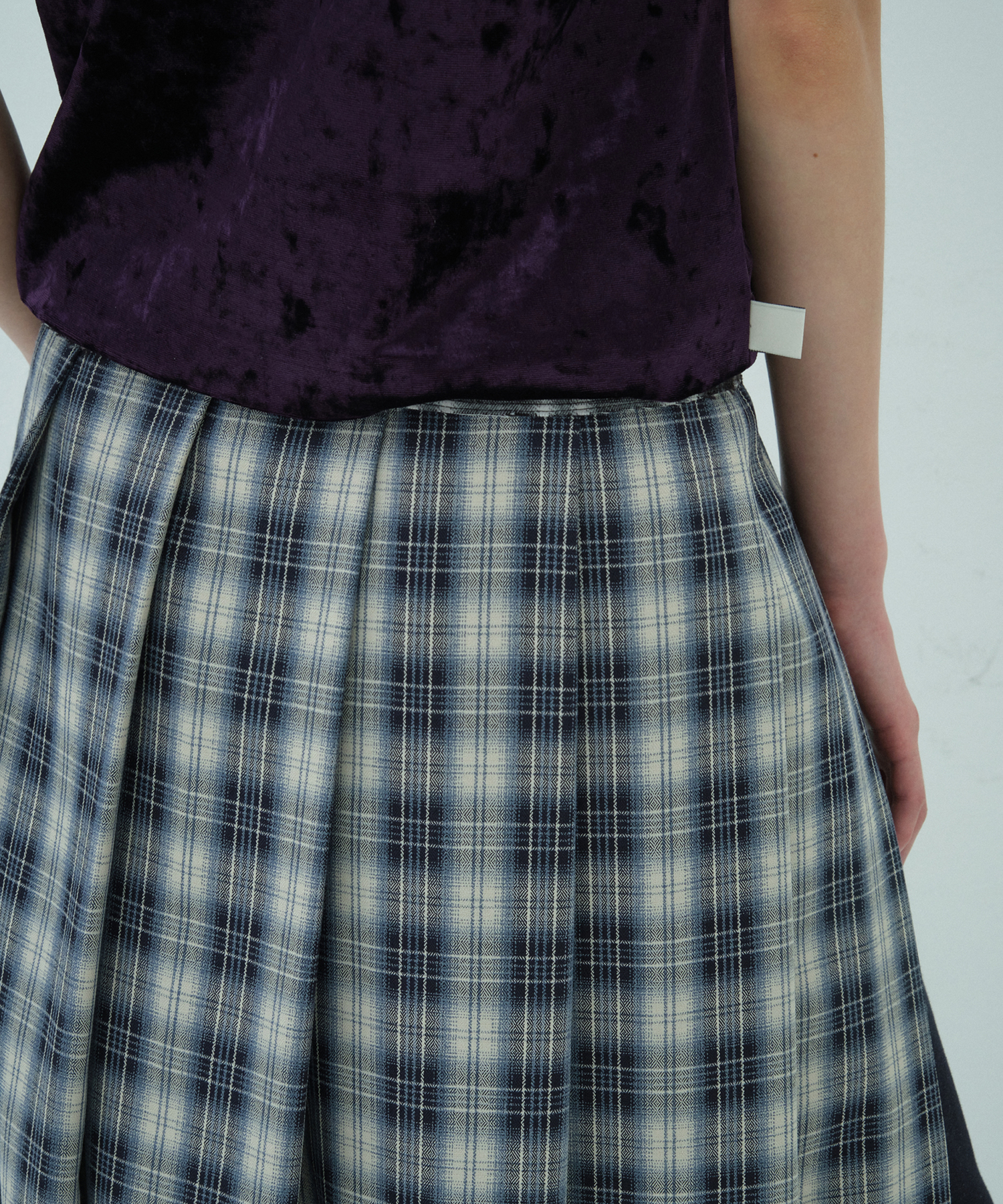 ウエスト部分にはブラックモノチェック、スカート部分にはネイビーベースチェックと、それぞれ異なる素材を組み合わせ、ヴィンテージでカジュアルなムードにデザインしました。