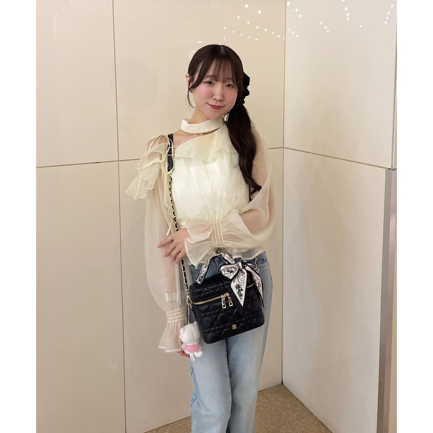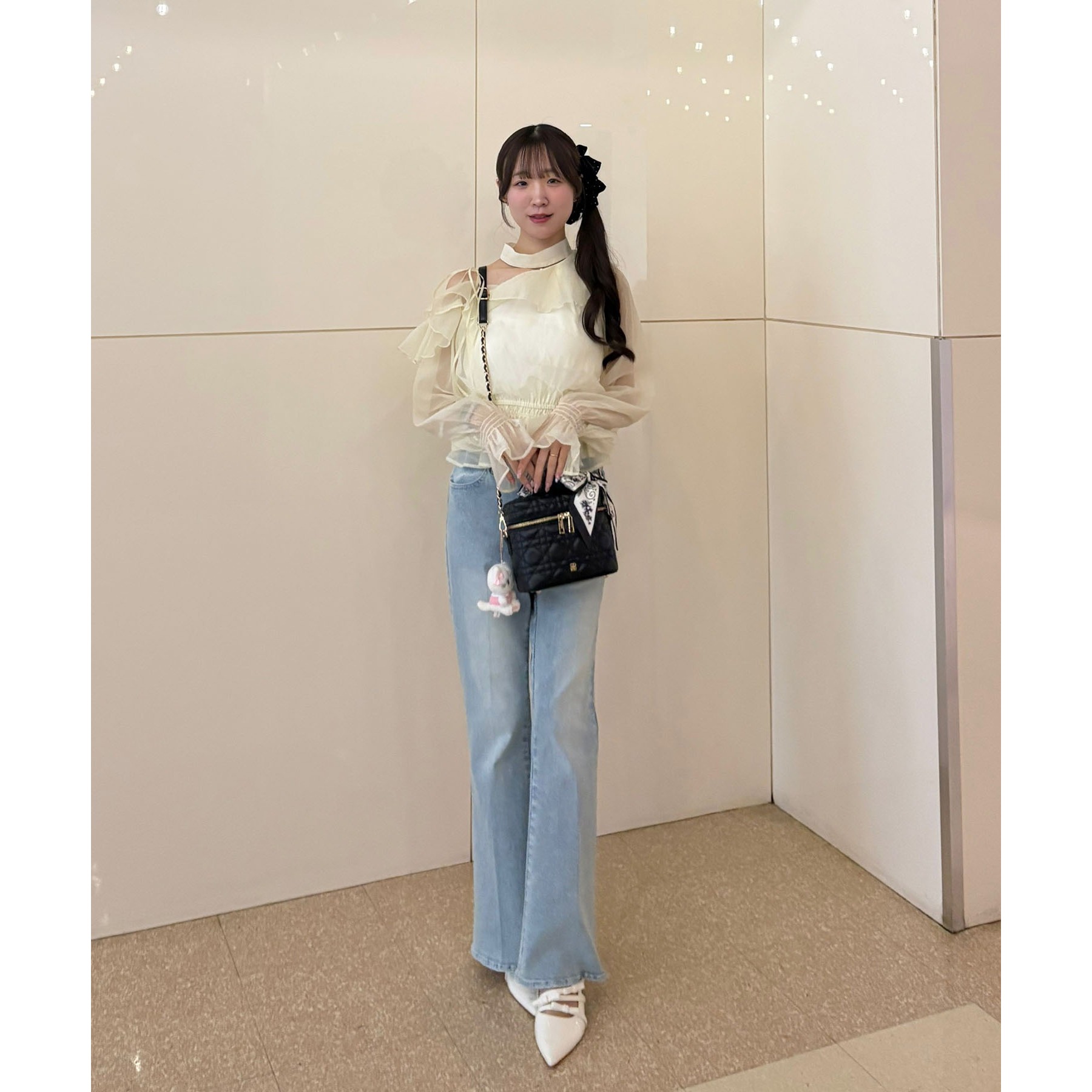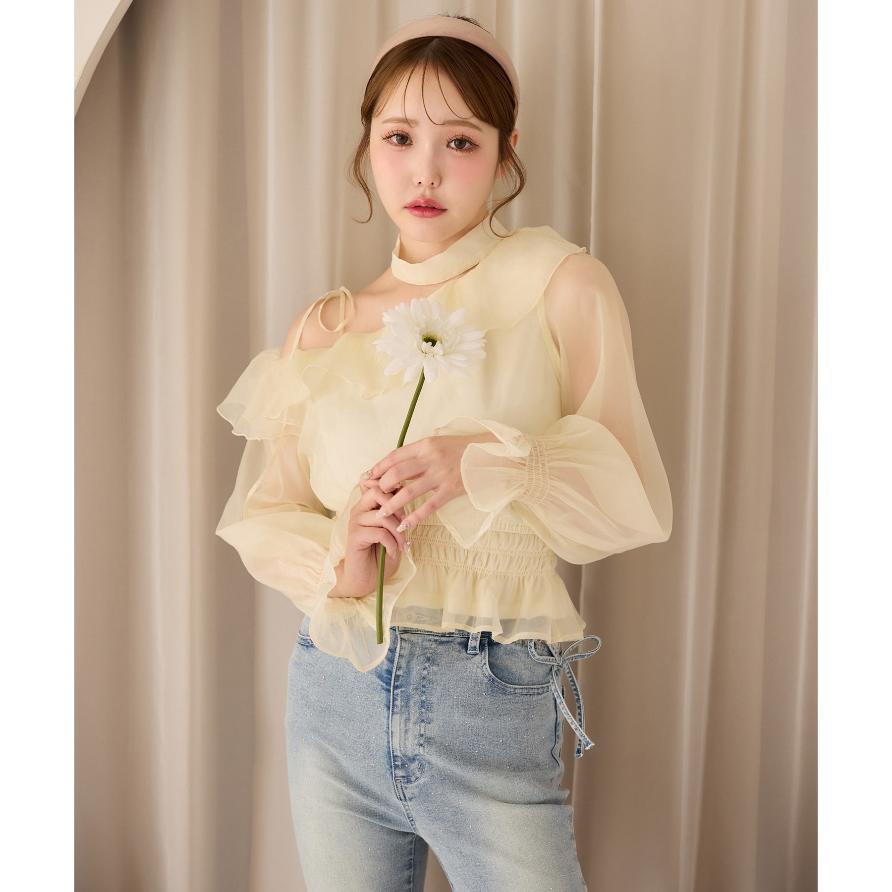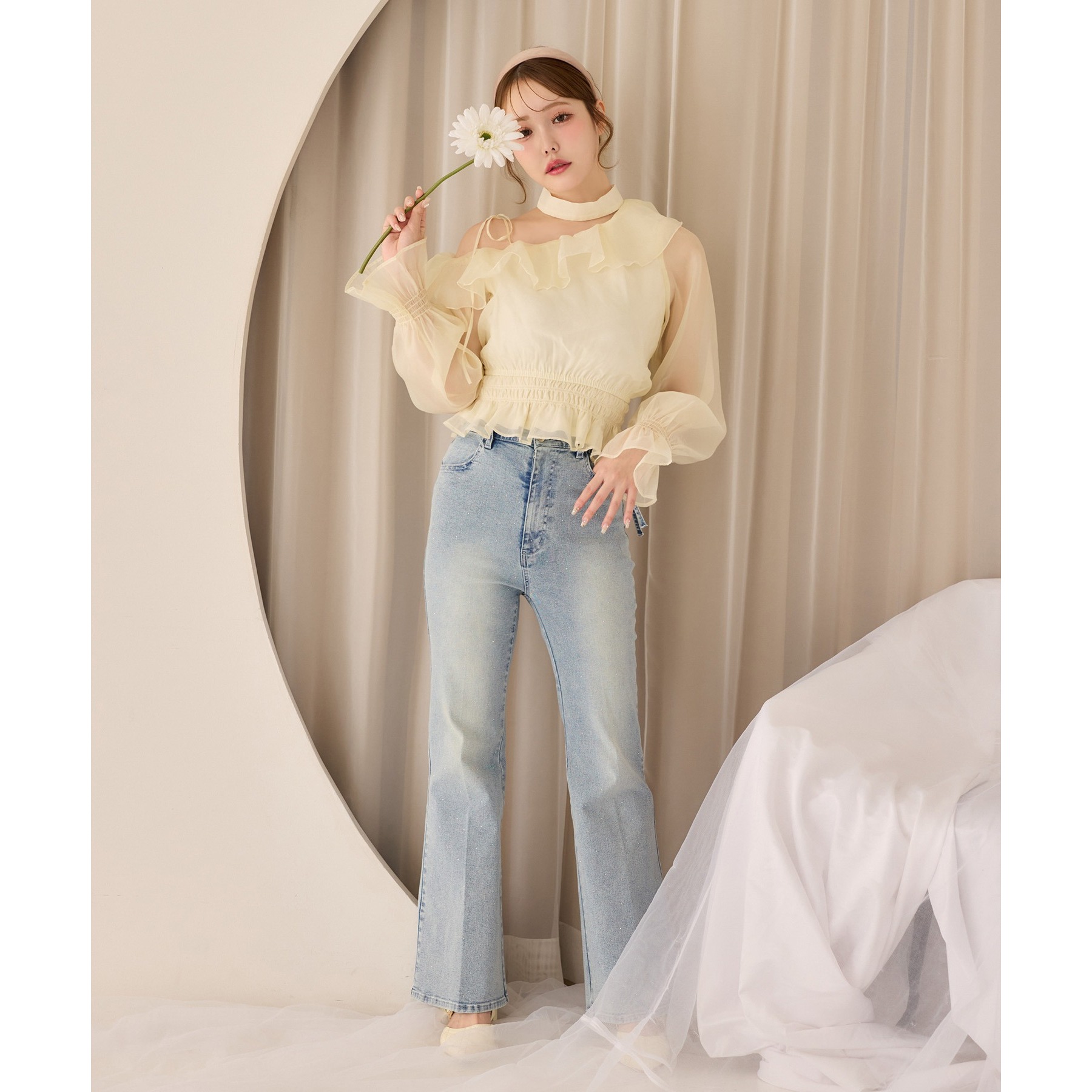 デニムパンツを合わせれば韓国風トレンドスタイルが完成します。
