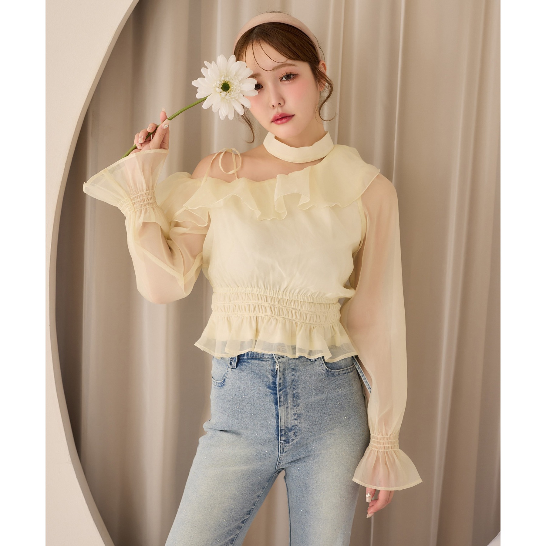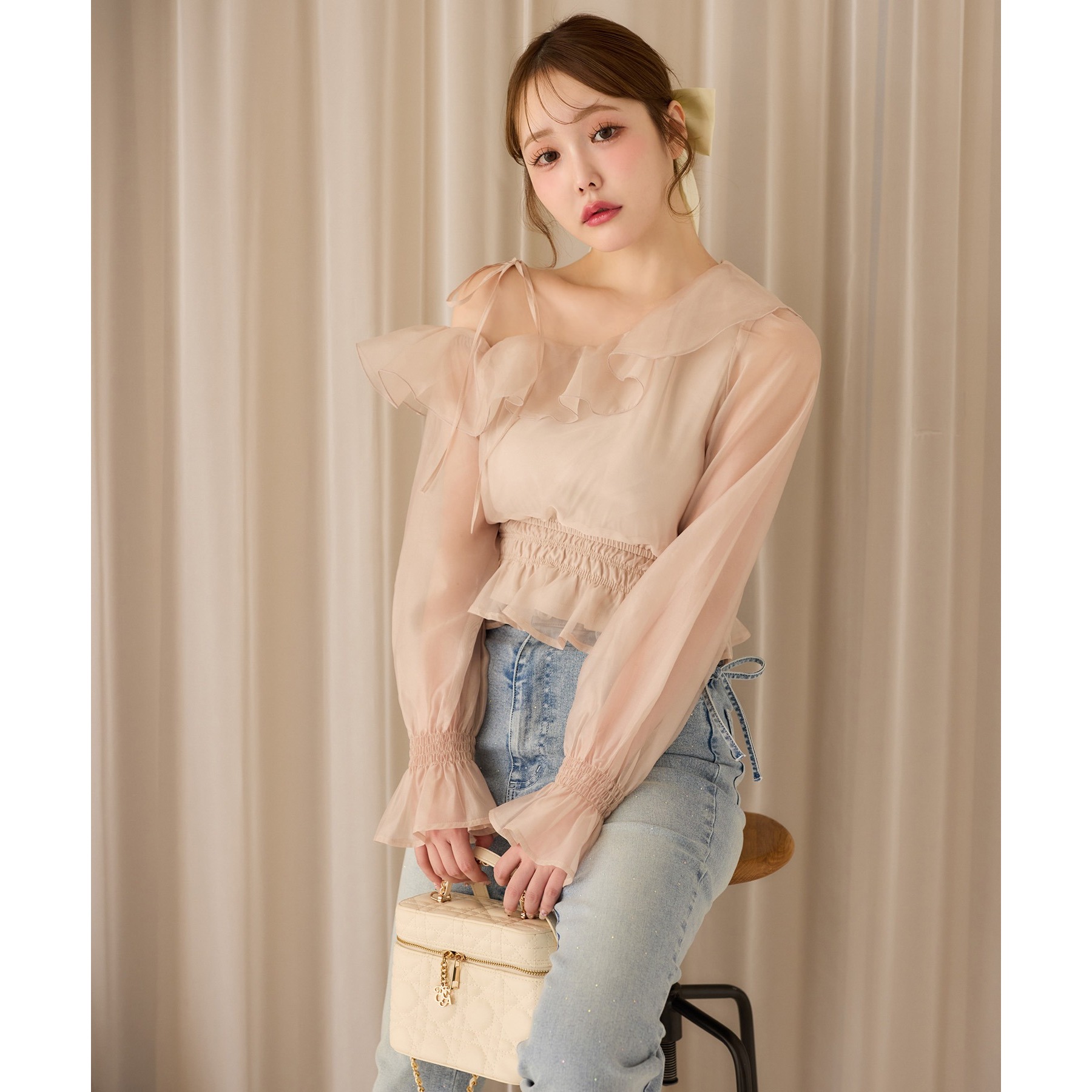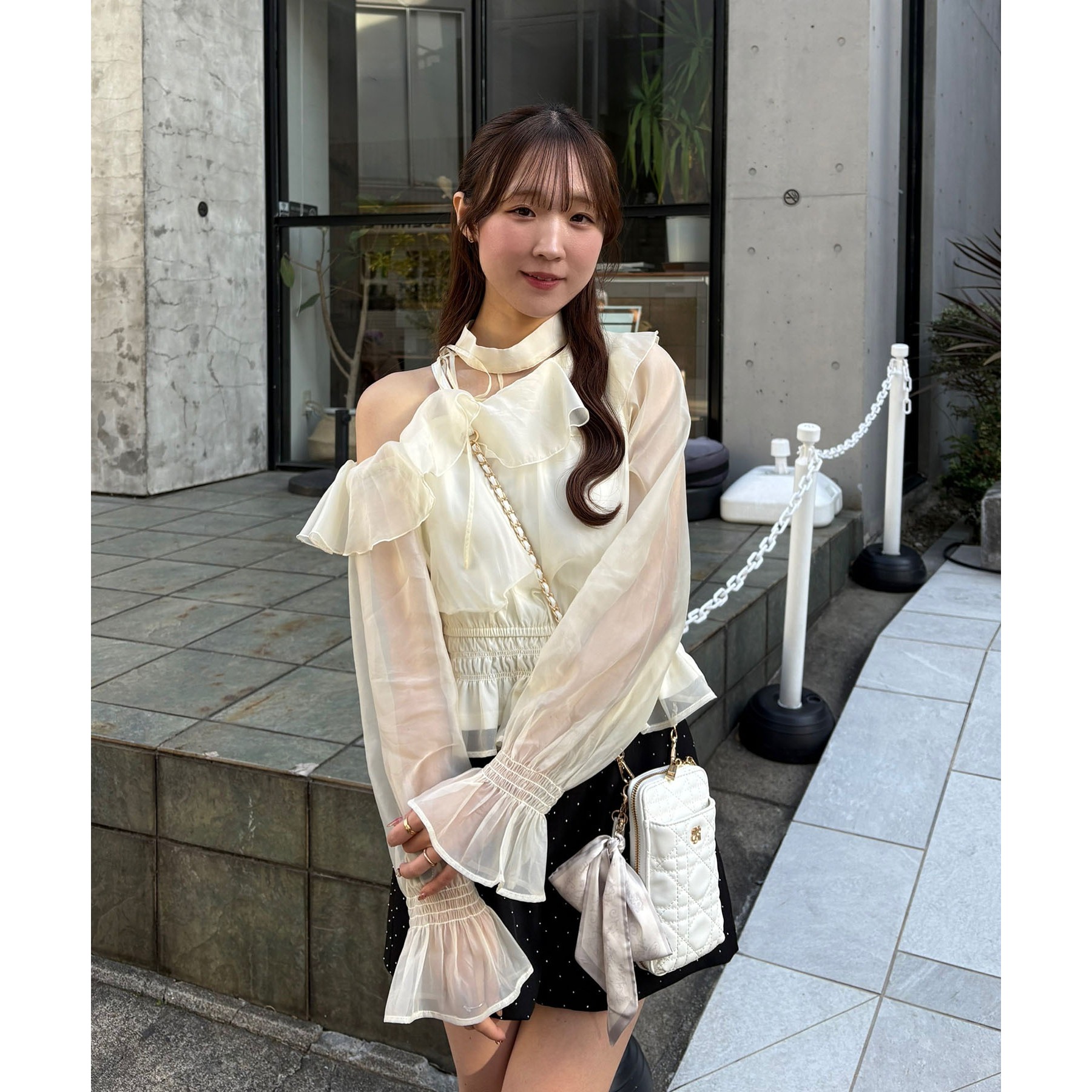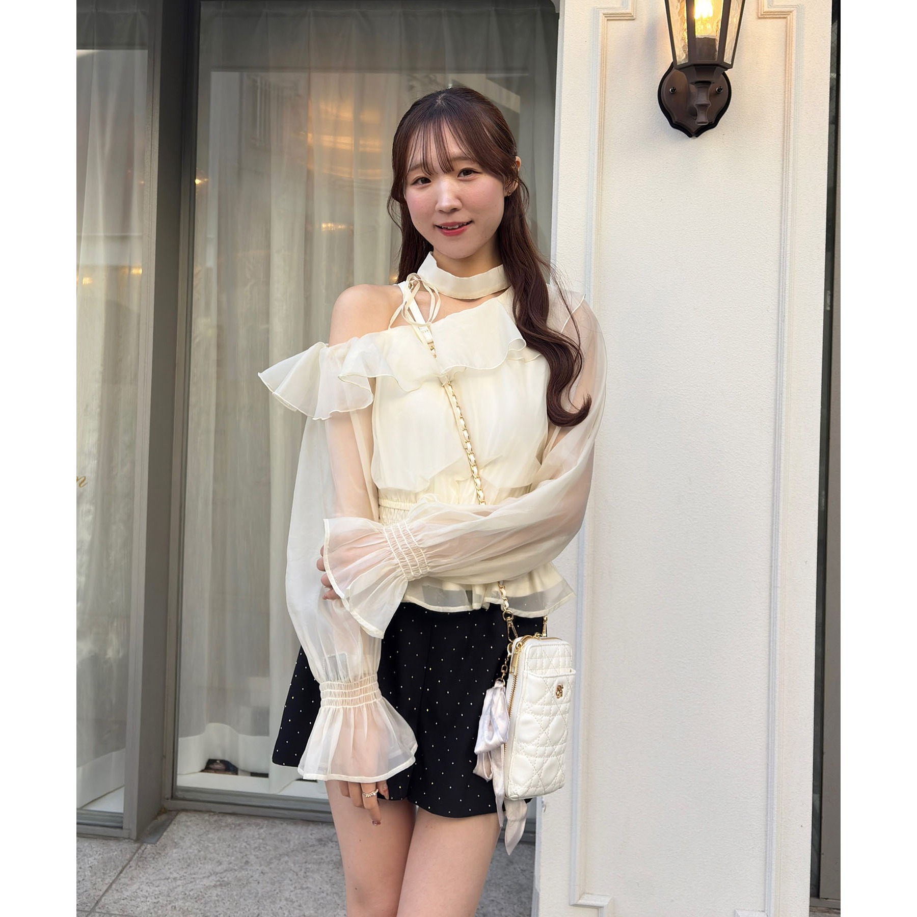 可愛らしさとフェミニンな印象を与えるワンショルブブラウス。