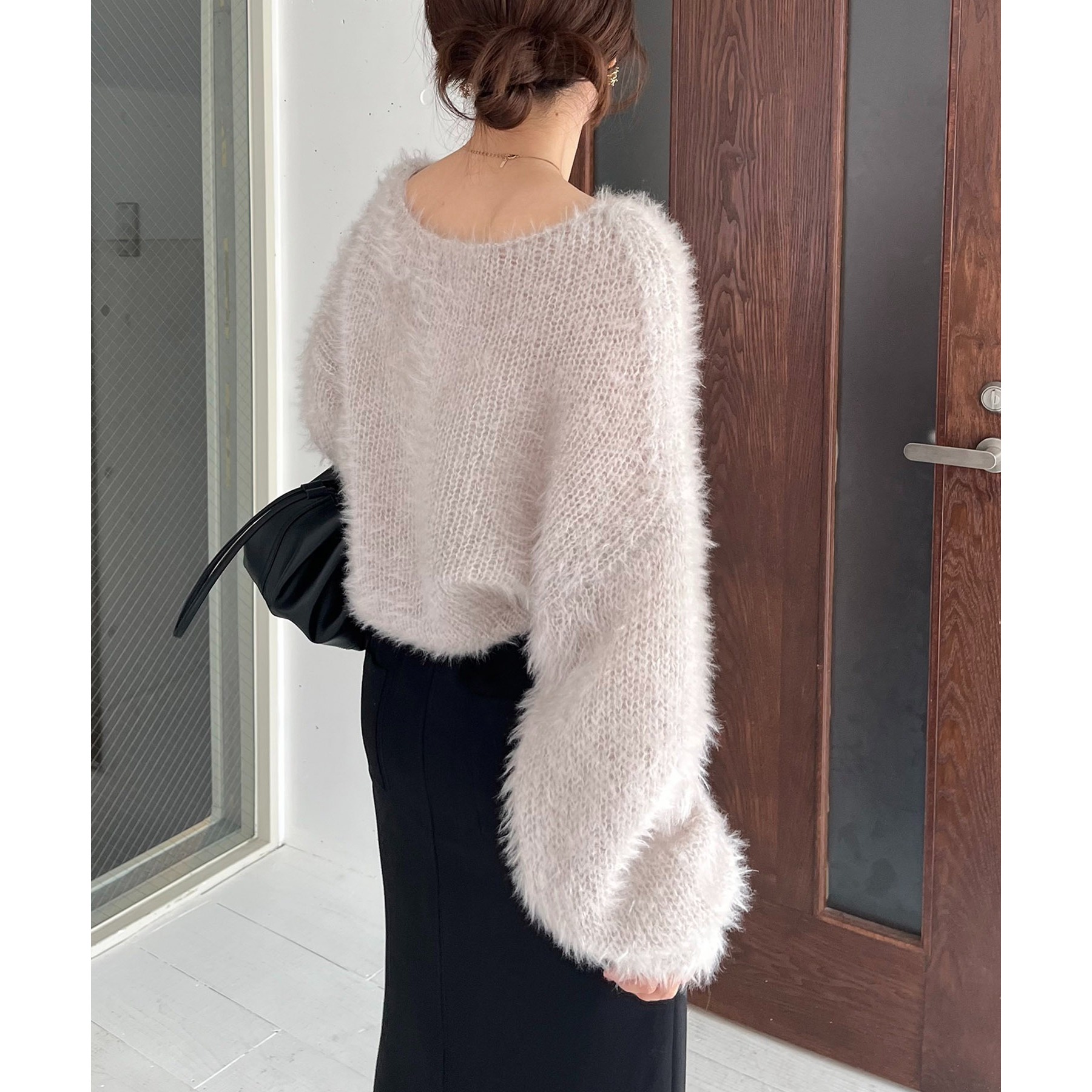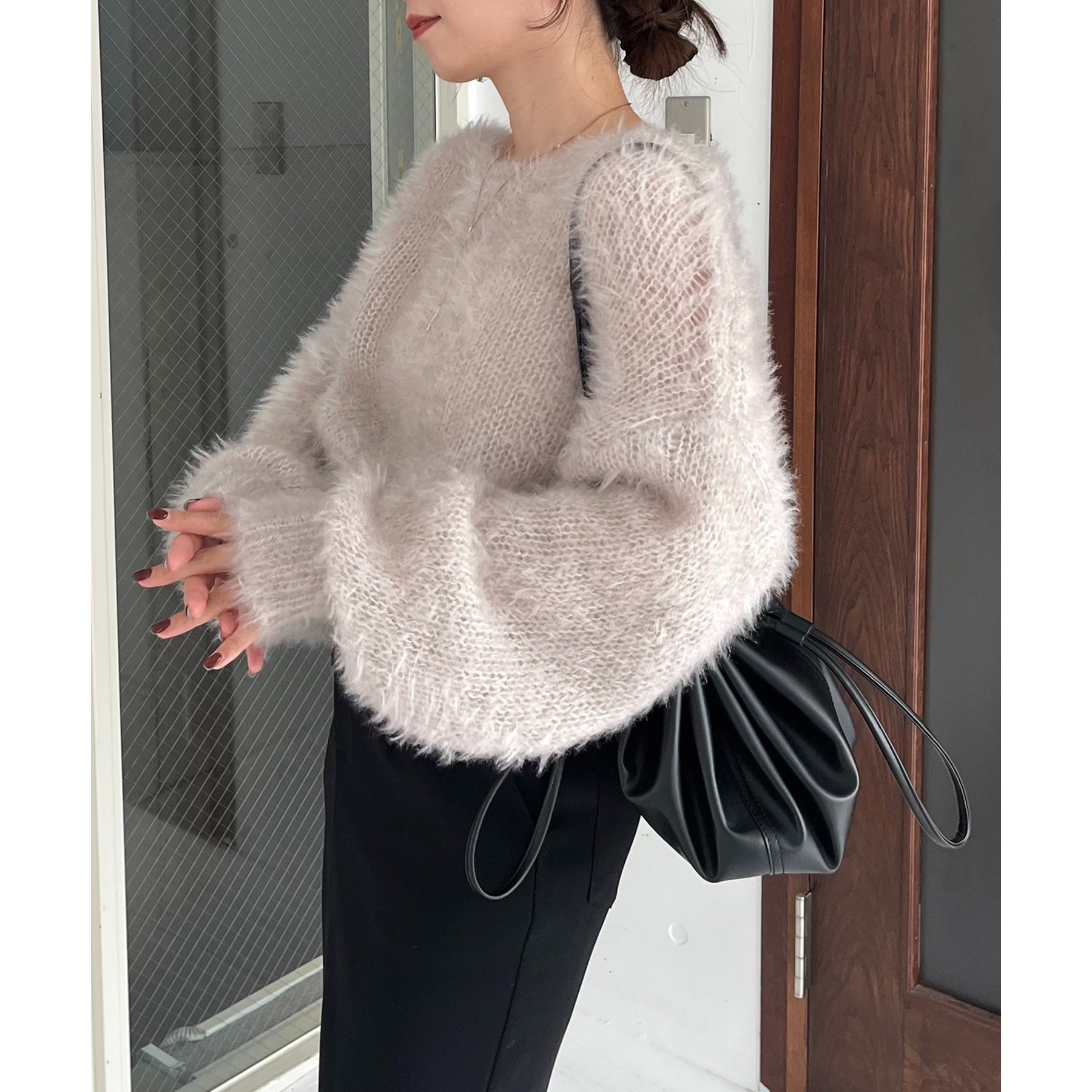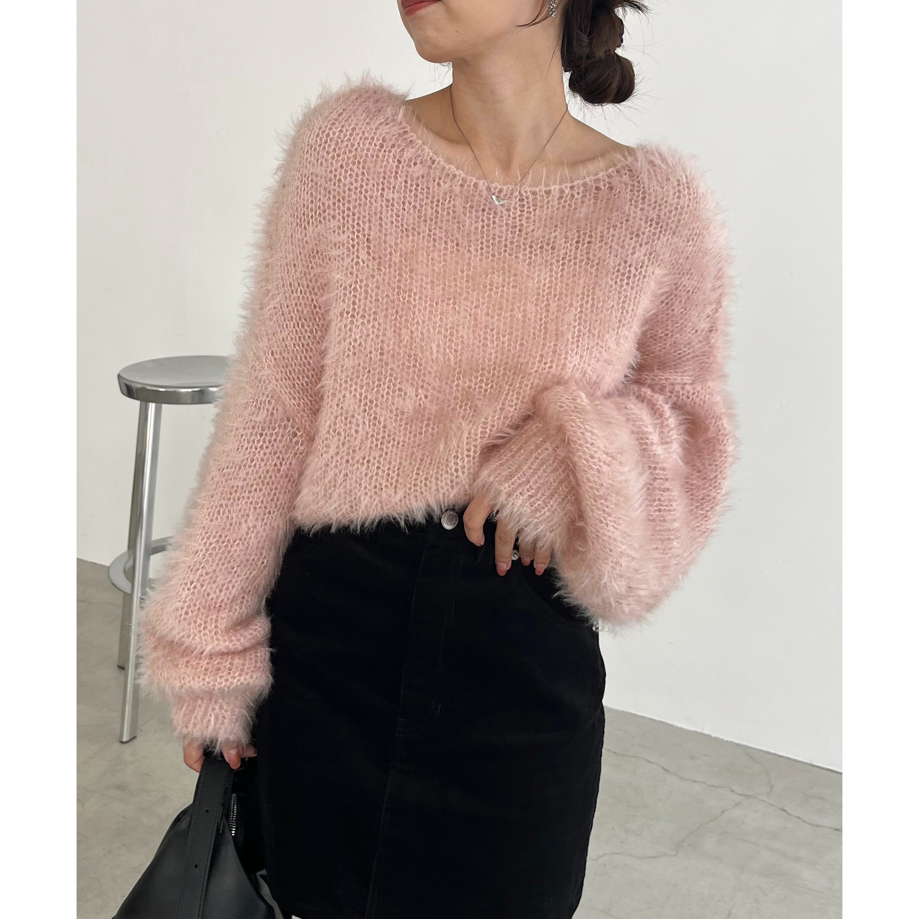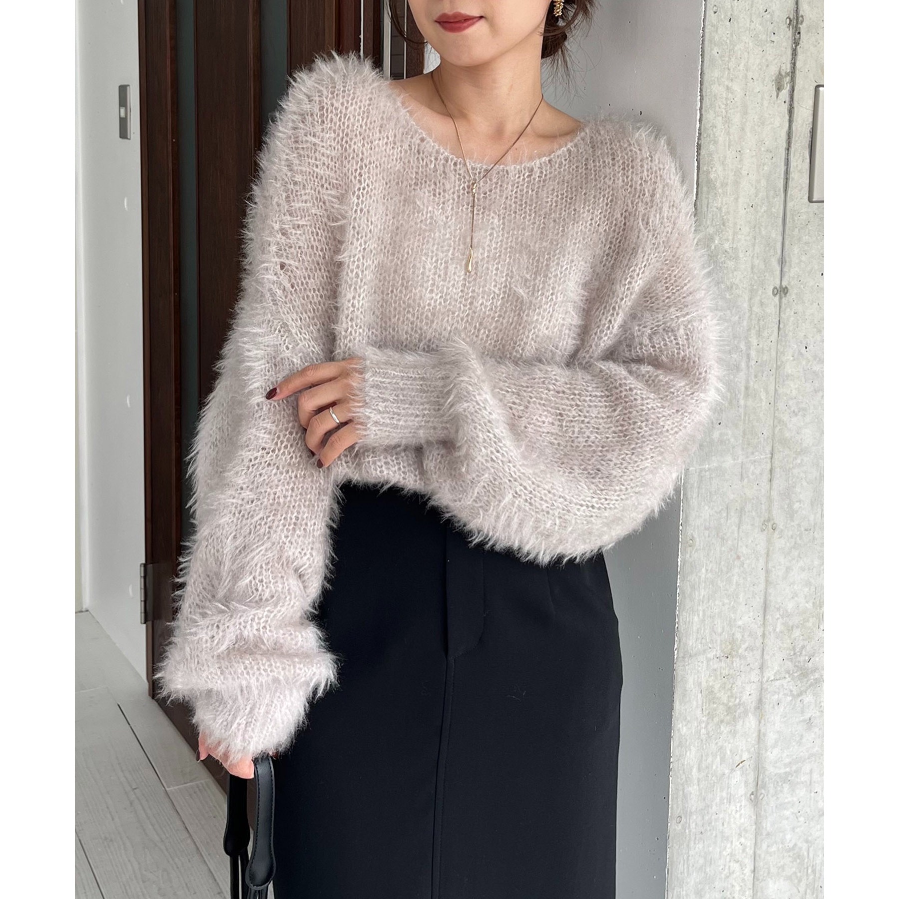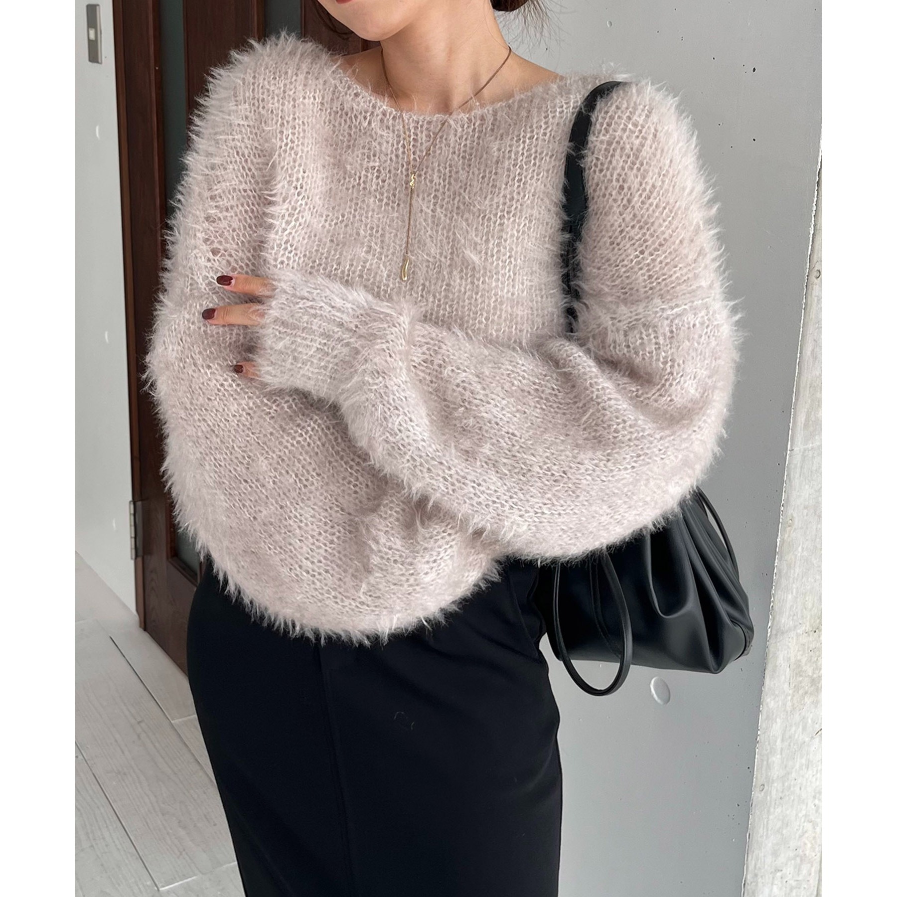 毛足の長いフェザーとゆるいシルエットが女性らしさをプラス