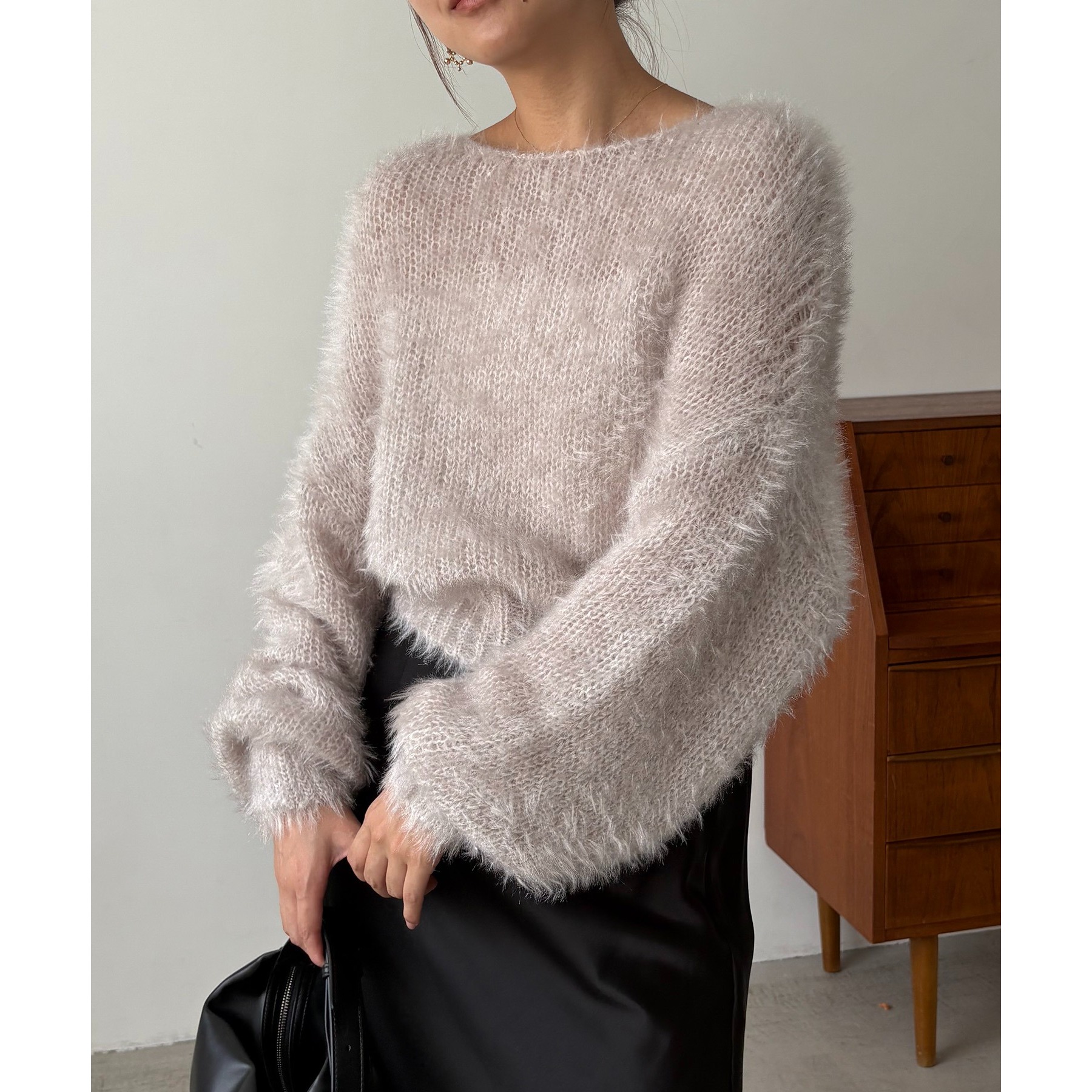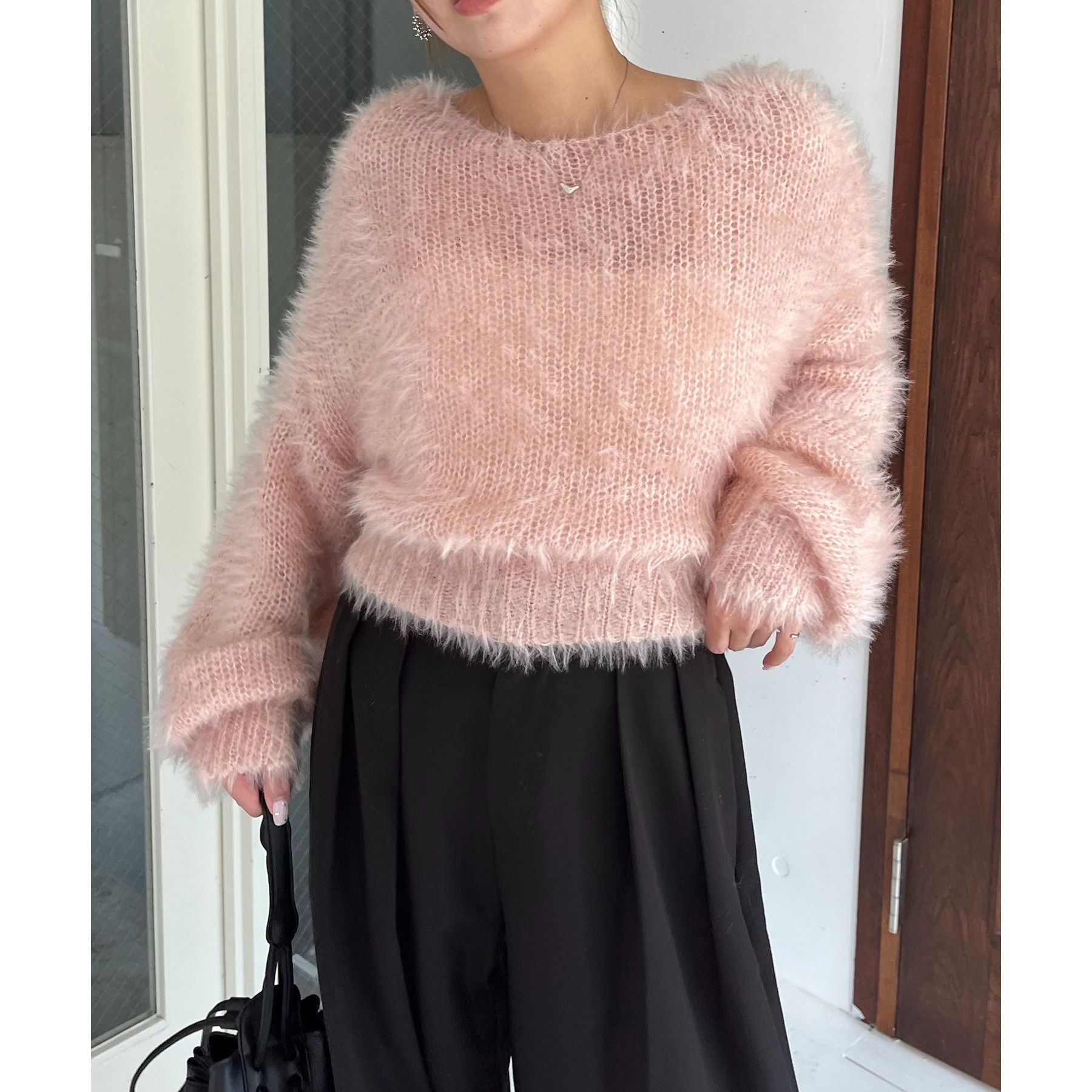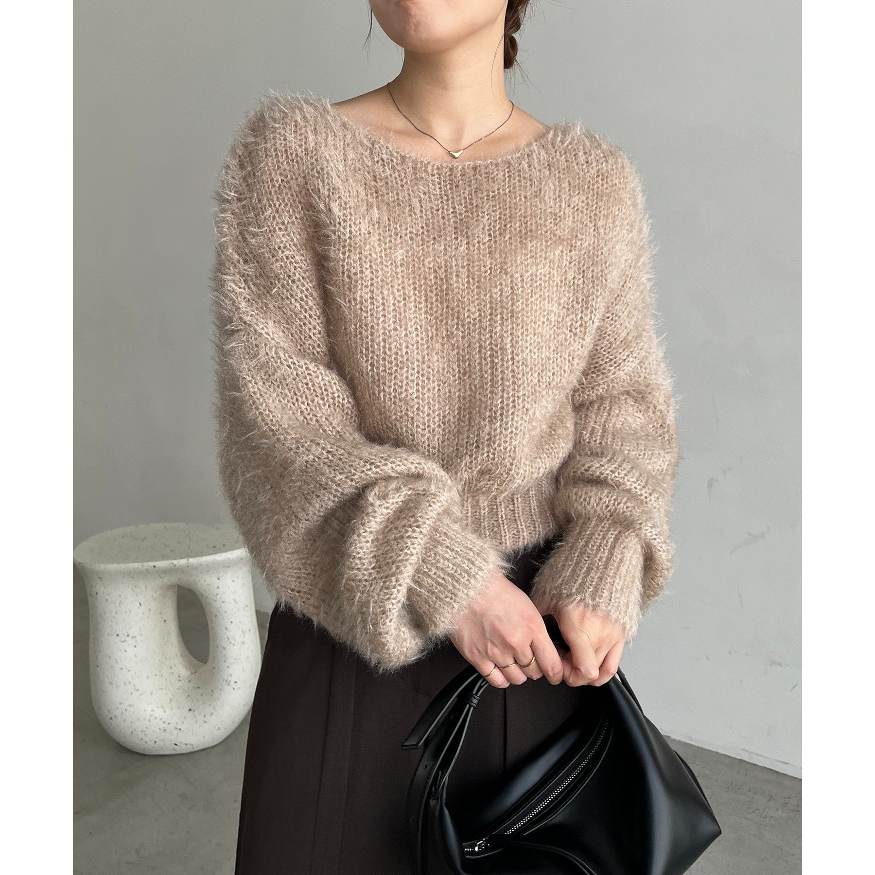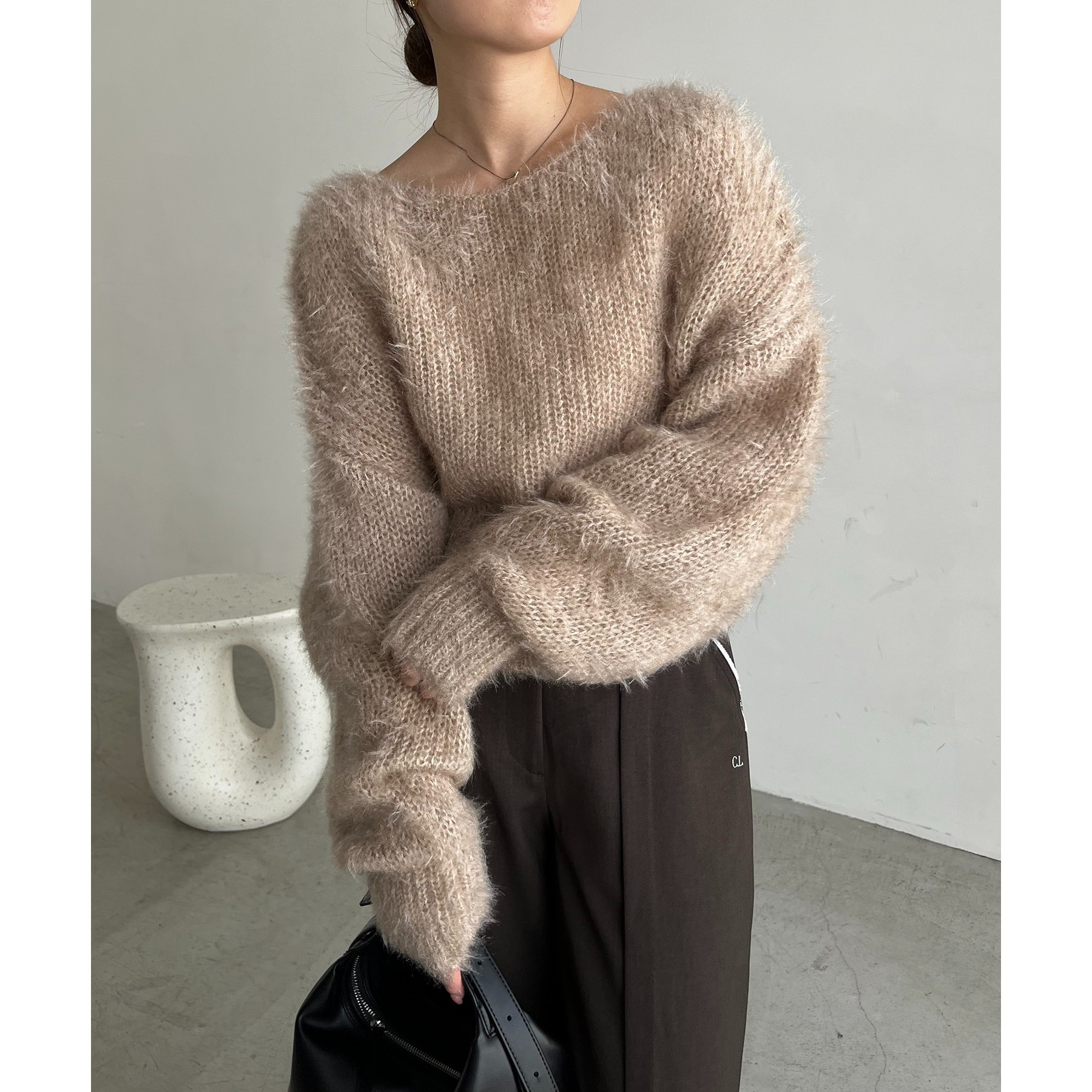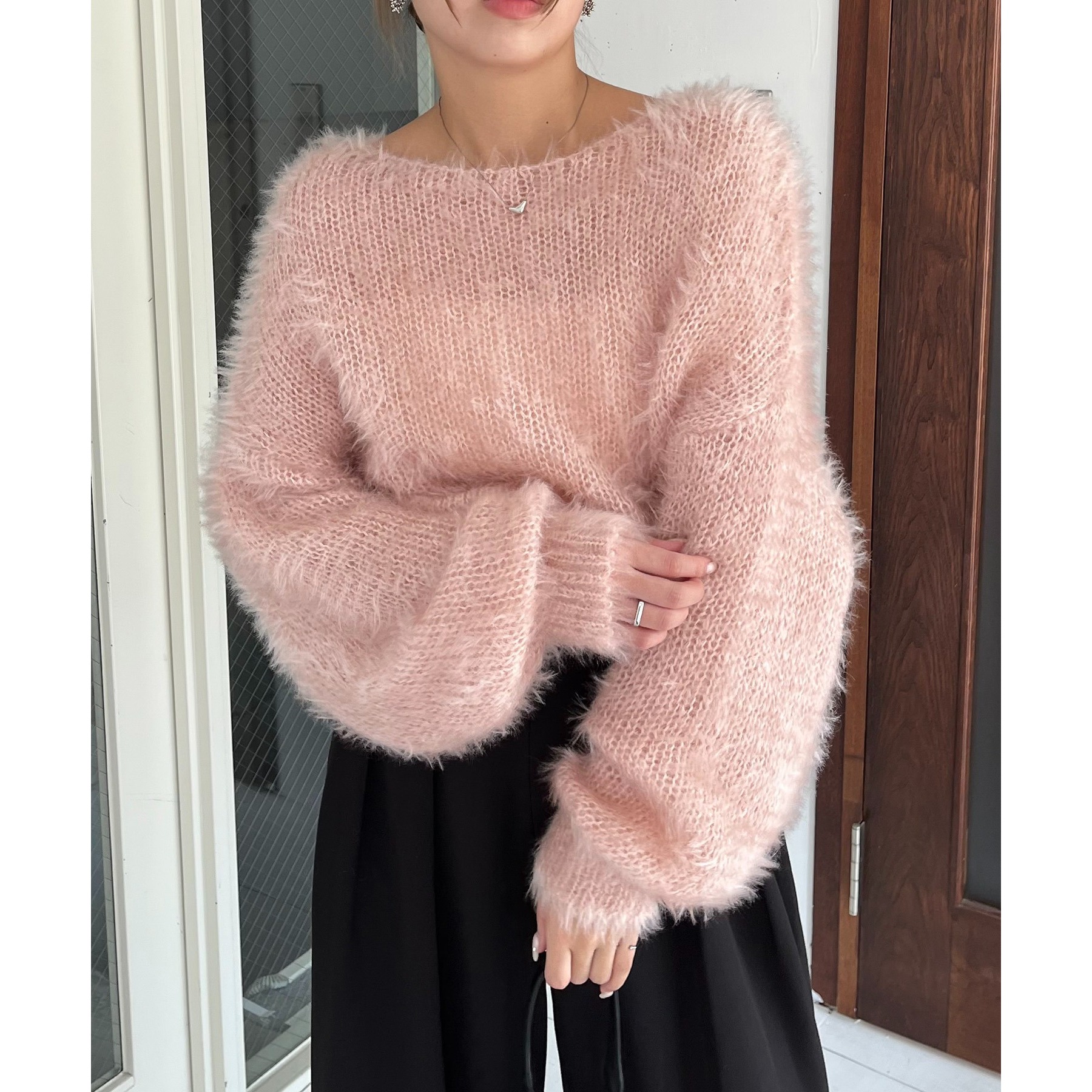毛足の長いフェザーとゆるいシルエットが女性らしさをプラス