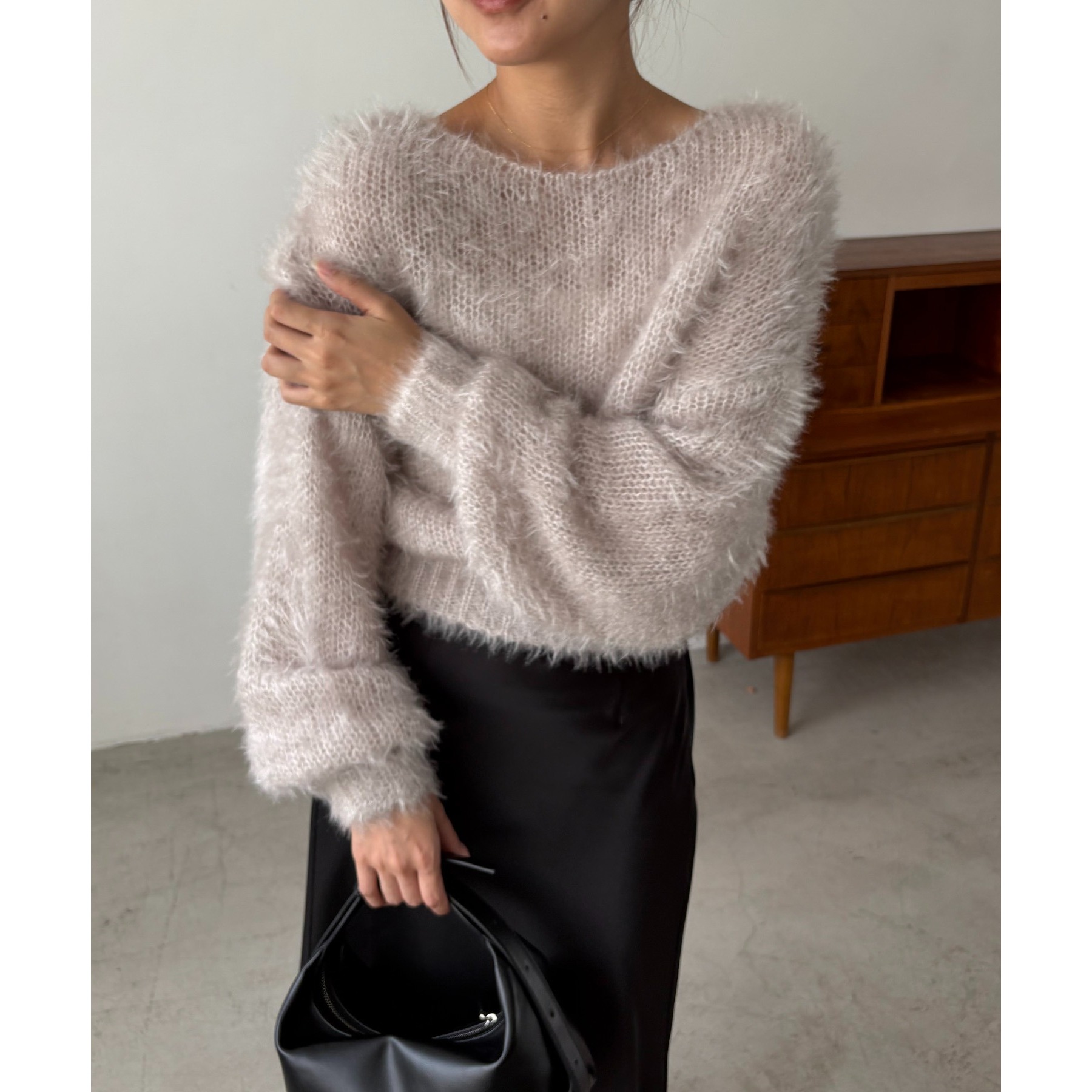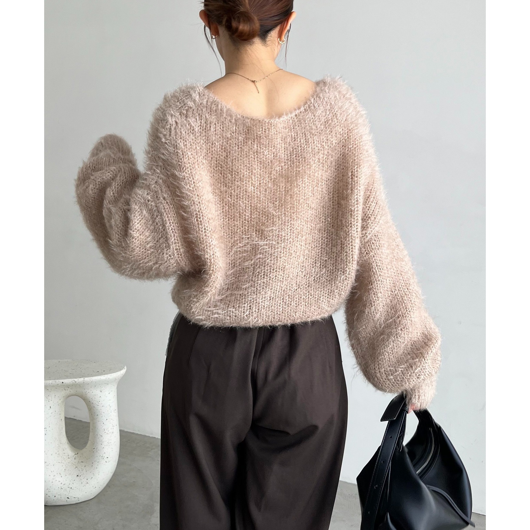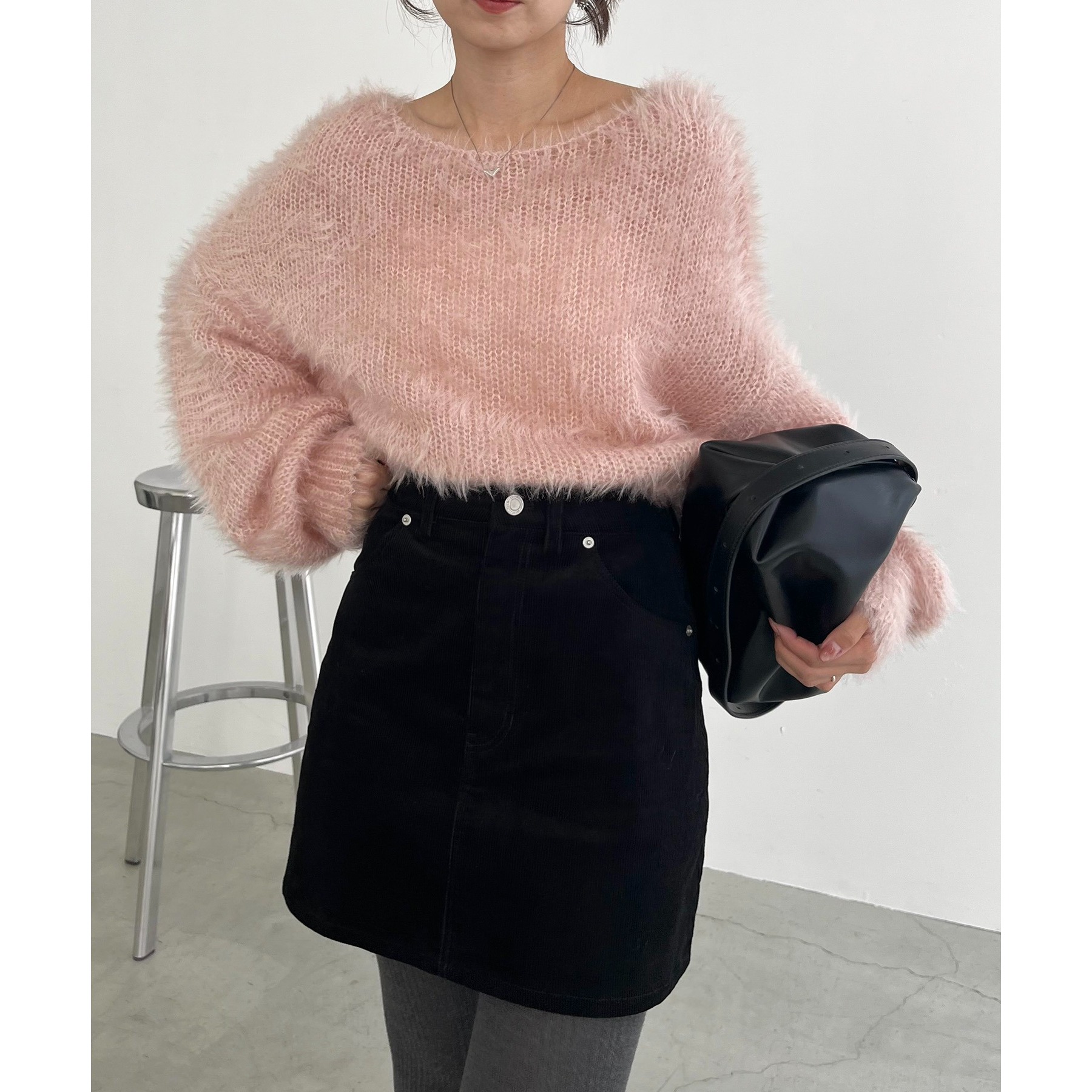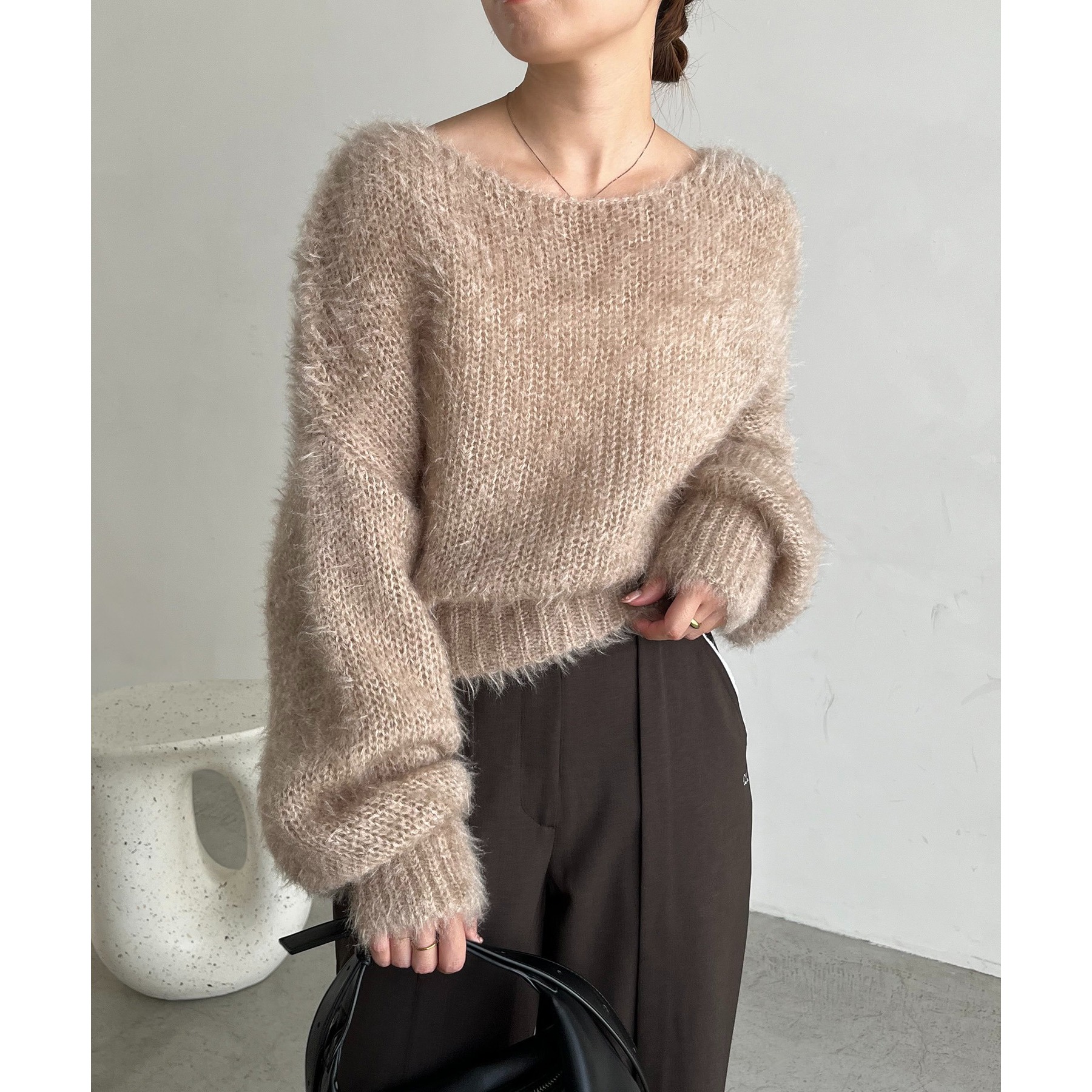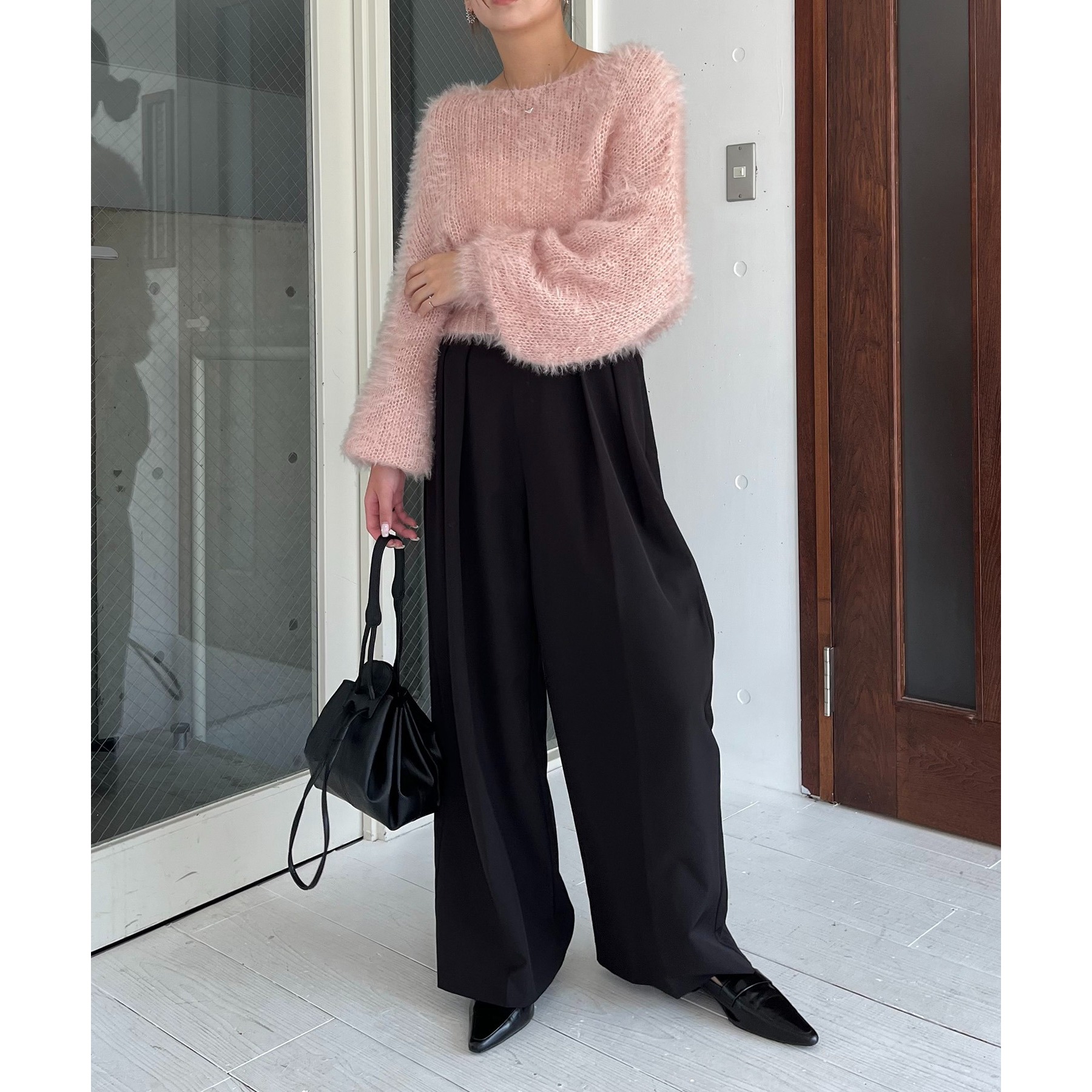 毛足の長いフェザーとゆるいシルエットが女性らしさをプラス
