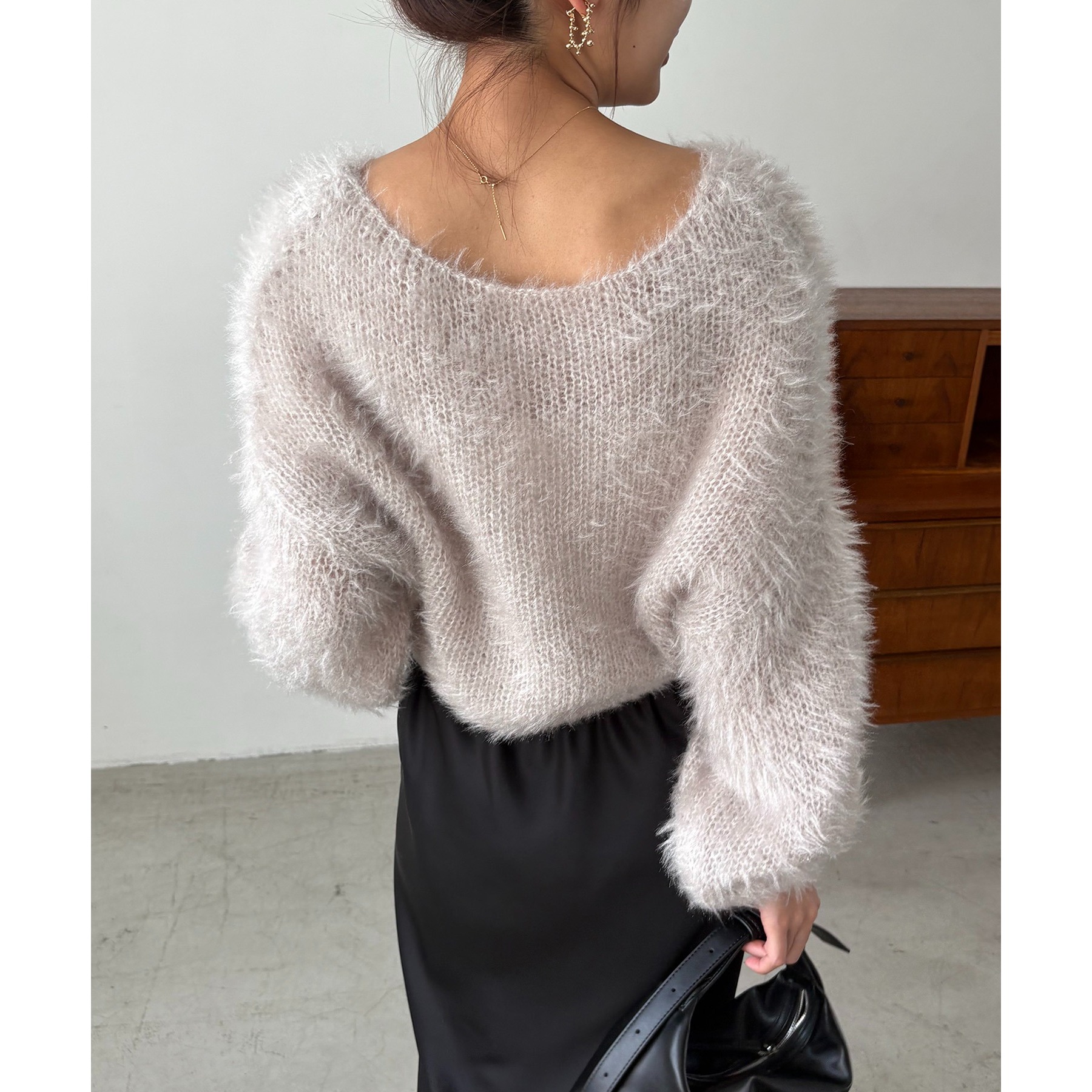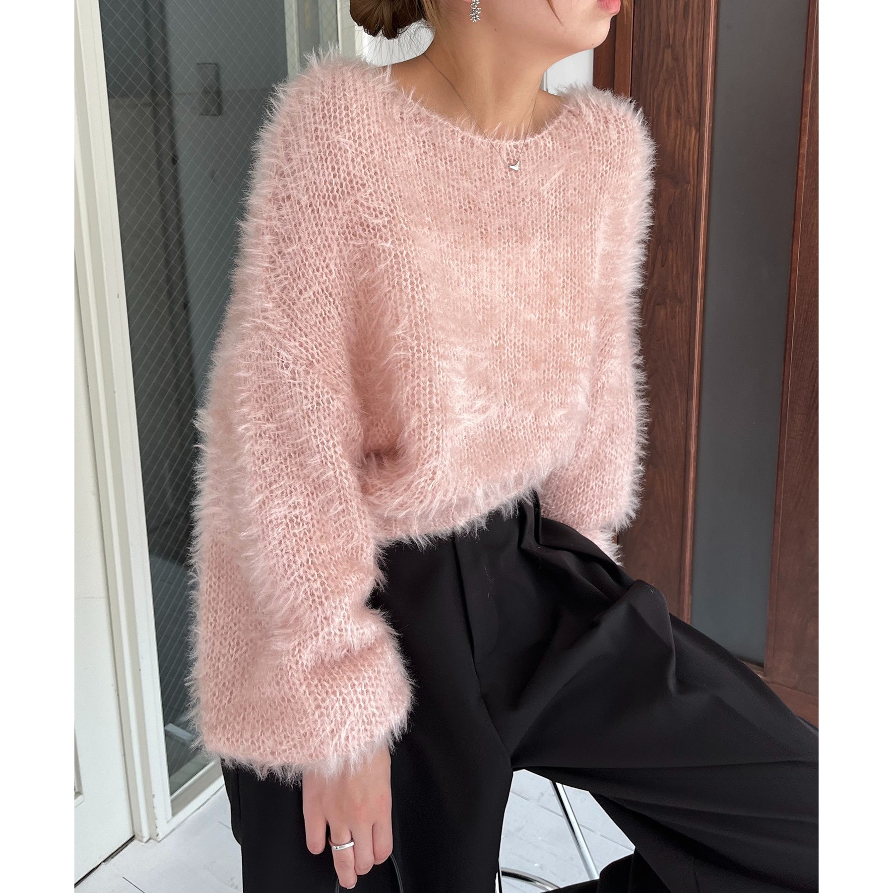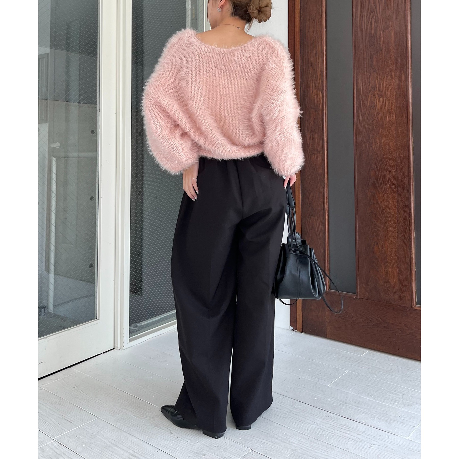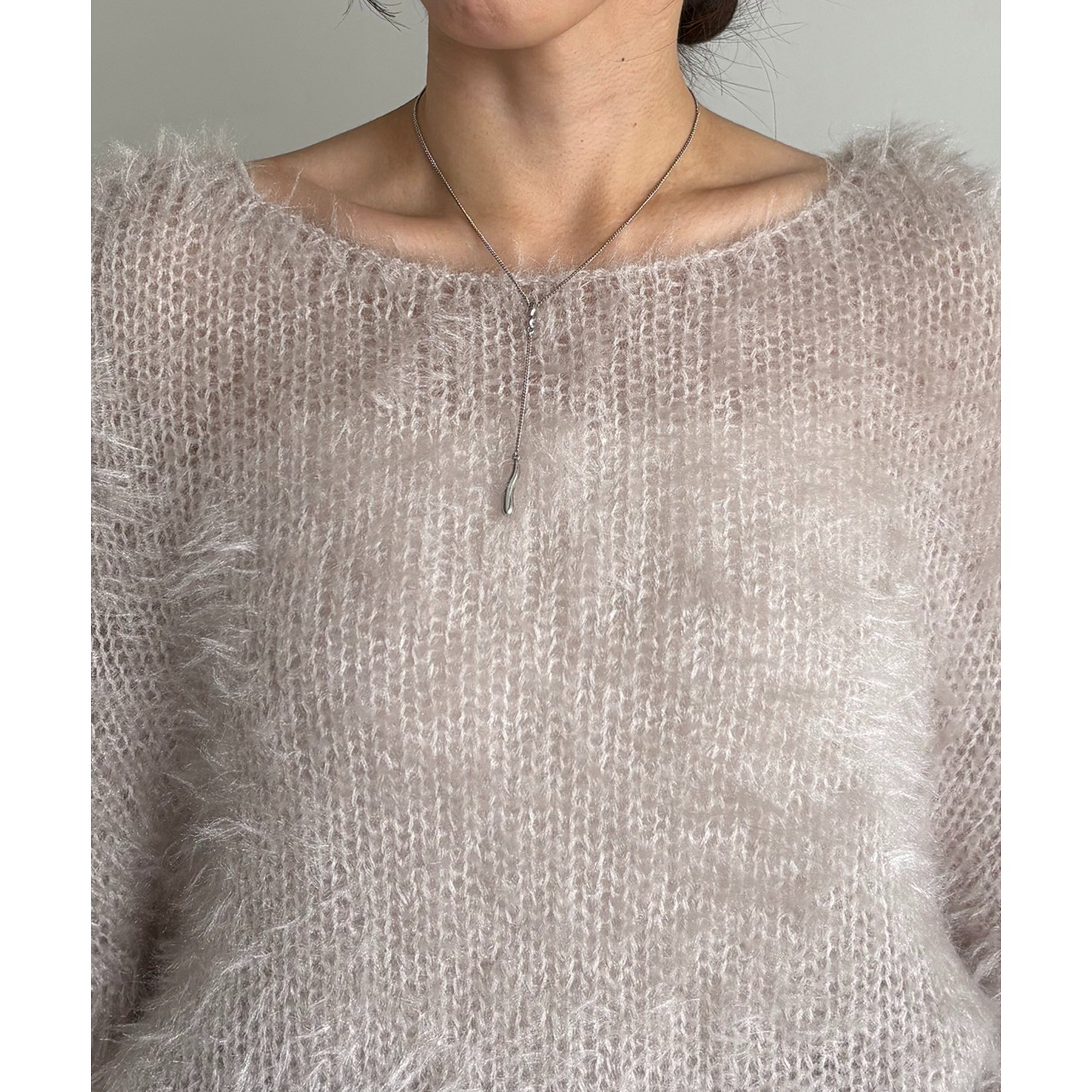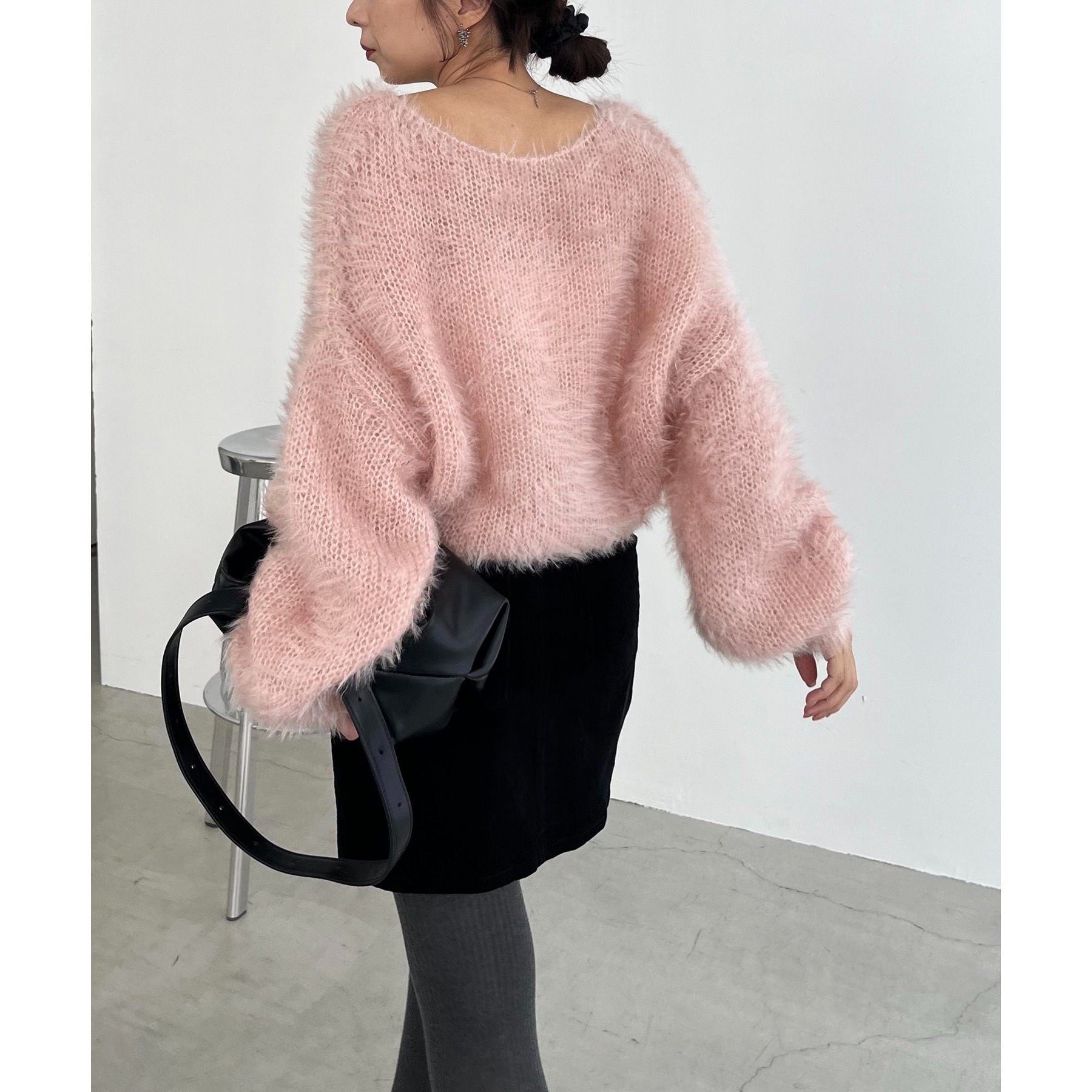 毛足の長いフェザーとゆるいシルエットが女性らしさをプラス