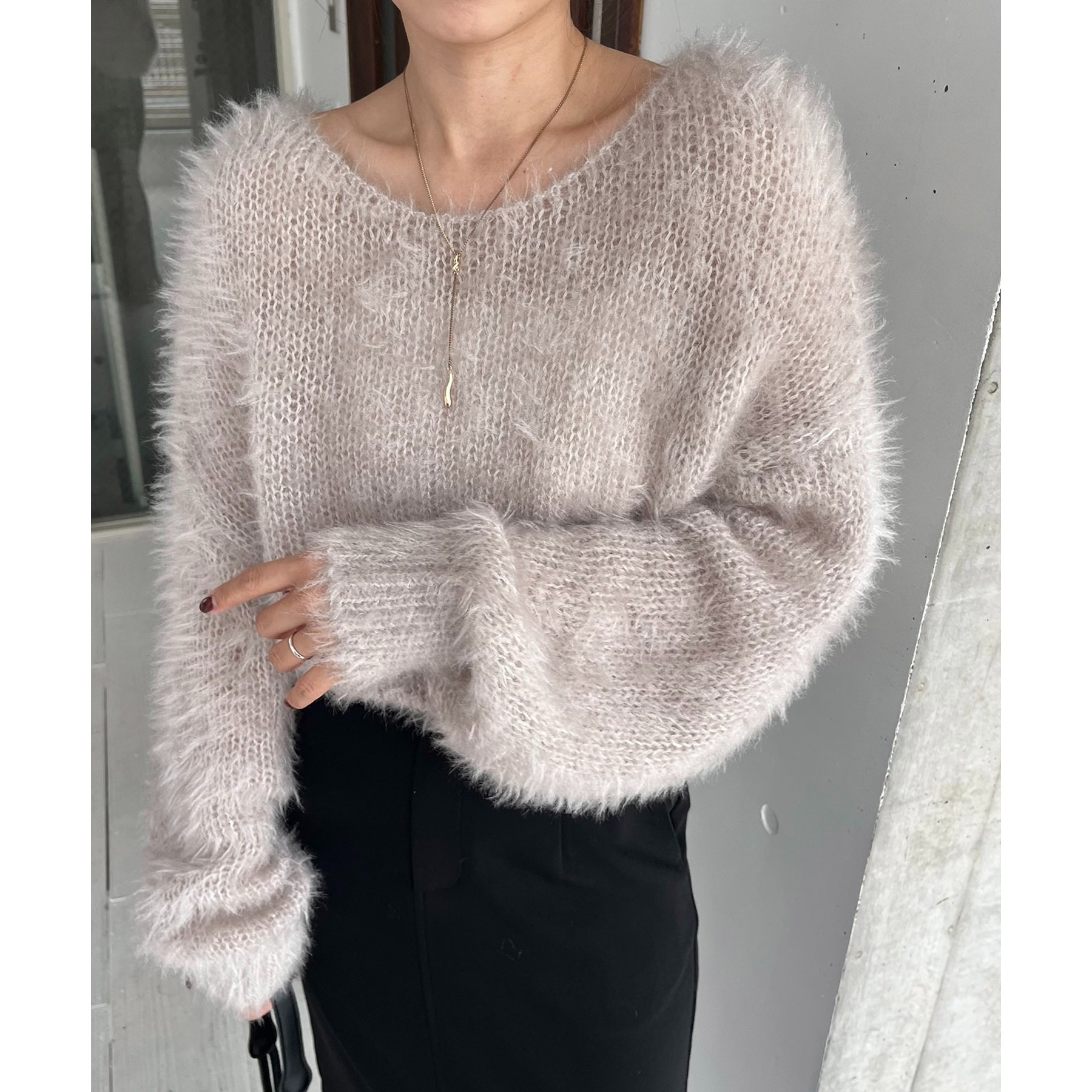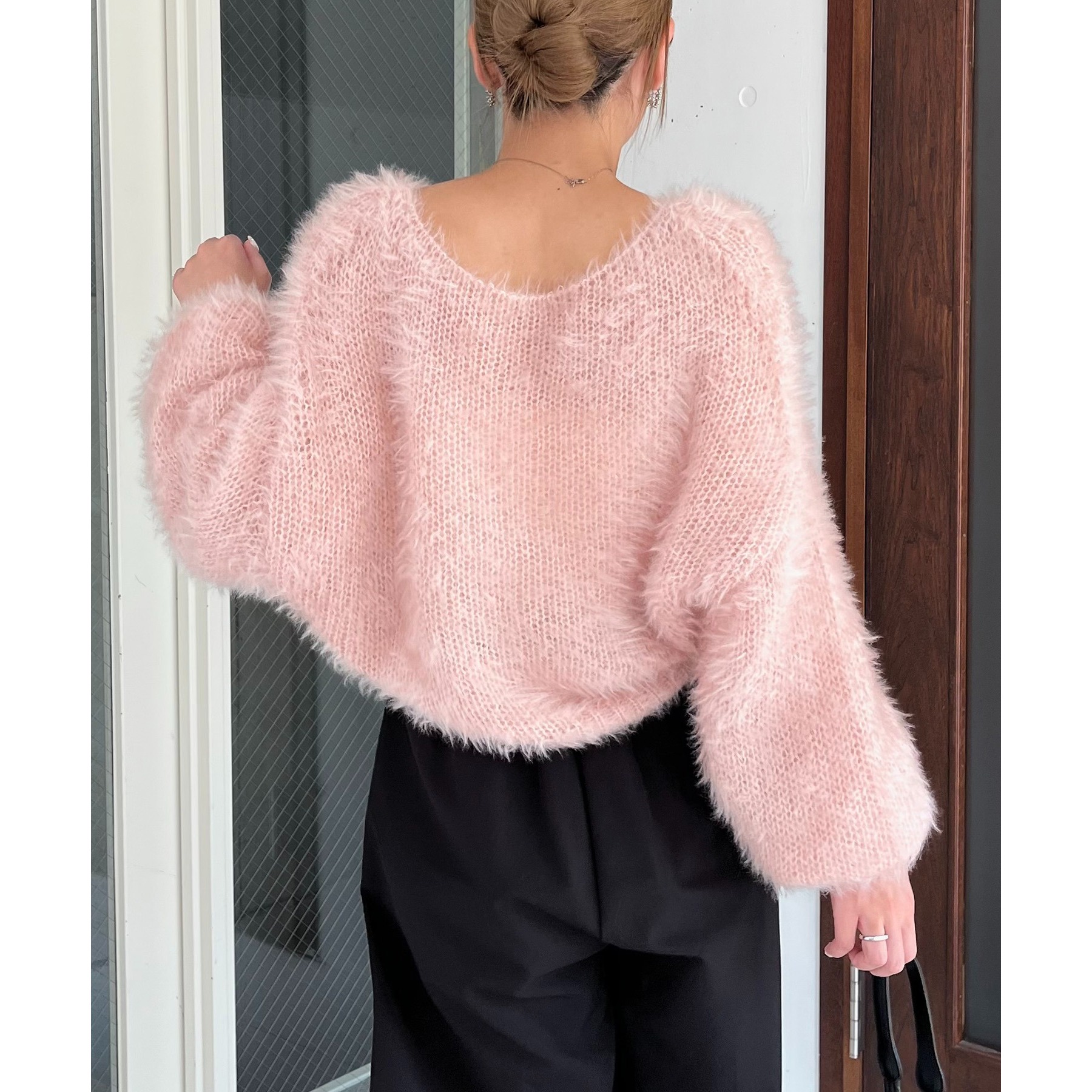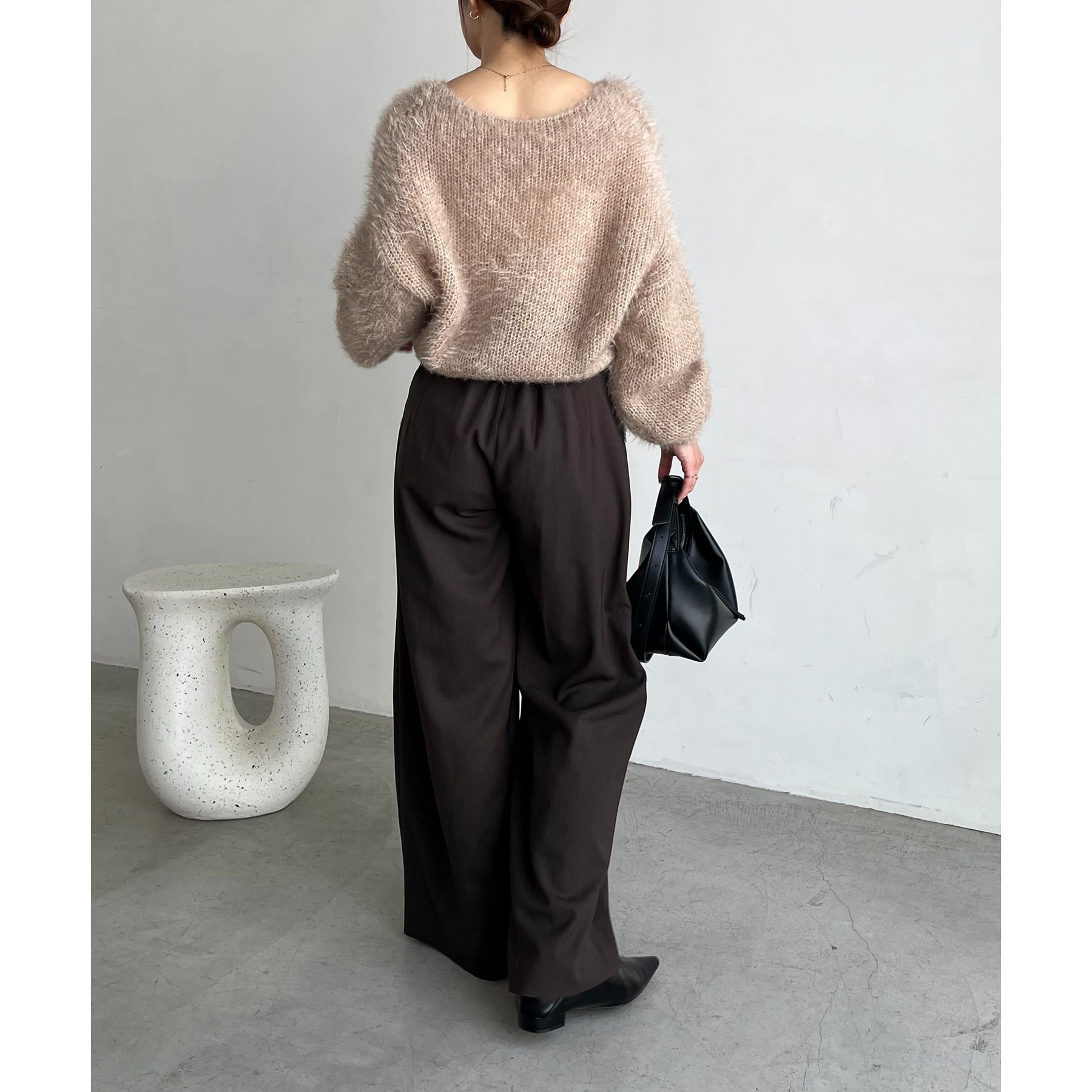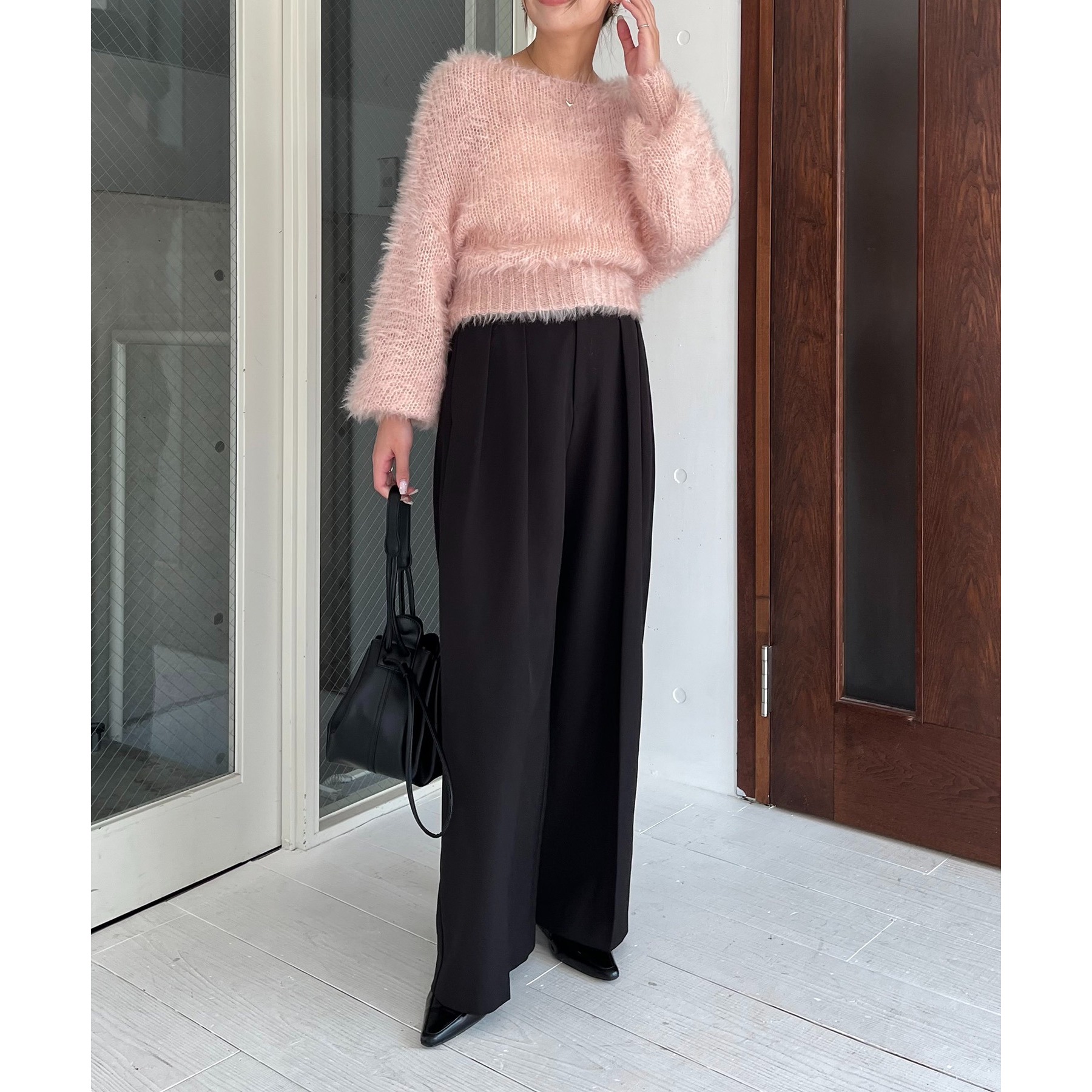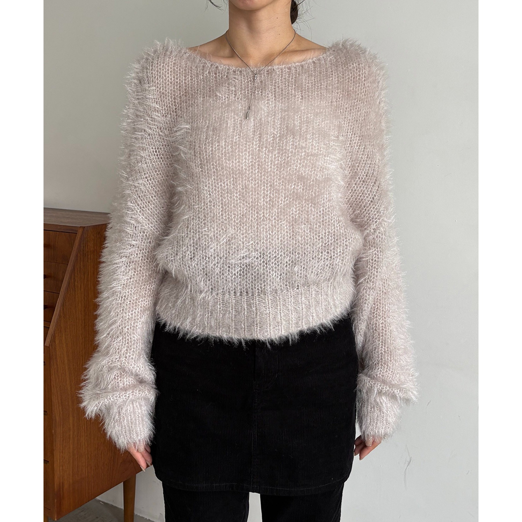 毛足の長いフェザーとゆるいシルエットが女性らしさをプラス