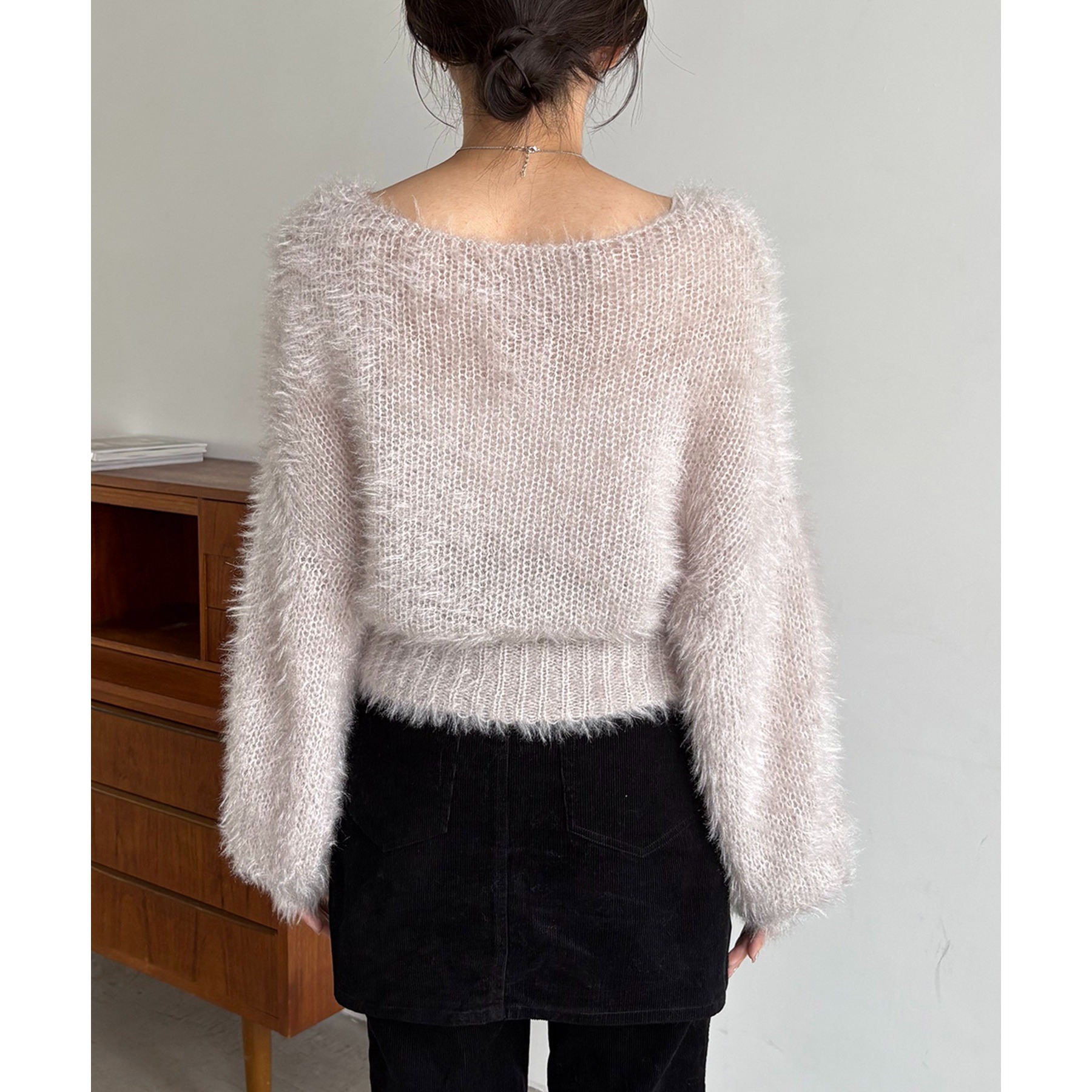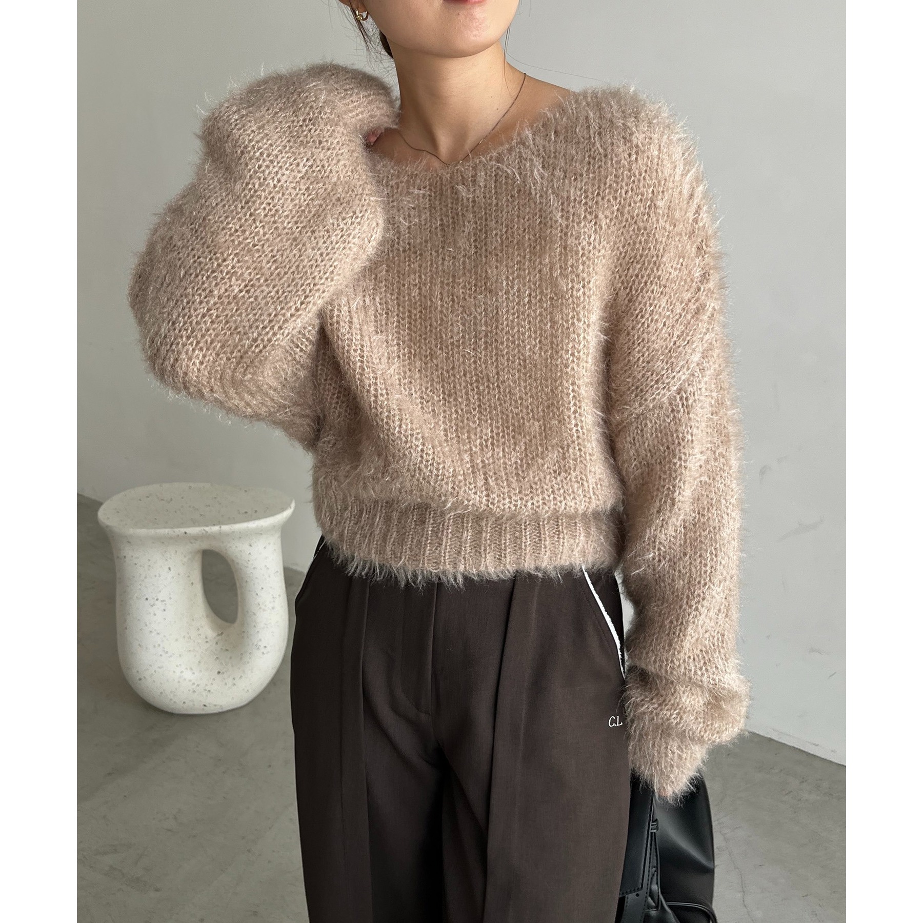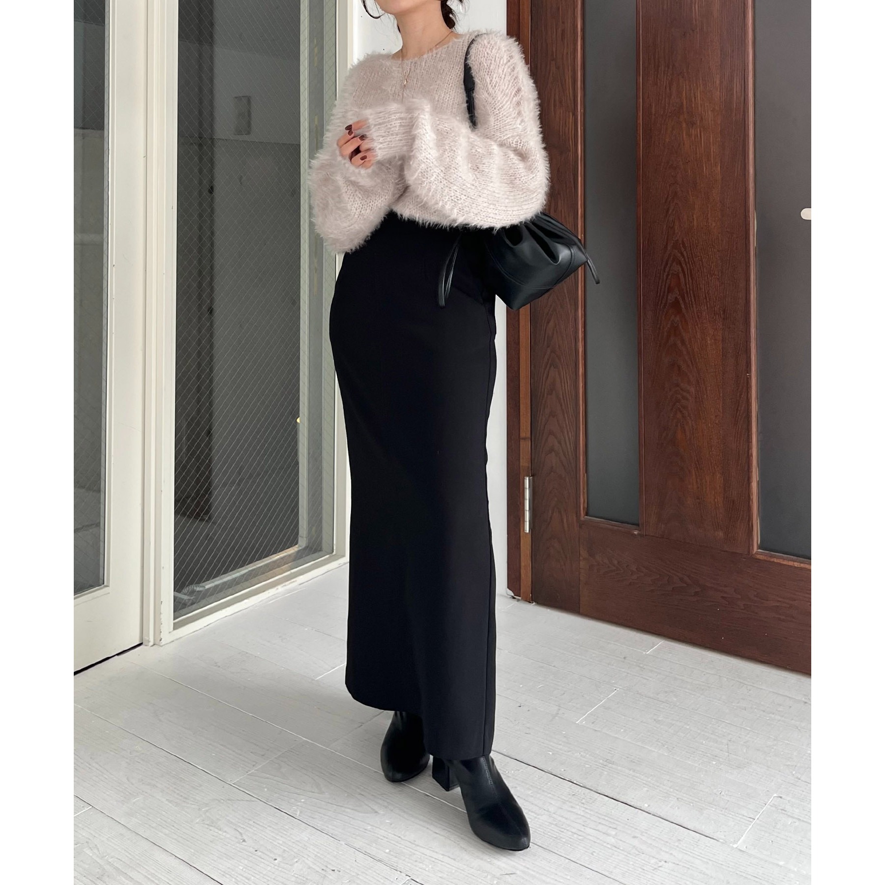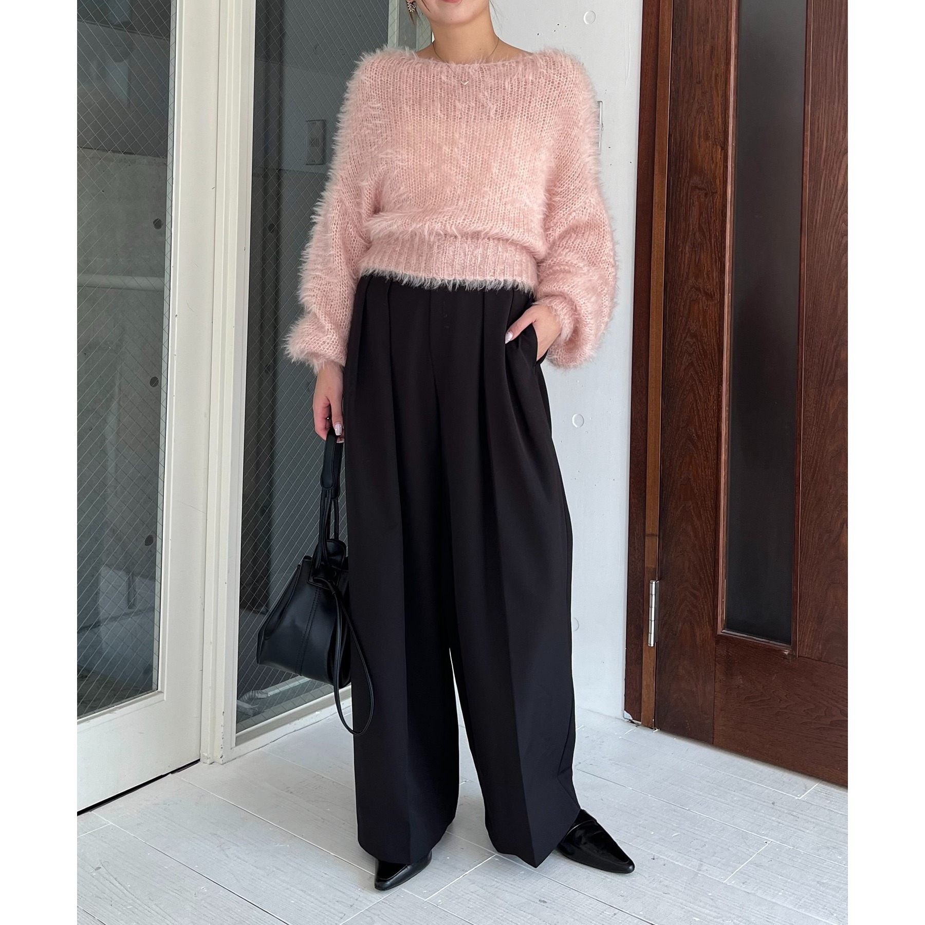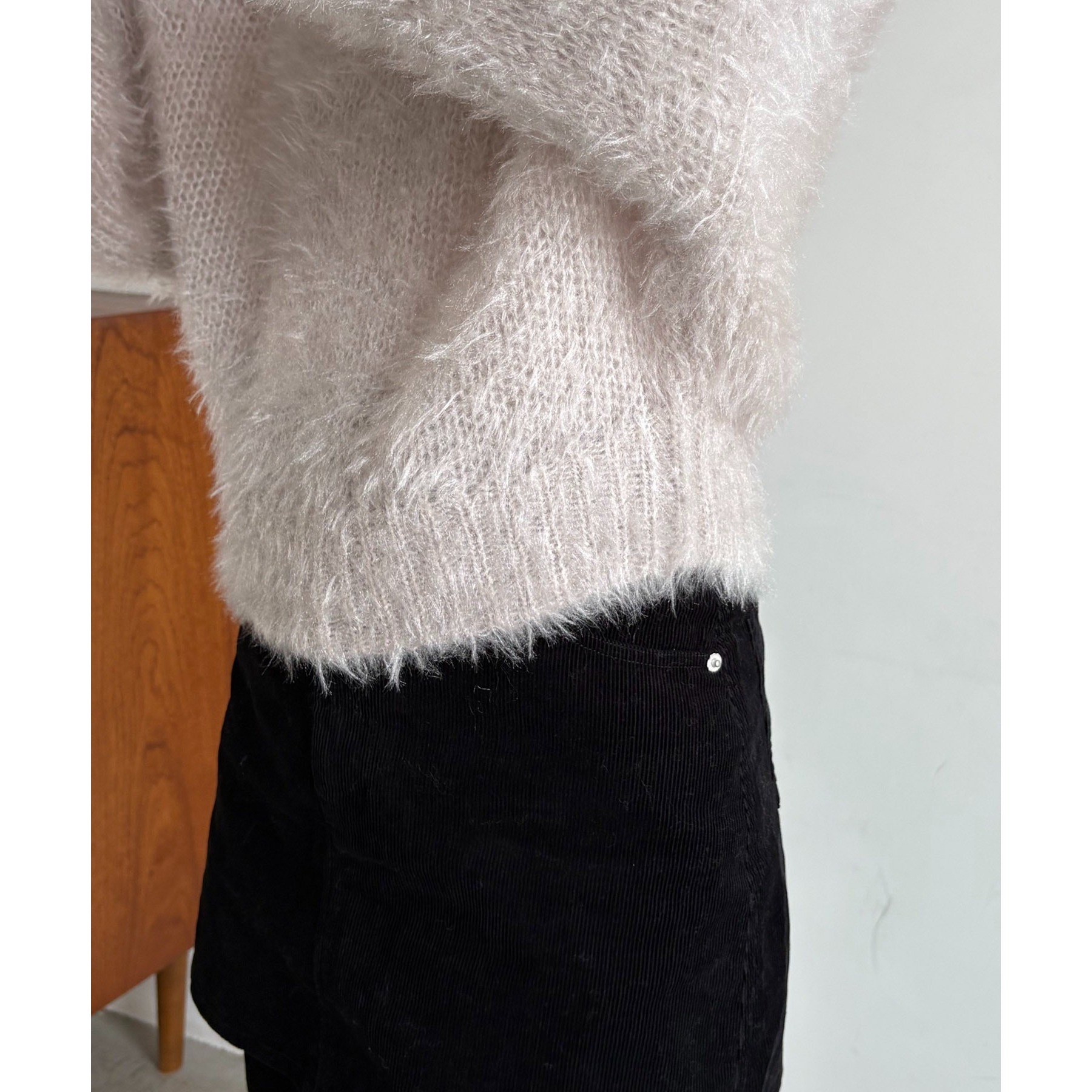 毛足の長いフェザーとゆるいシルエットが女性らしさをプラス