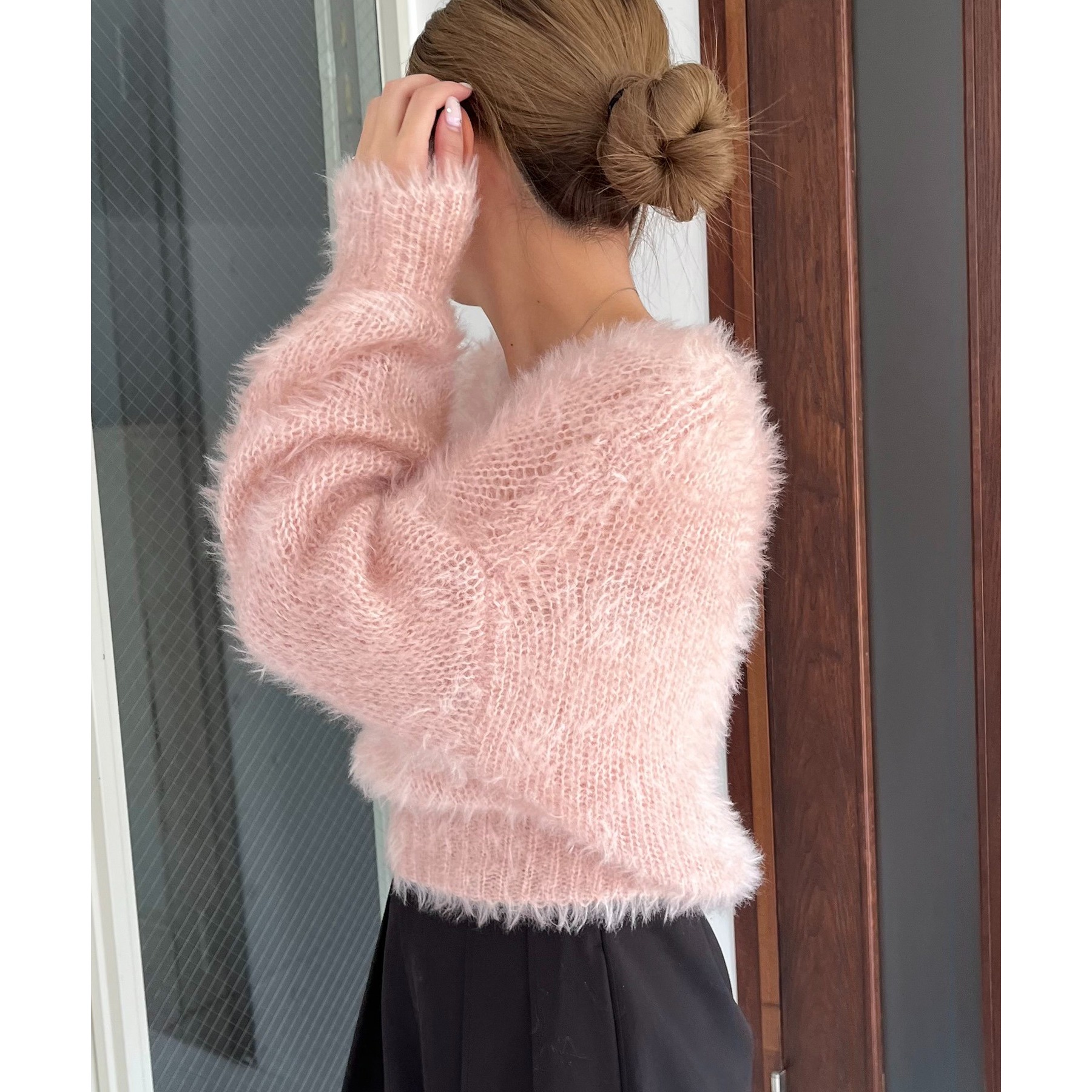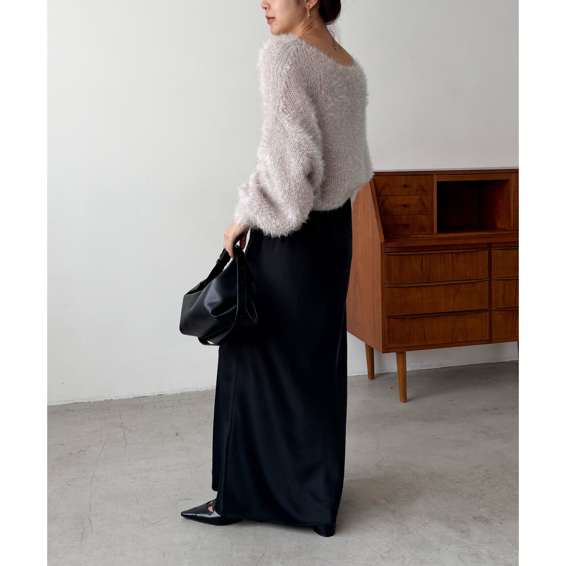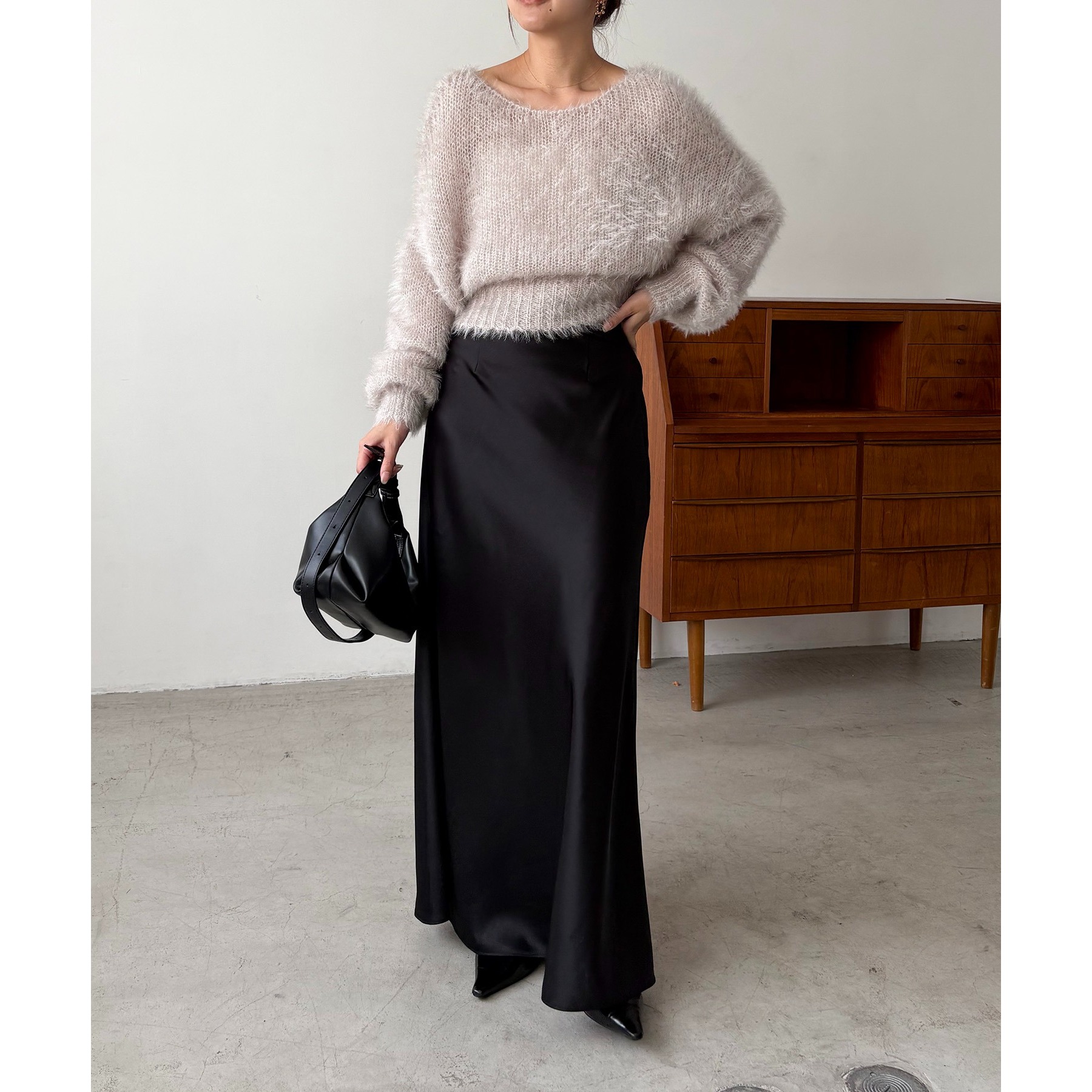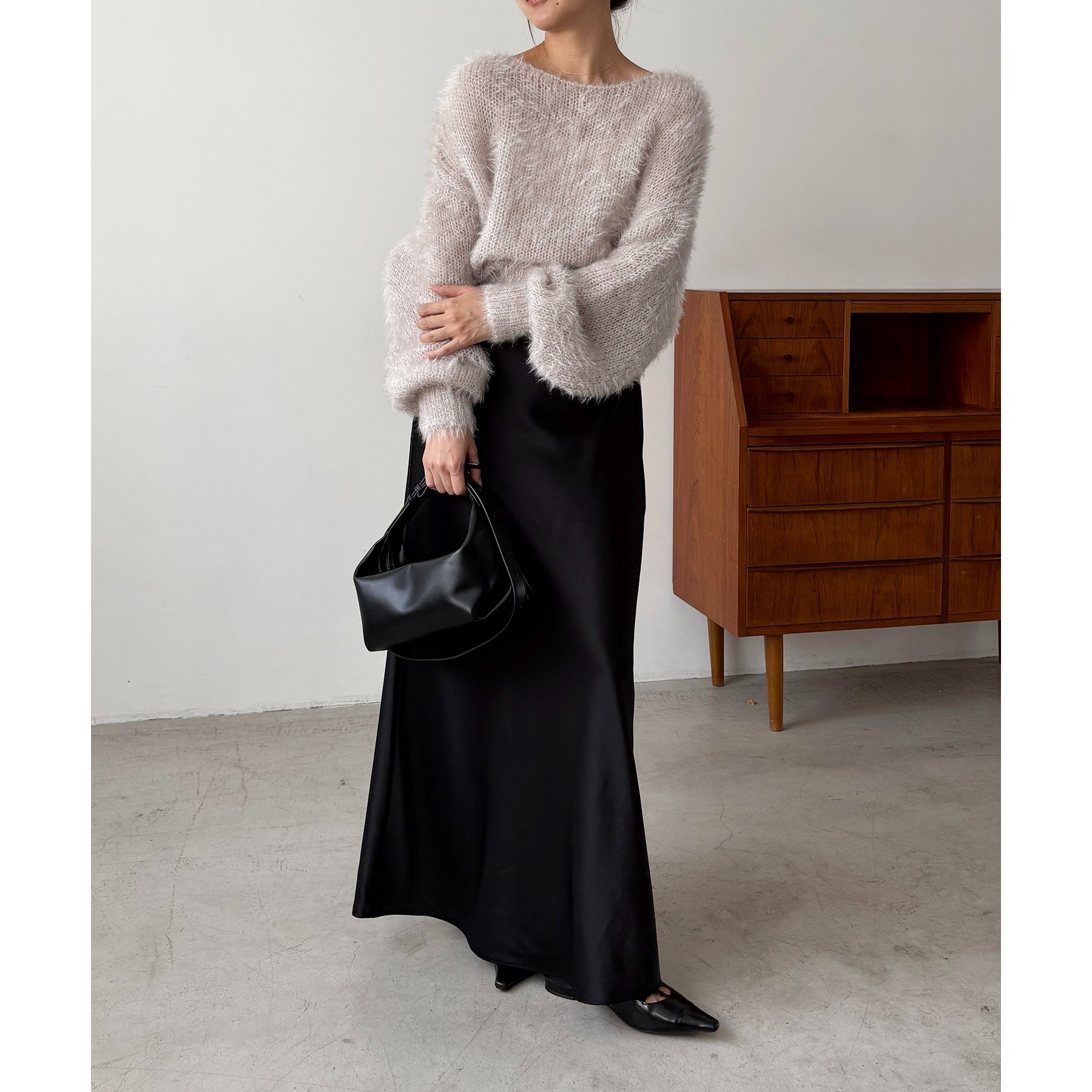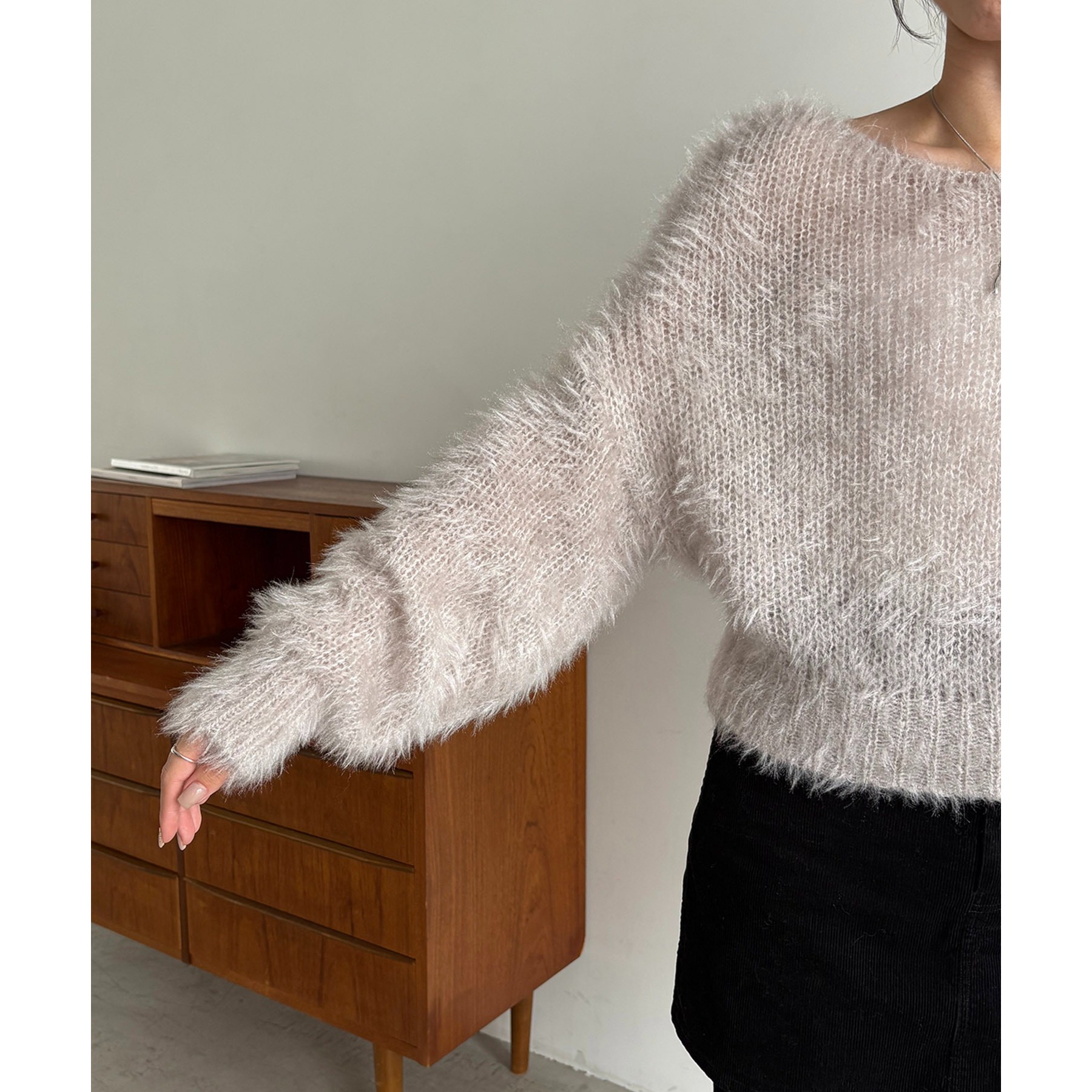 毛足の長いフェザーとゆるいシルエットが女性らしさをプラス