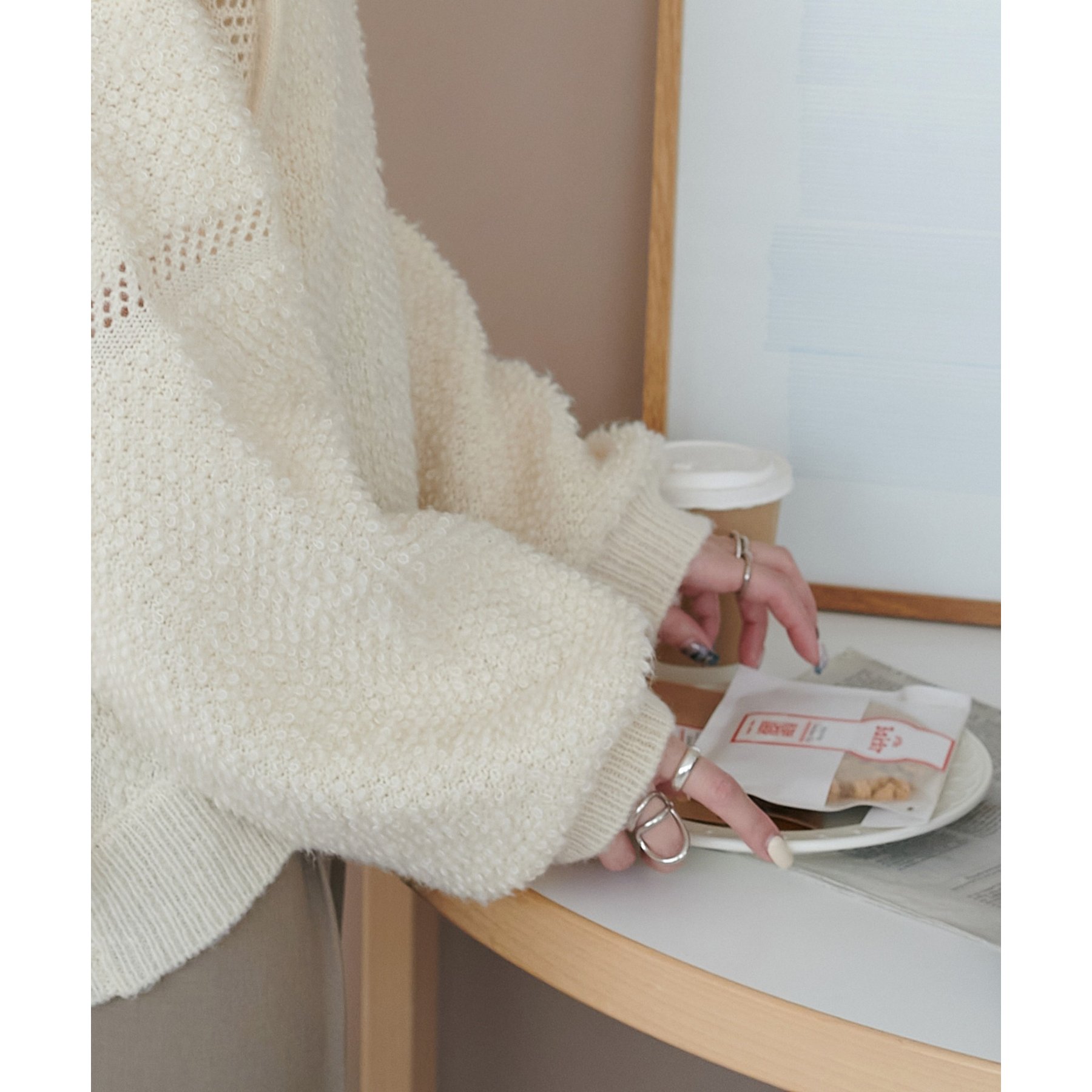 162cmスタッフ:もこもことした表情が可愛くて、着るだけで季節感が出ます♪Vネックのおかげで顔まわりがすっきり見えて、ボリュームのあるシルエットもバランスよく着こなせました。