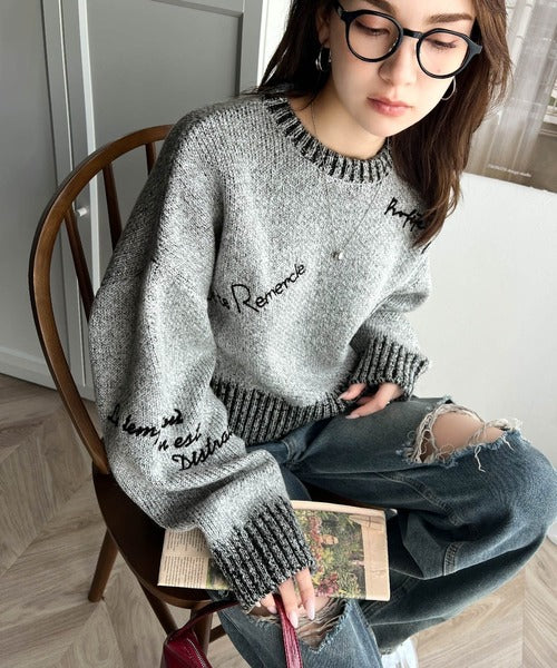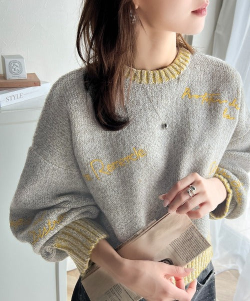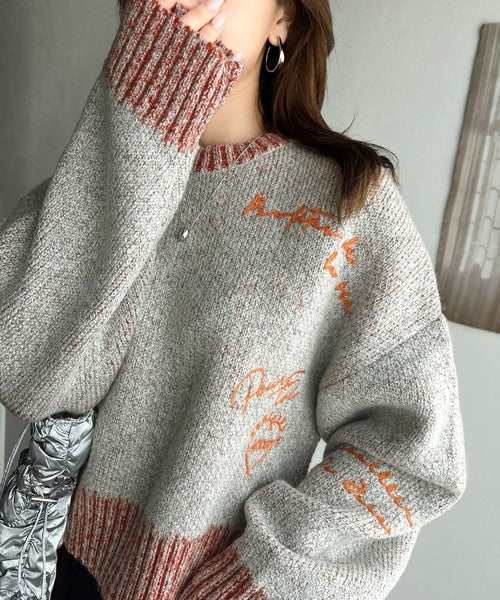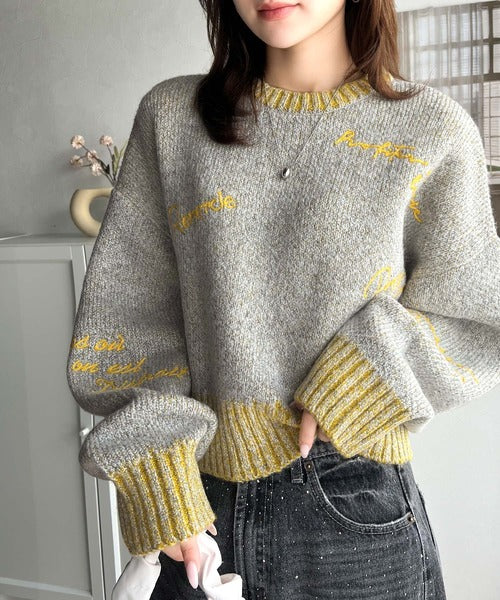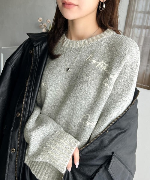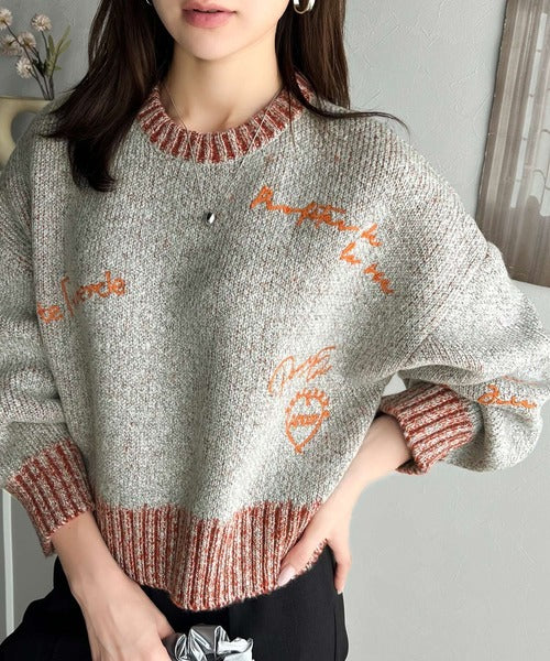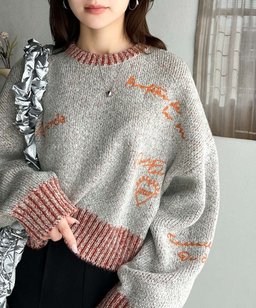コントラストカラーのロゴ刺繍をランダムに散りばめたニットプルオーバー。