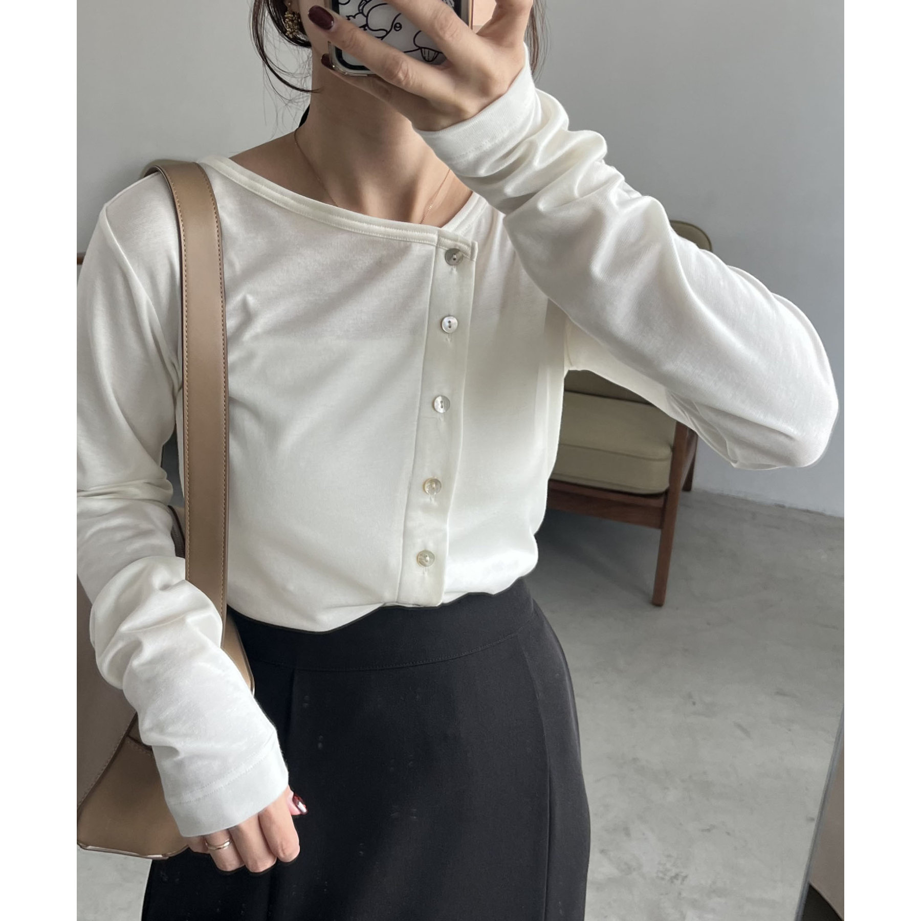 アシメボタンデザインが特徴的な春トップス
