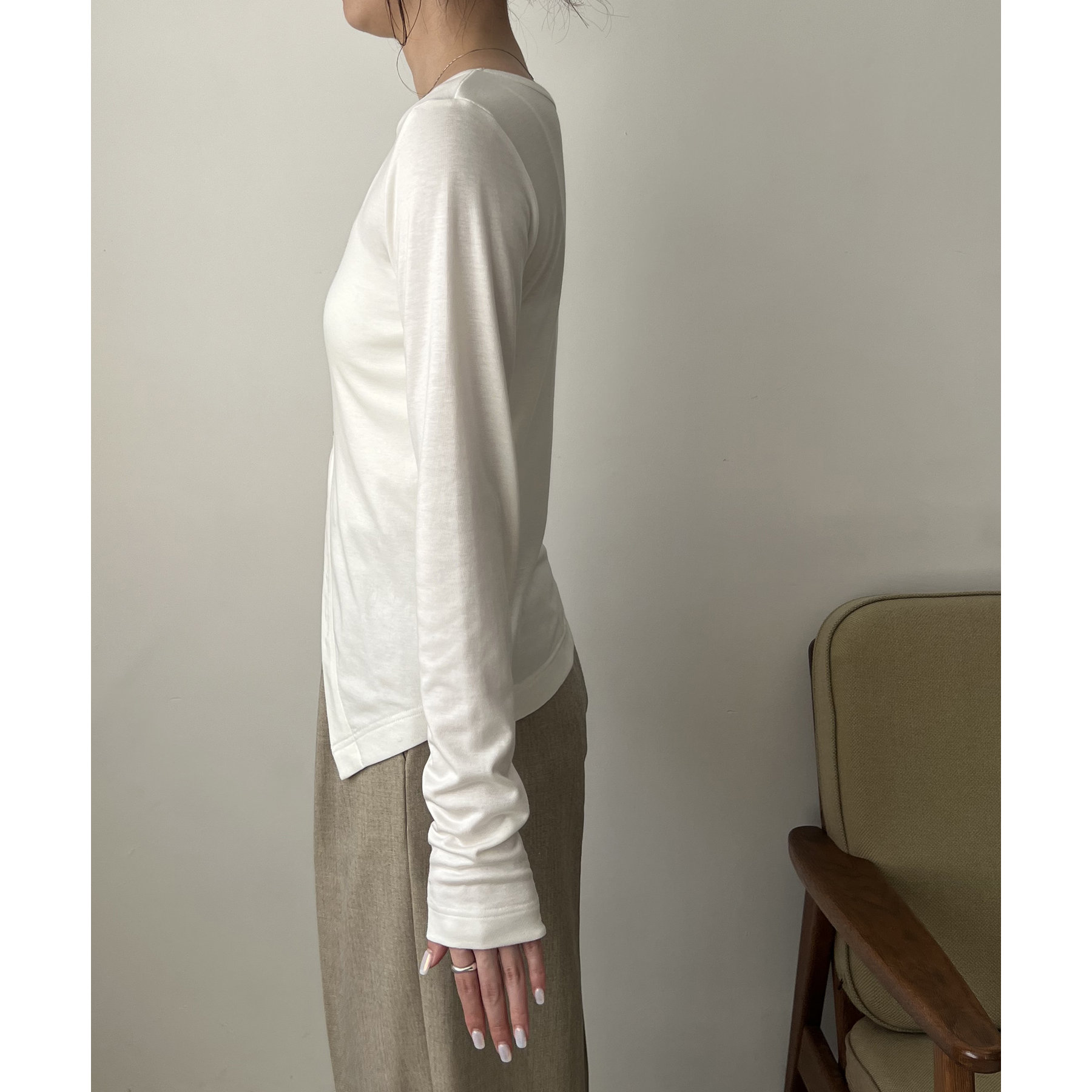 ・左右アシンメトリーのネックラインと裾のスリットもポイント