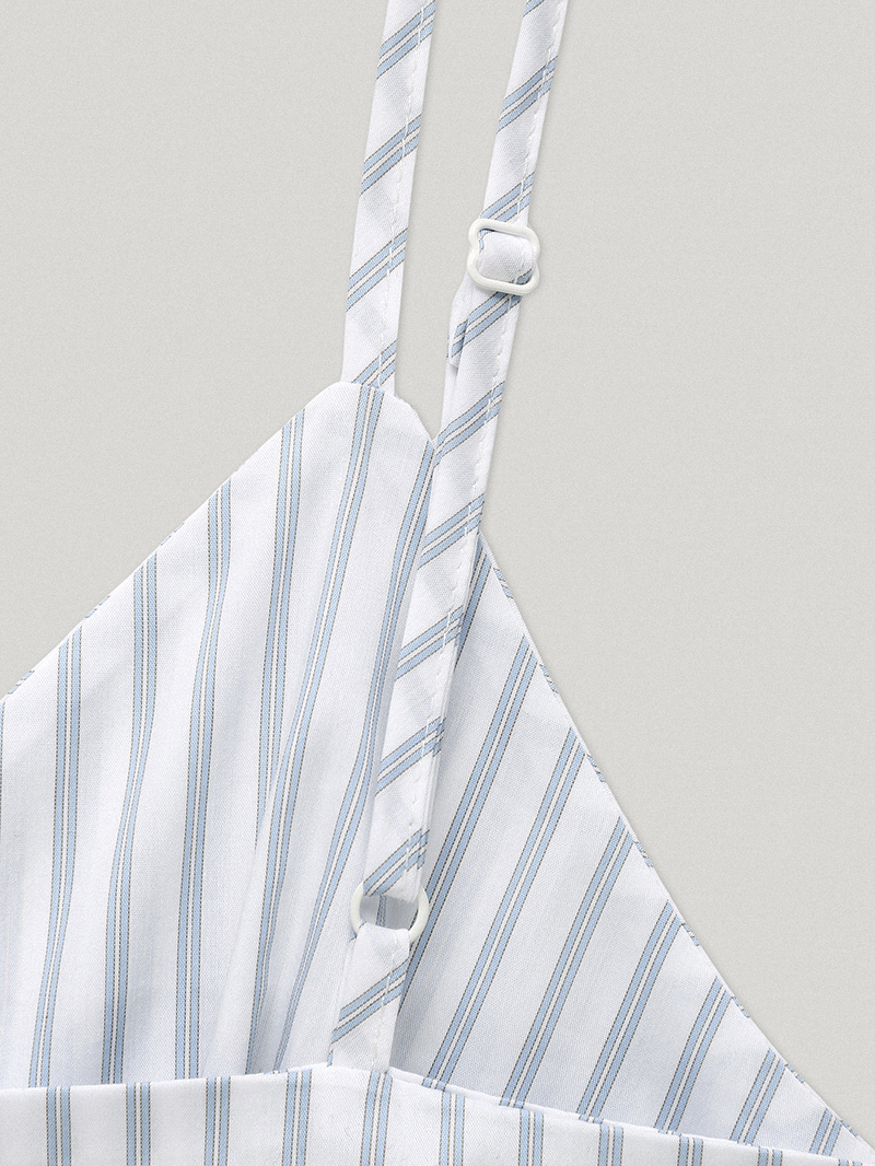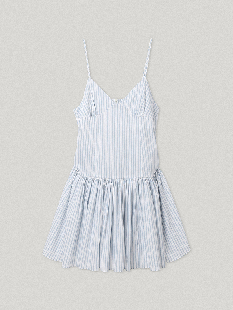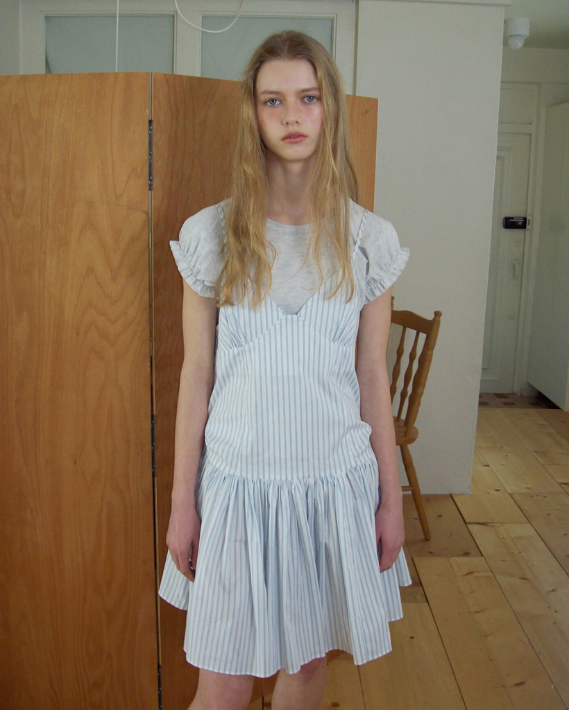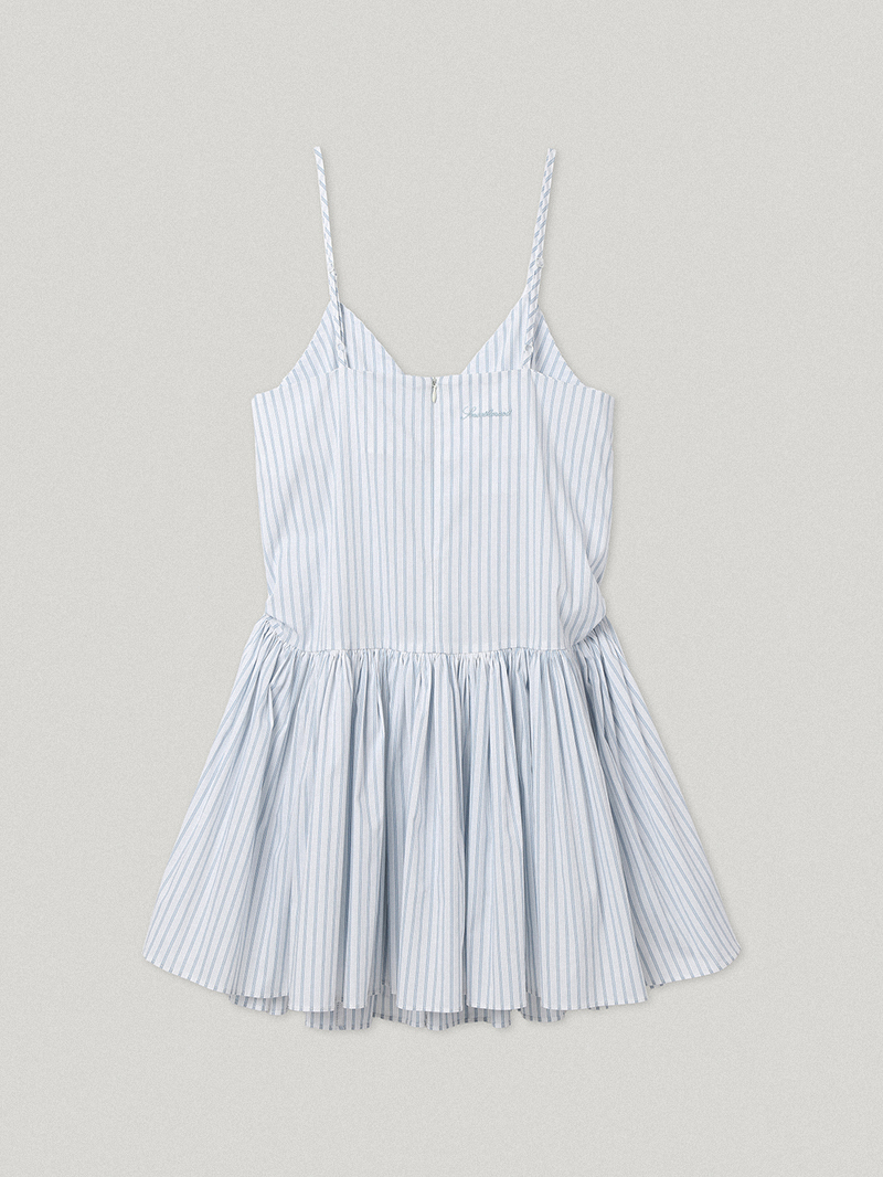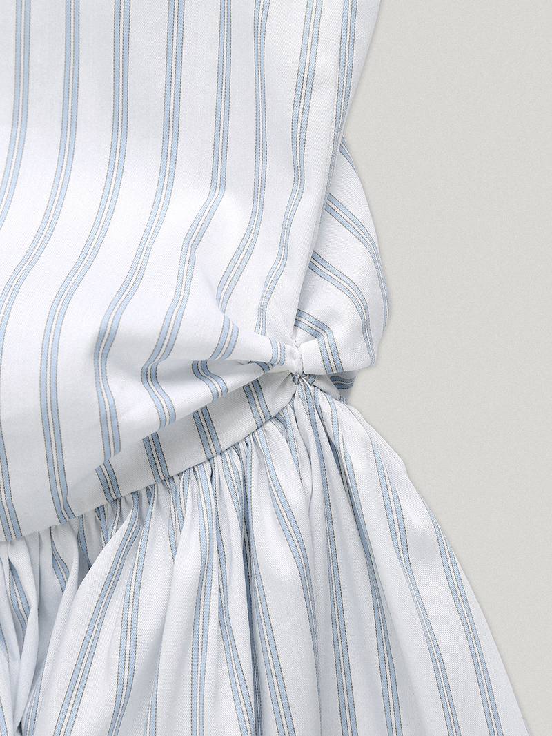 夏の日に吹くそよ風のように爽やかで、保護ストラップドレス。ガーリーなシルエットとミニマルなデザインが特徴の印象的なドレスです。夏の季節をさらに特別なものにするアイテムです。コットンとナイロンを混ぜた軽量素材で作られ、快適で涼しい生地で仕上げられています。薄いショルダーストラップは調整可能で、ウエスト下まで広がるフレアラインのシルエットは、動くたびに目を引きつけます。シルエットにより構造的でドラマチックな効果を加えています。背中にはスカイブルーのスムームードイタリックロゴが刺繍されており、さりげないアクセントとコレクターズアイテムの価値を高めています。きちんとしたファスナーのディテールは清潔なファスナーディテールで丁寧に仕上げられています。Tシャツや袖と重ねて、夏に軽やかで新鮮な状態で楽しむこともできます。夏にワンピースだけで軽やかに楽しめます。さりげなく爽やかな夏の雰囲気を演出するさりげない空色のストライプパターンでお楽しみください。コットン76%ナイロン、21%スパン3%サイドピンタックのディテール、ミディレングスの調整可能なショルダーストラップ、スムームムードイタリックロゴ刺繍