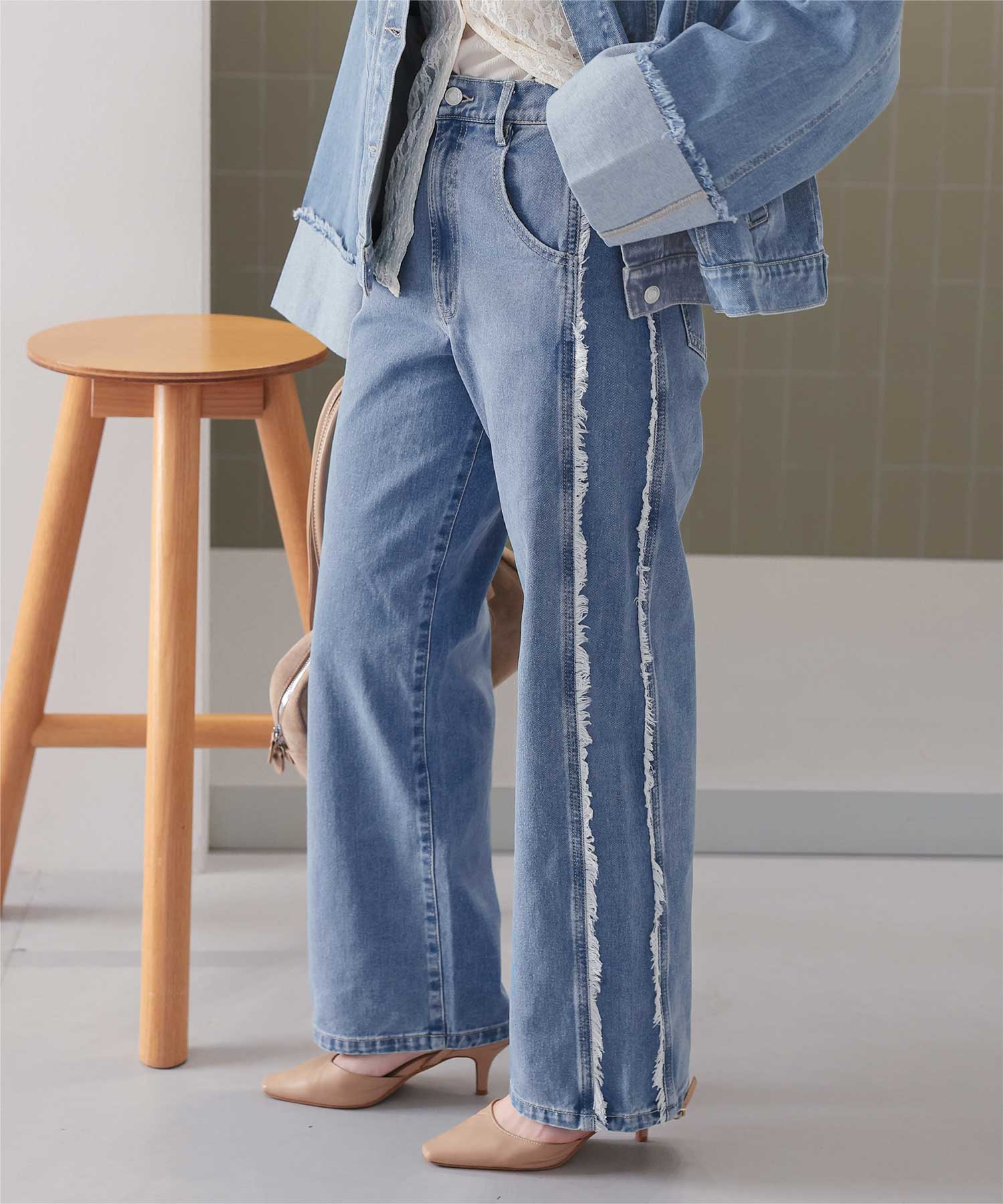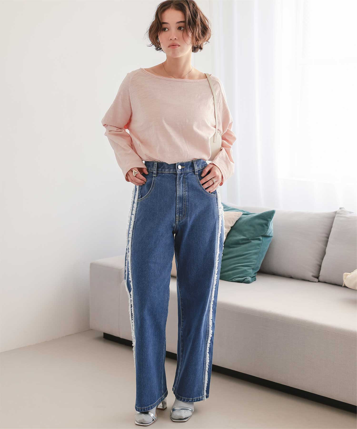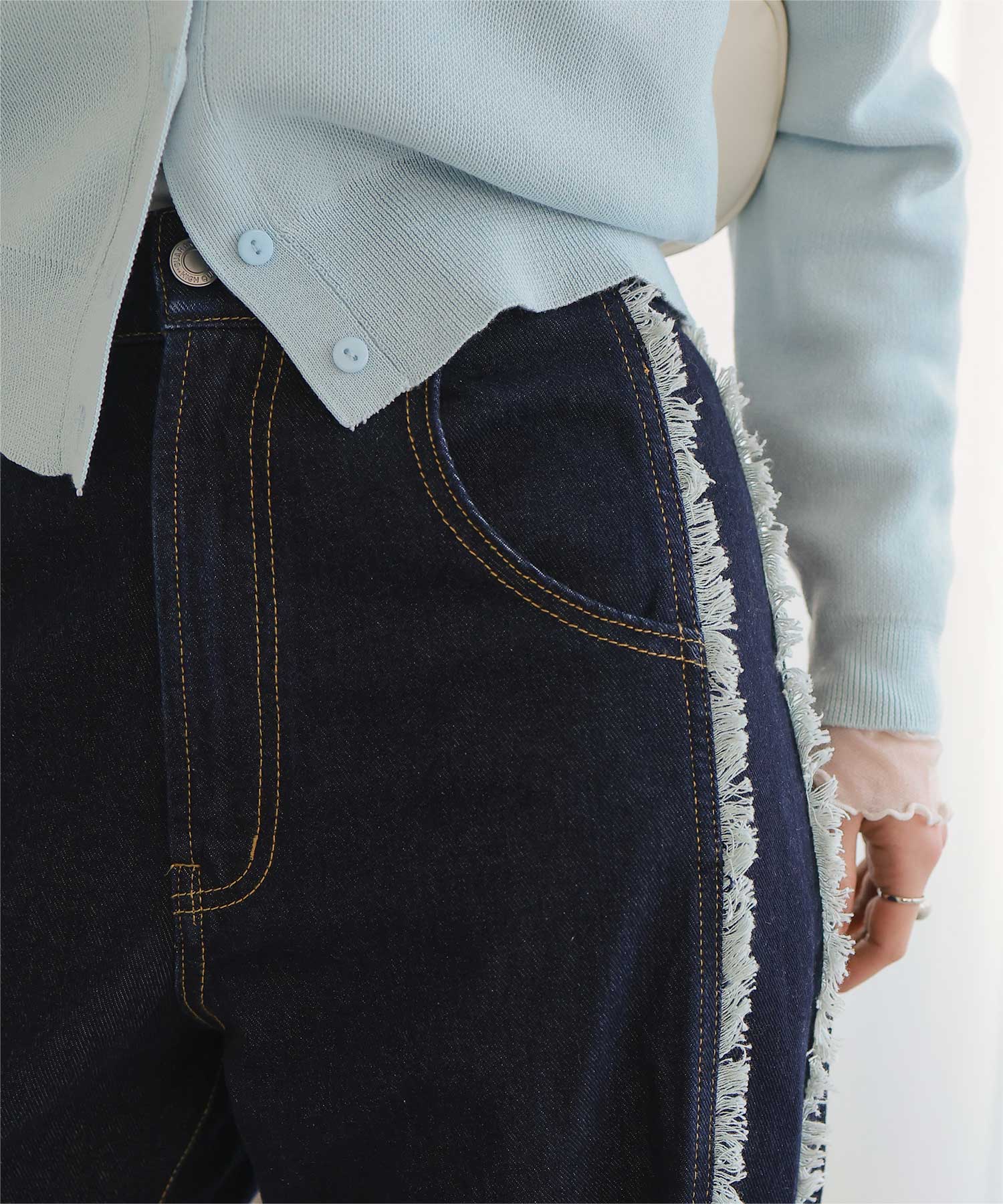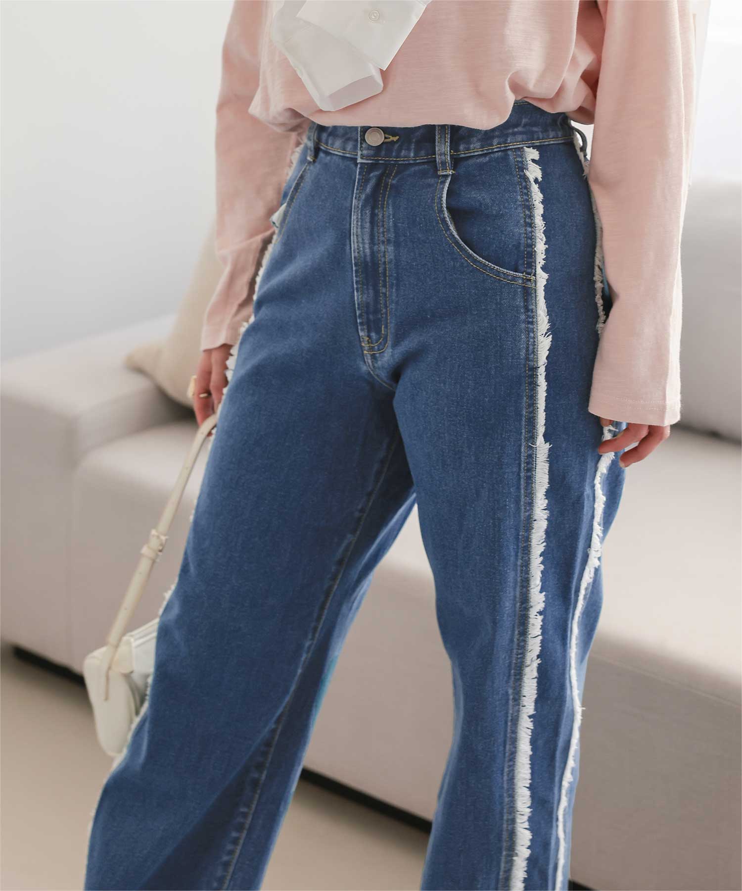 ・サイドフリンジが目をひくデニムパンツ。