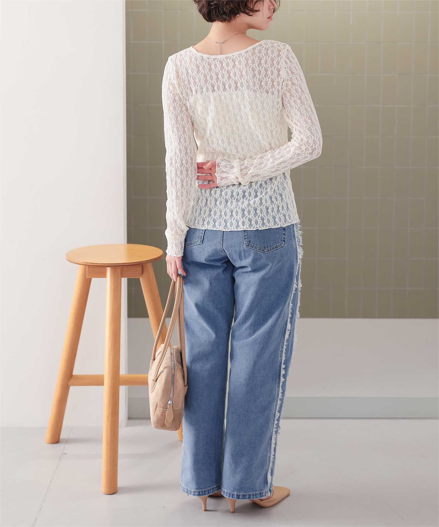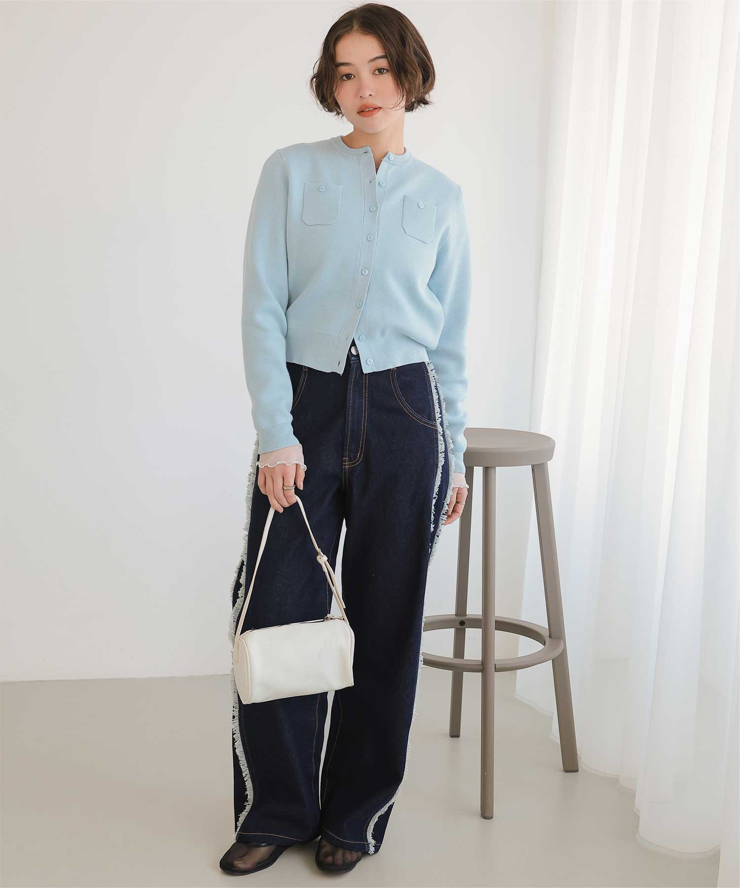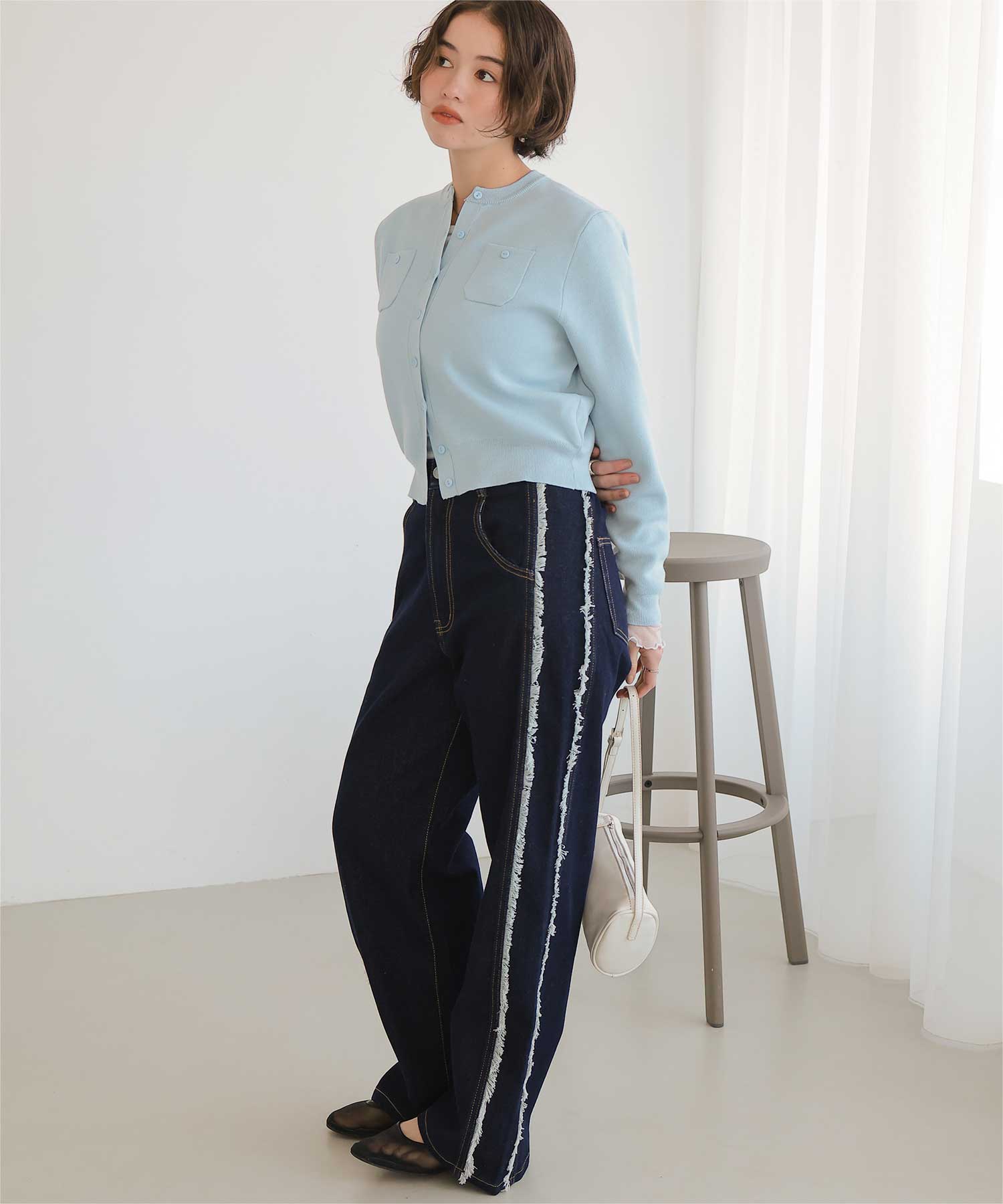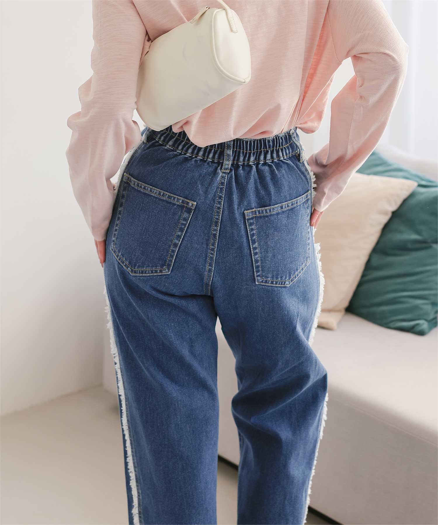・サイドフリンジが目をひくデニムパンツ。