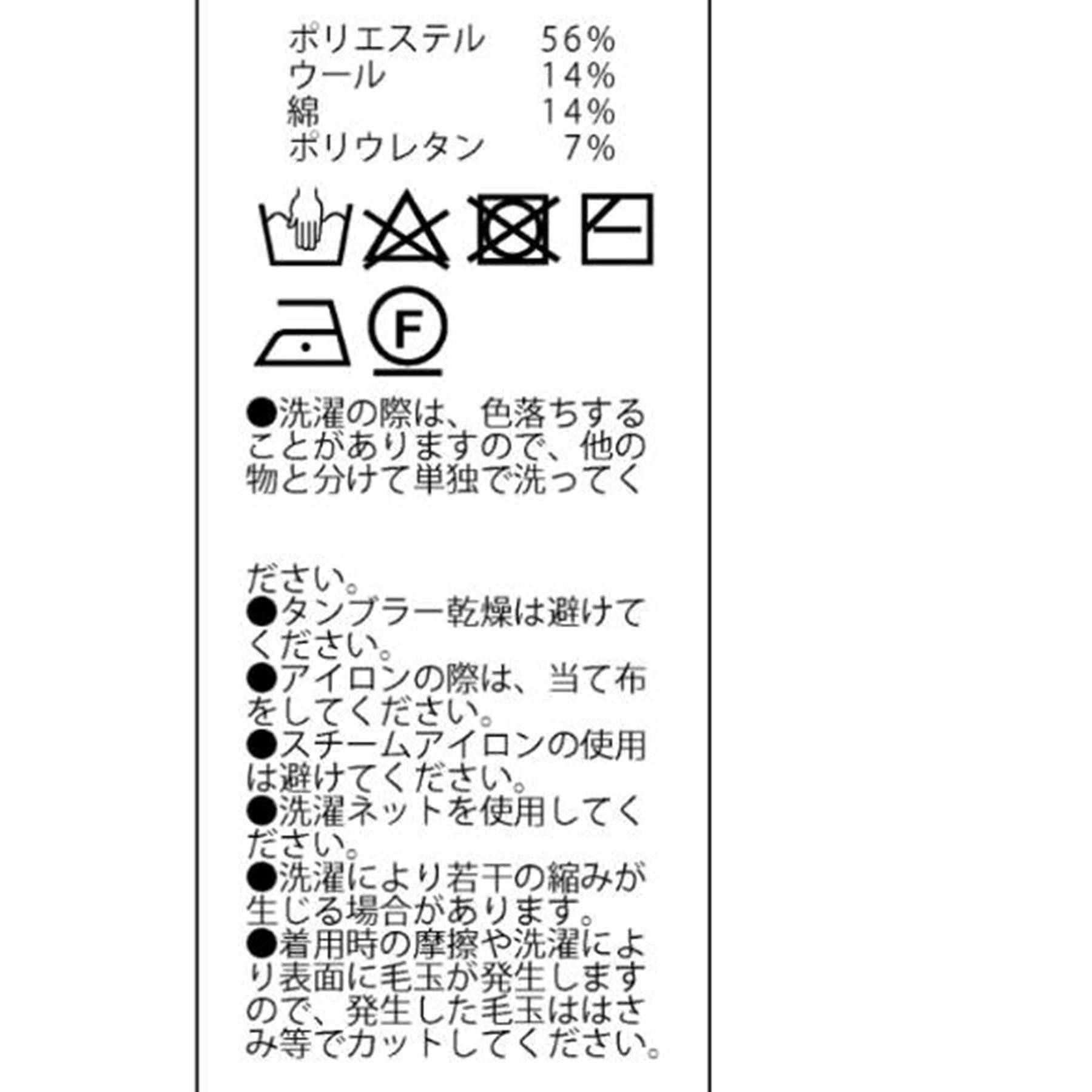 ポリエステル56%、ウール14%、綿14%、ポリウレタン7%、再生繊維(テンセル)9%