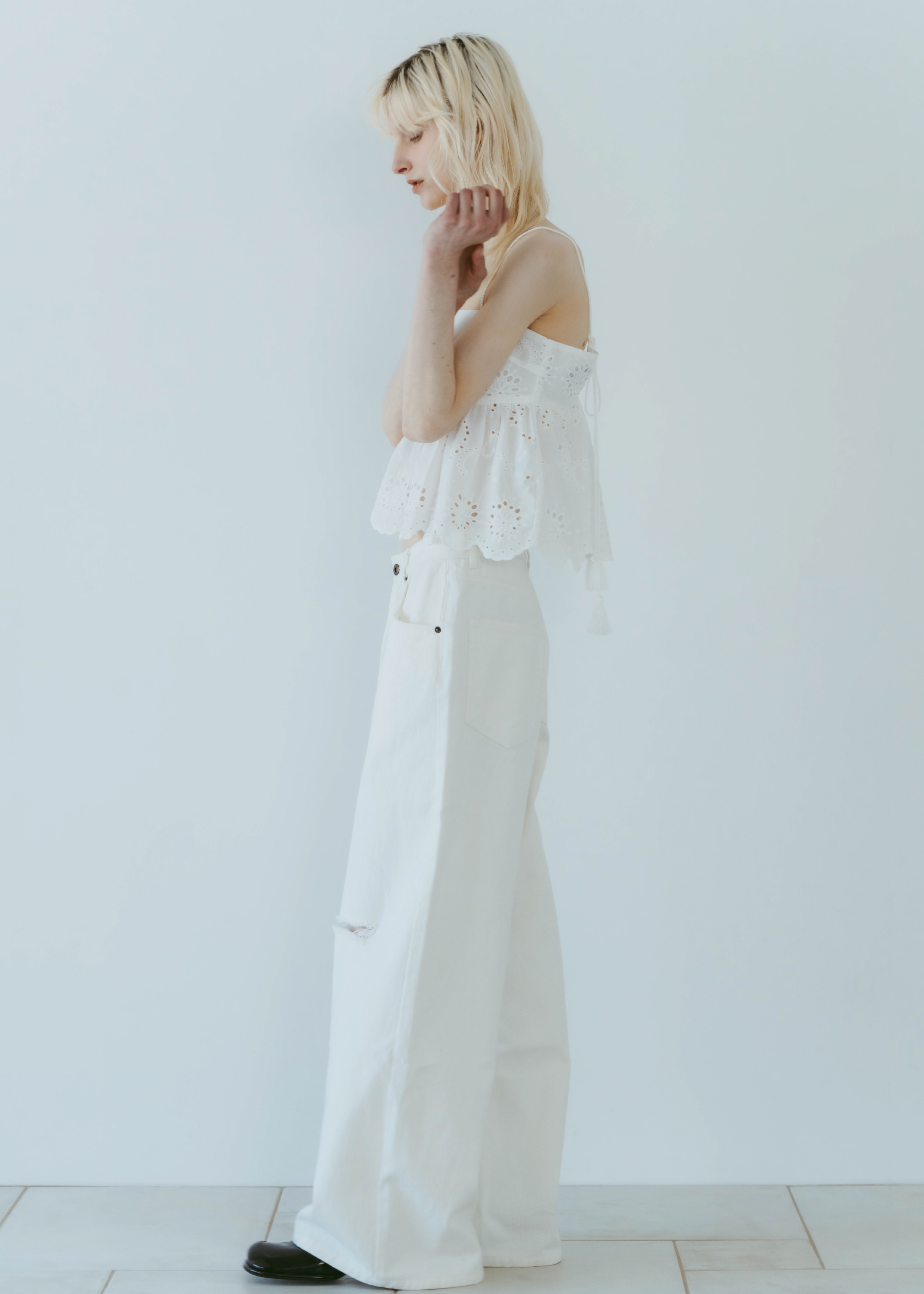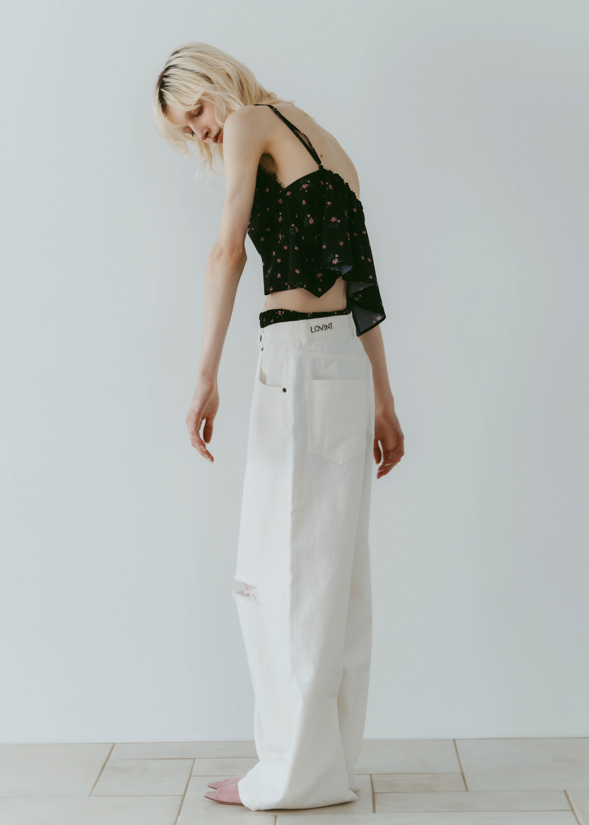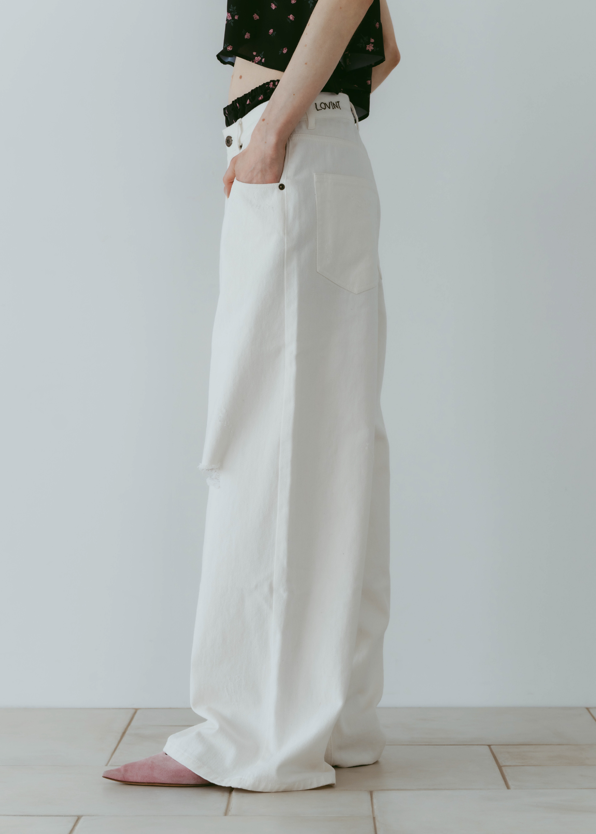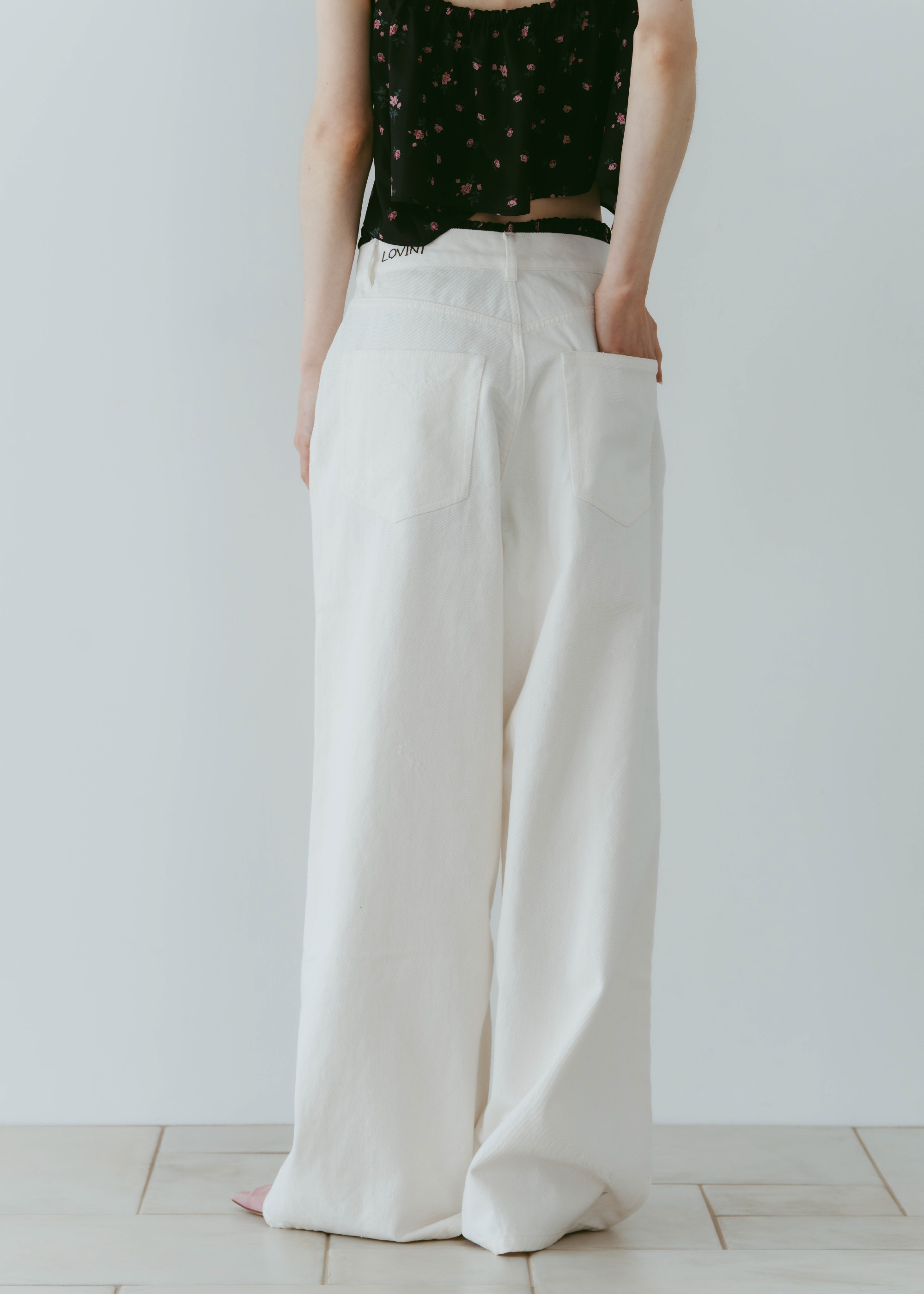 股上をあえて深めに設定することでルーズ感を出しながら、腰位置は高めに見えるシルエットに。