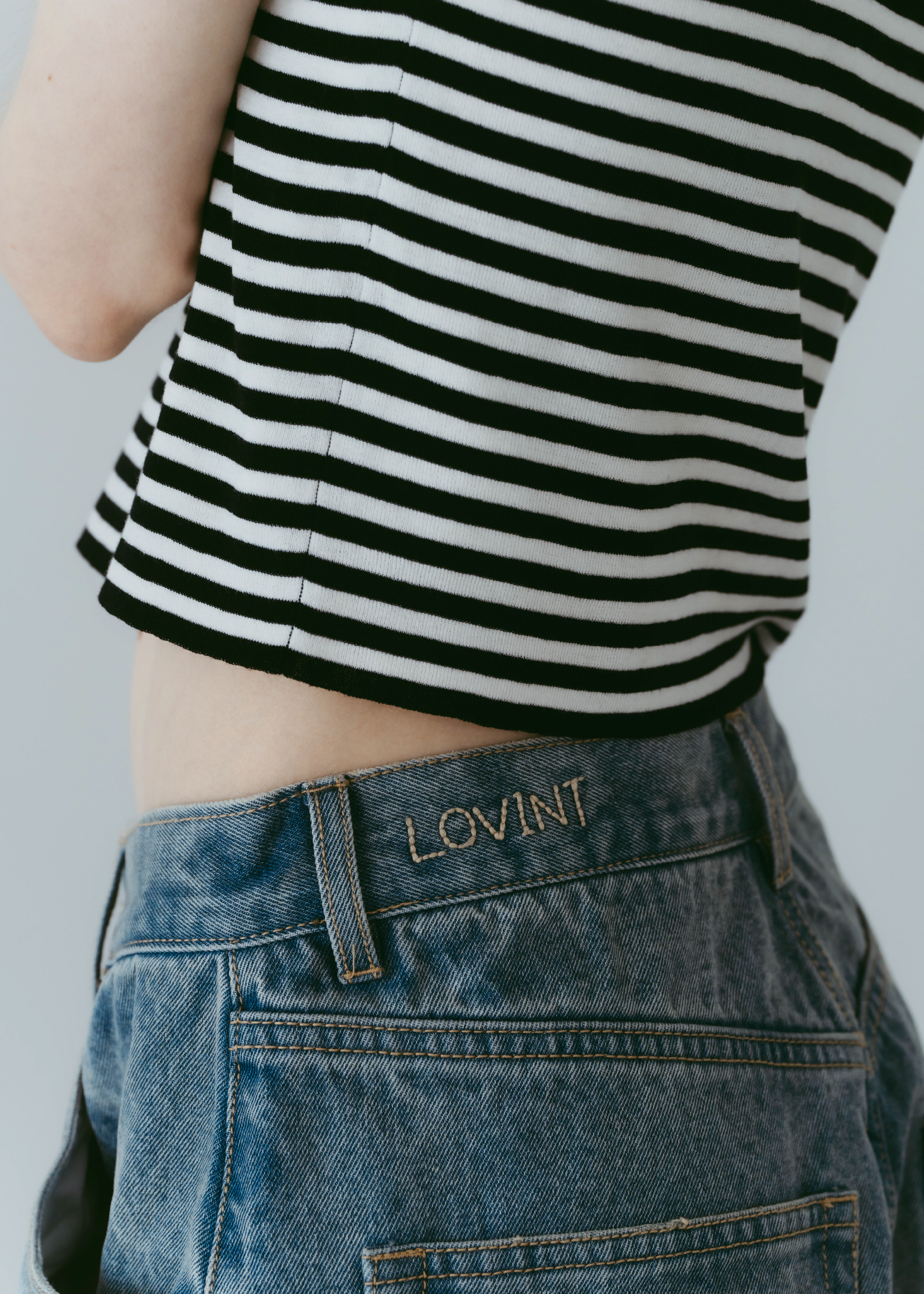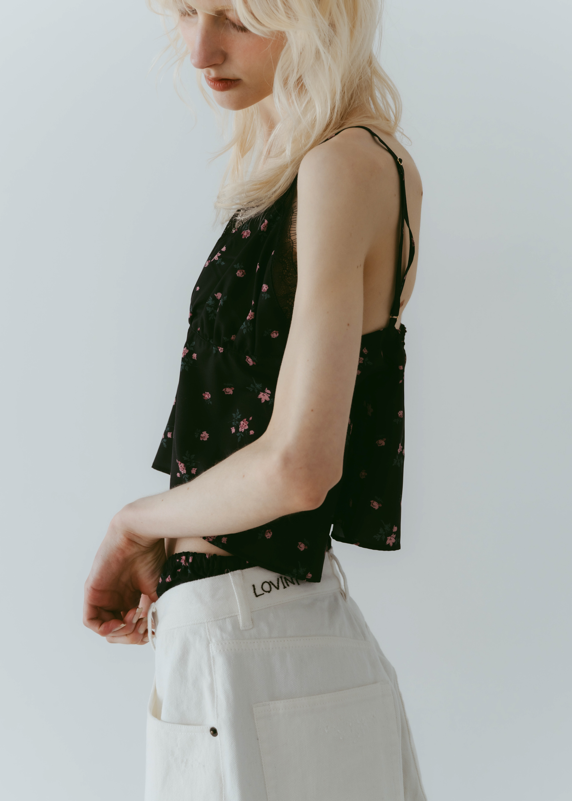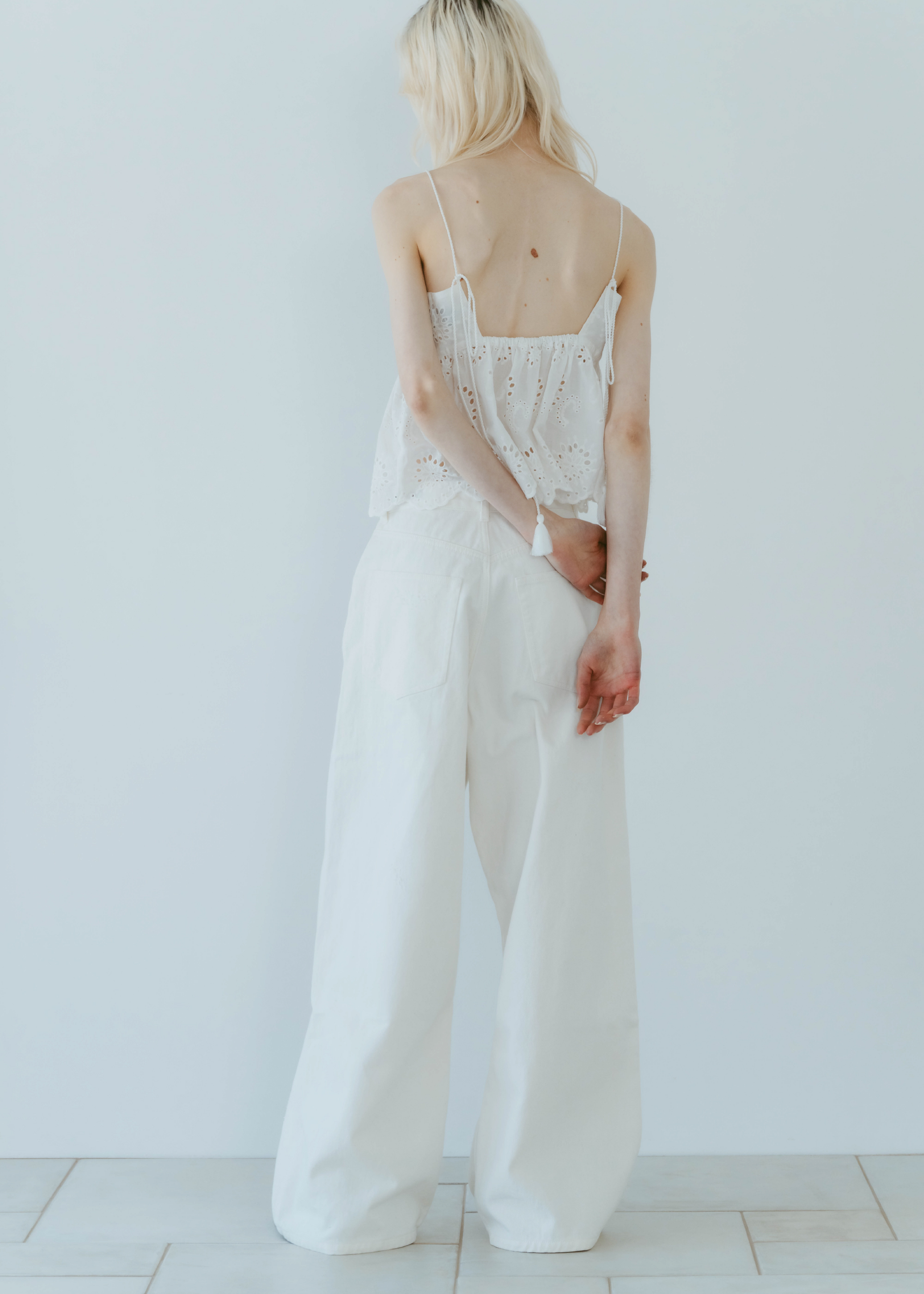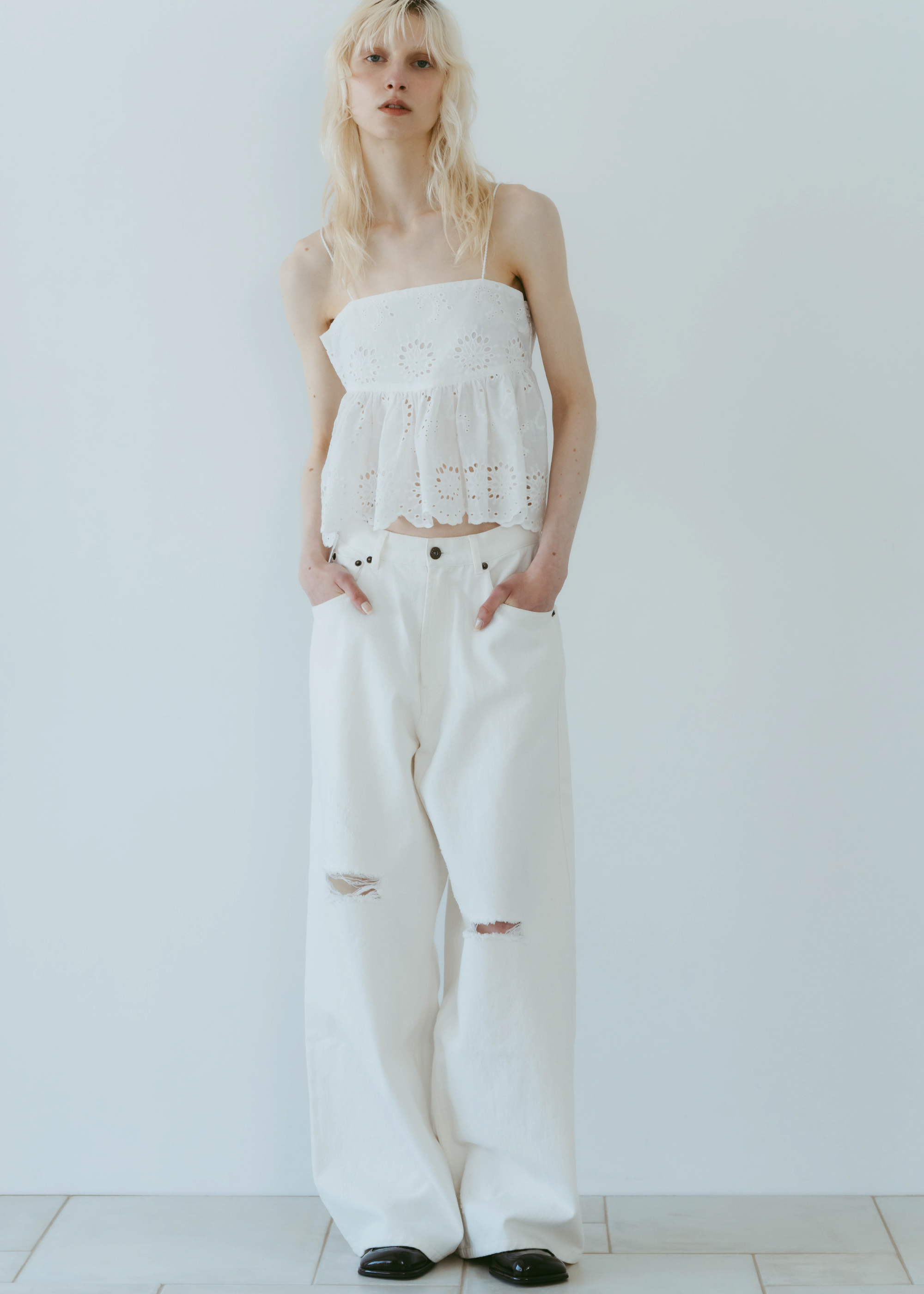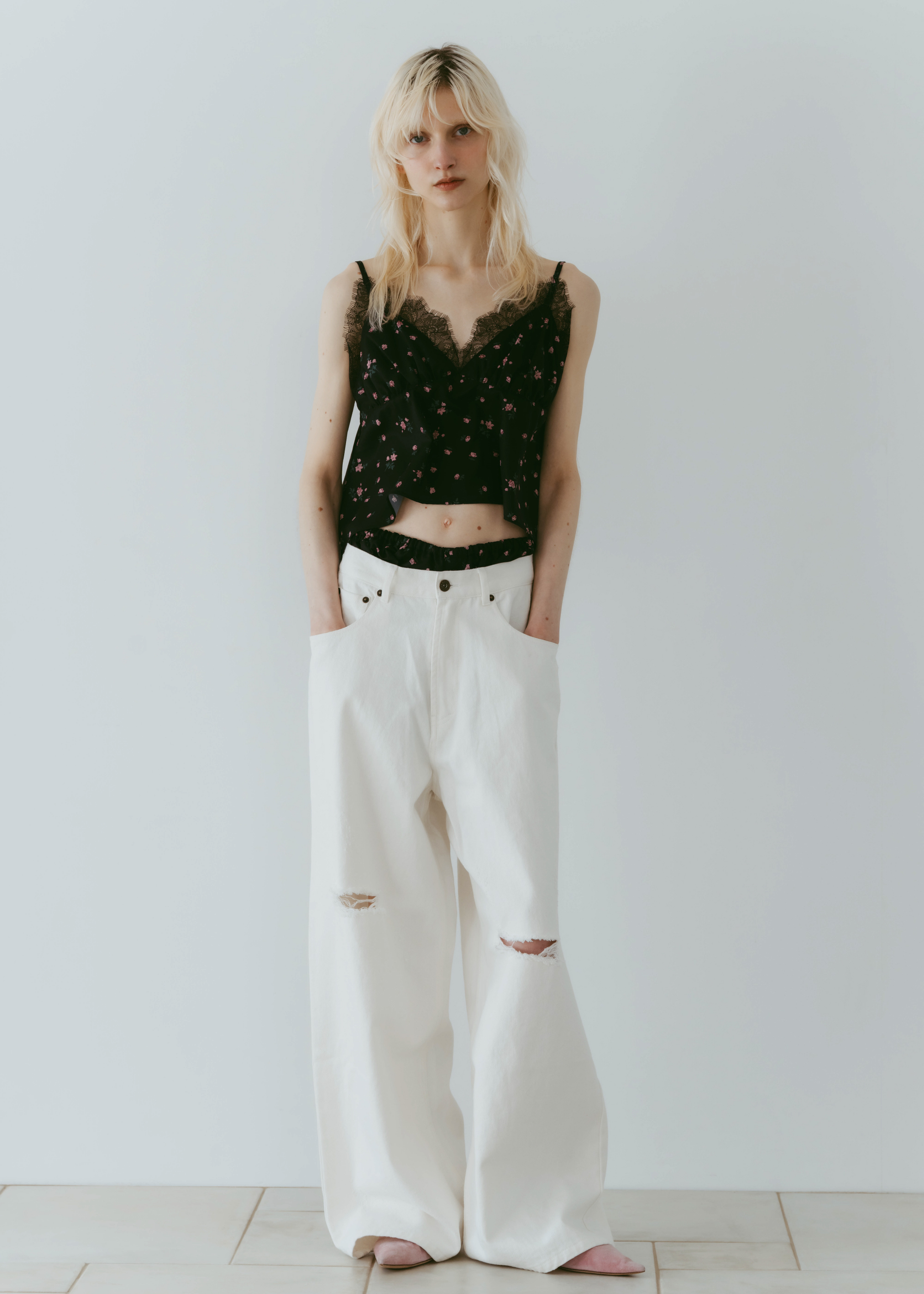 股上をあえて深めに設定することでルーズ感を出しながら、腰位置は高めに見えるシルエットに。