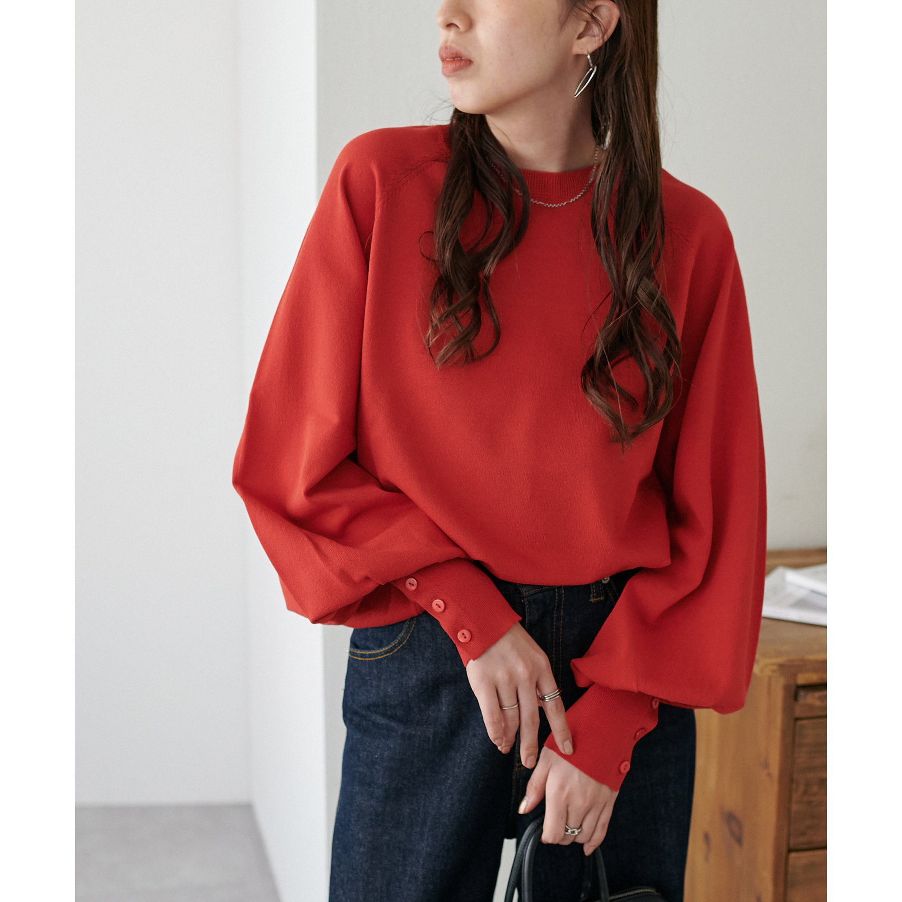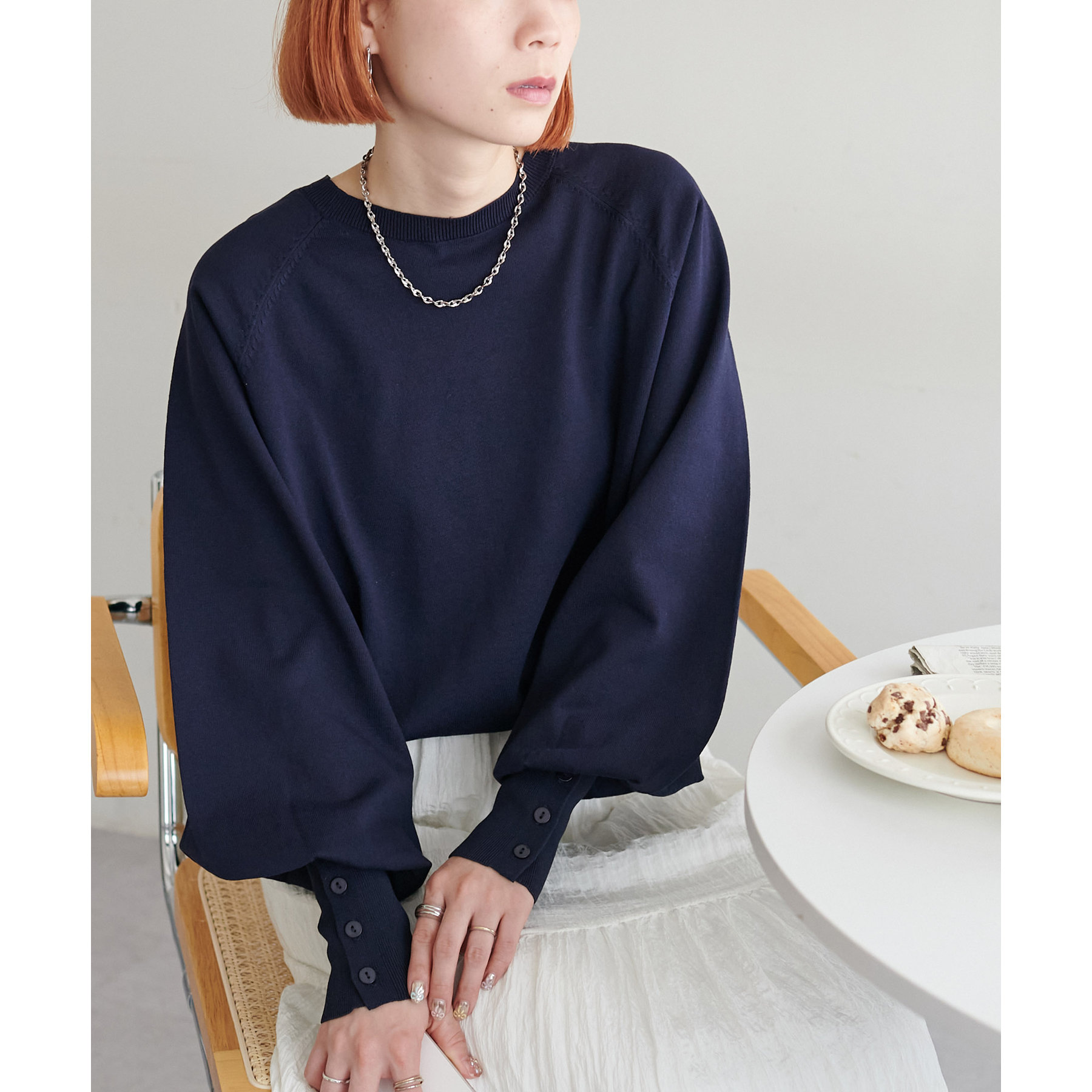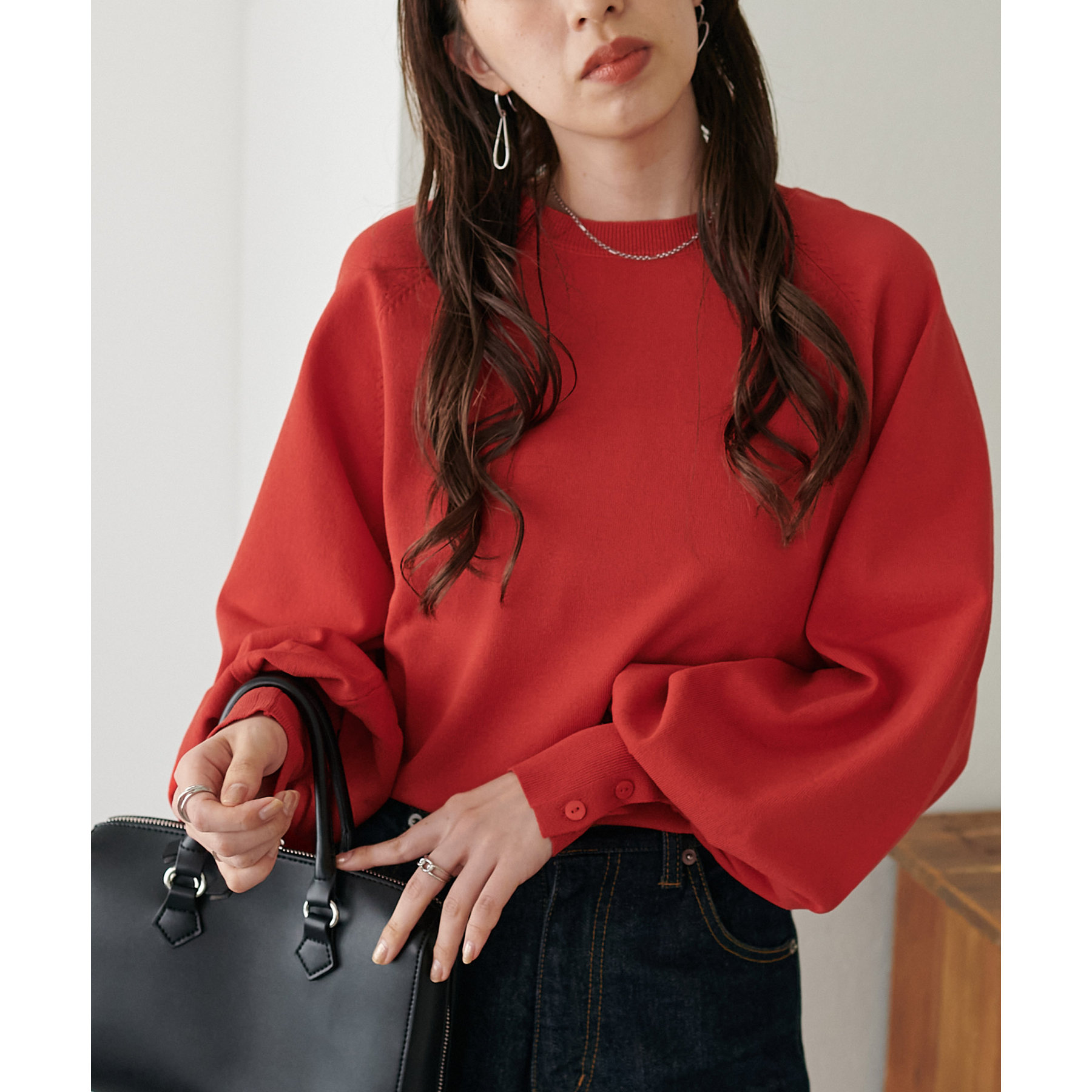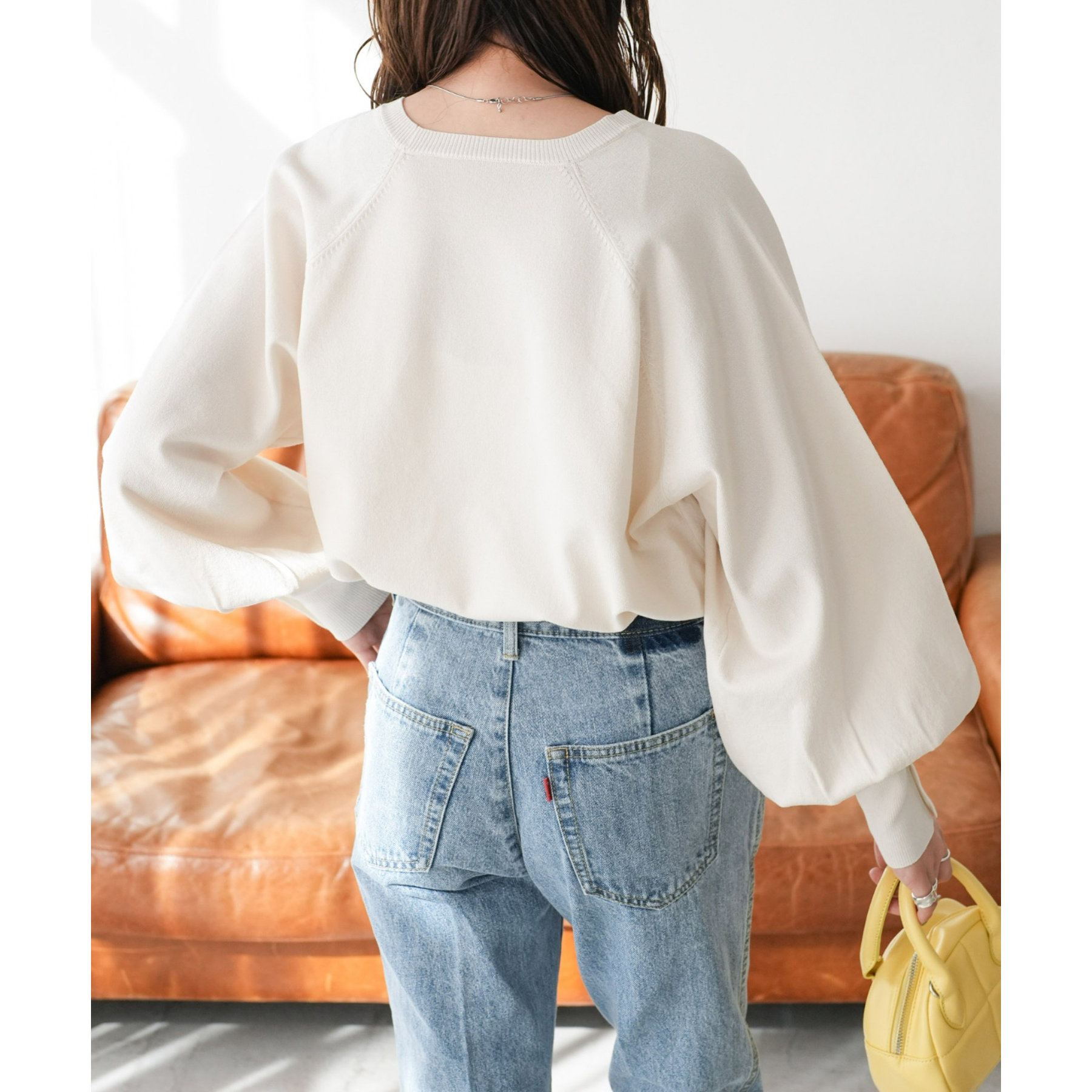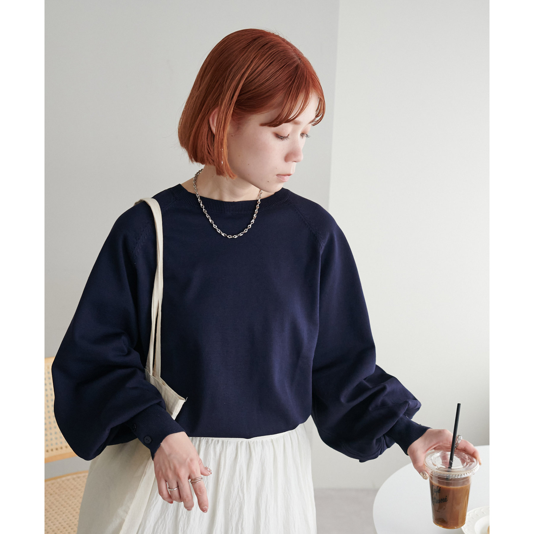 ラグラン切り替えに、丸みのあるボリュームスリーブがフェミニンな雰囲気を演出。