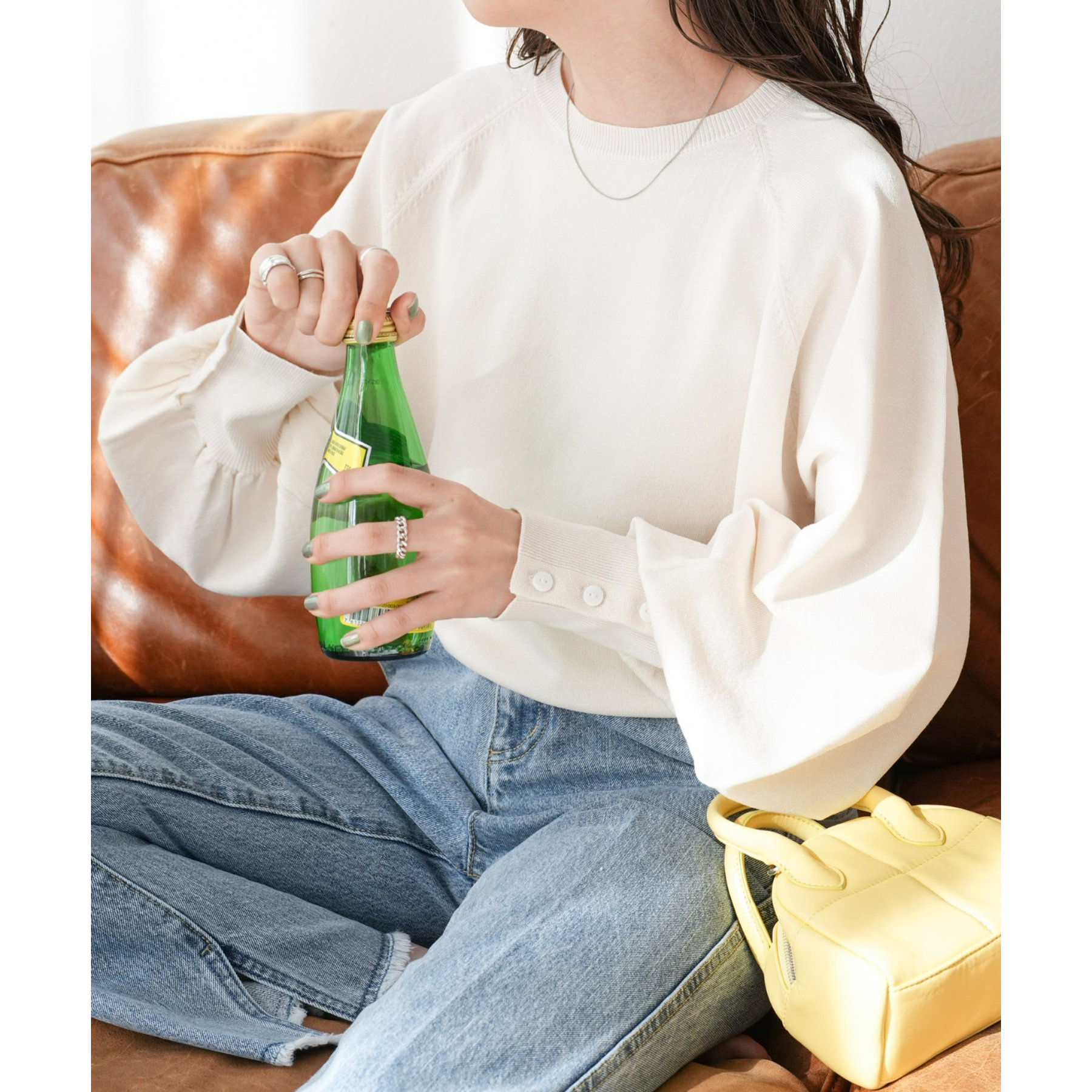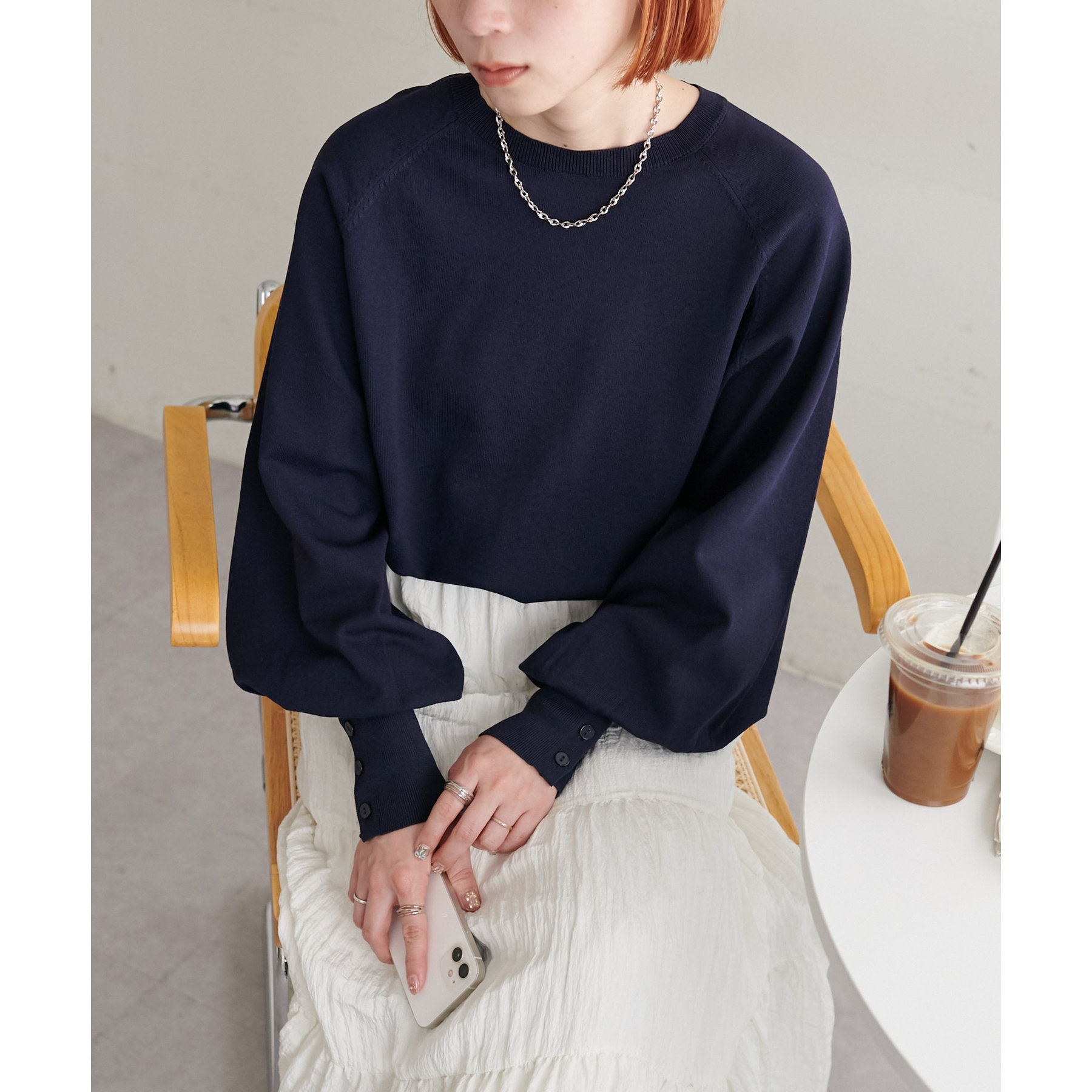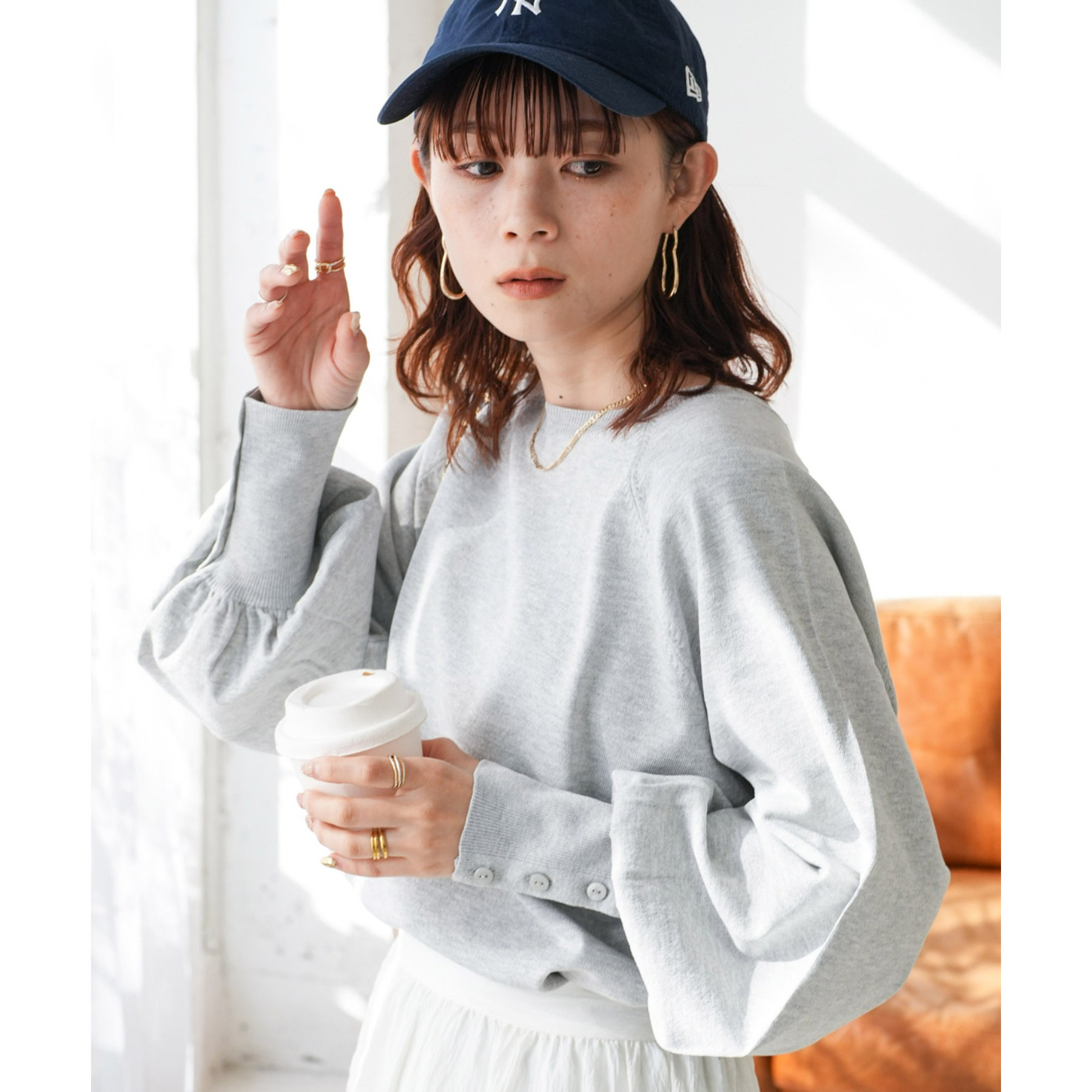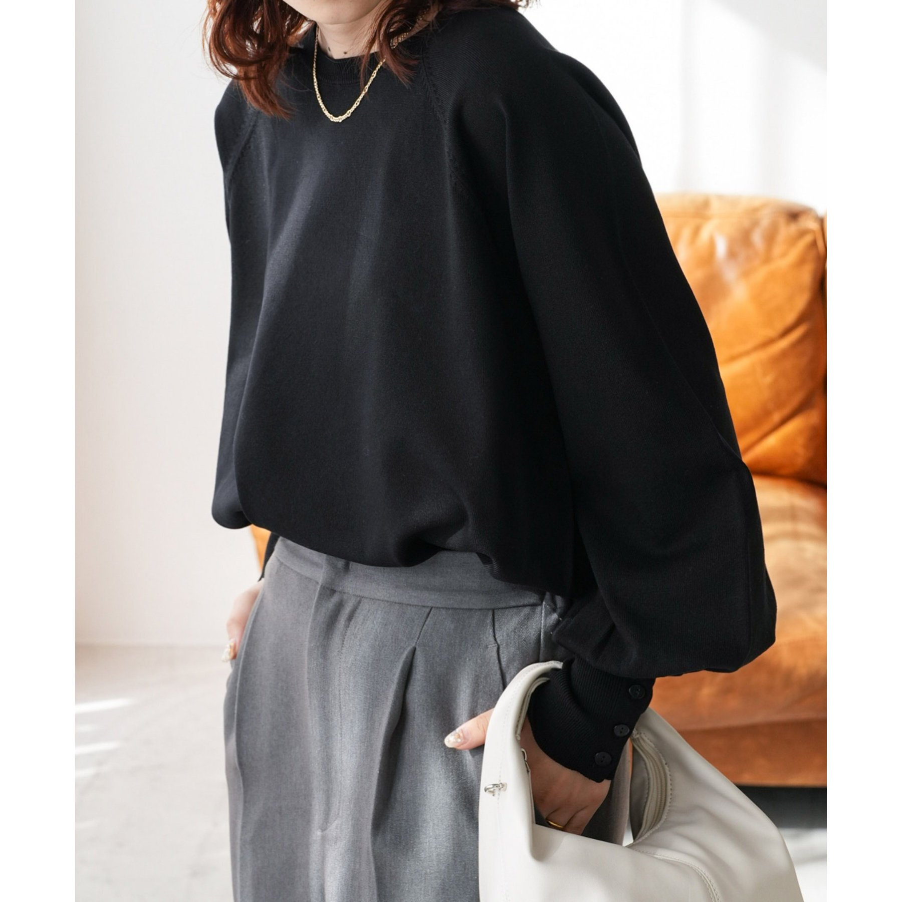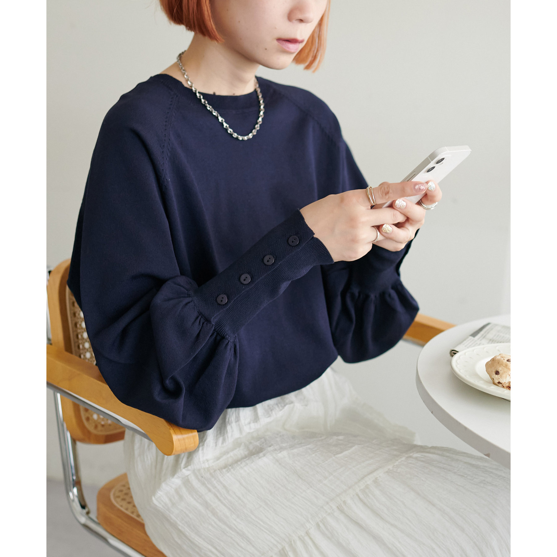 ラグラン切り替えに、丸みのあるボリュームスリーブがフェミニンな雰囲気を演出。