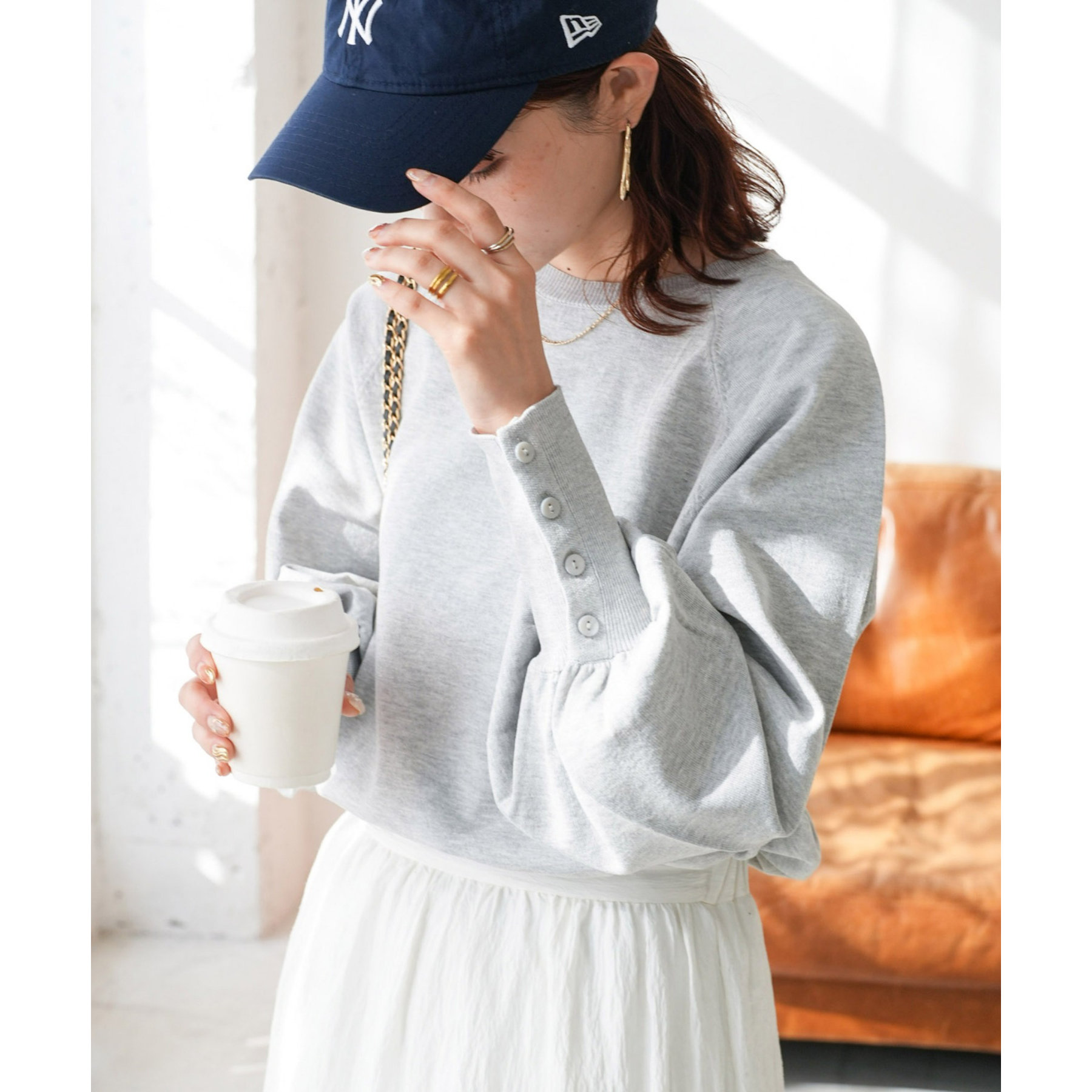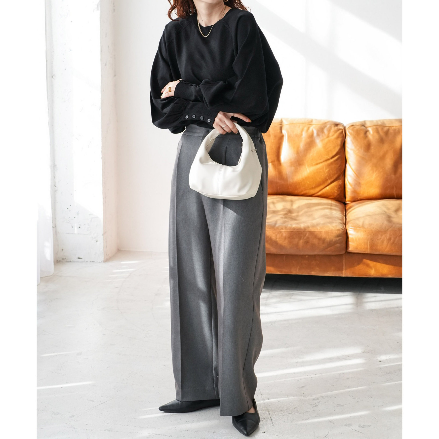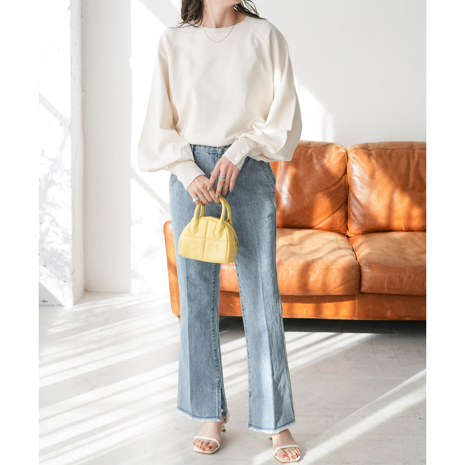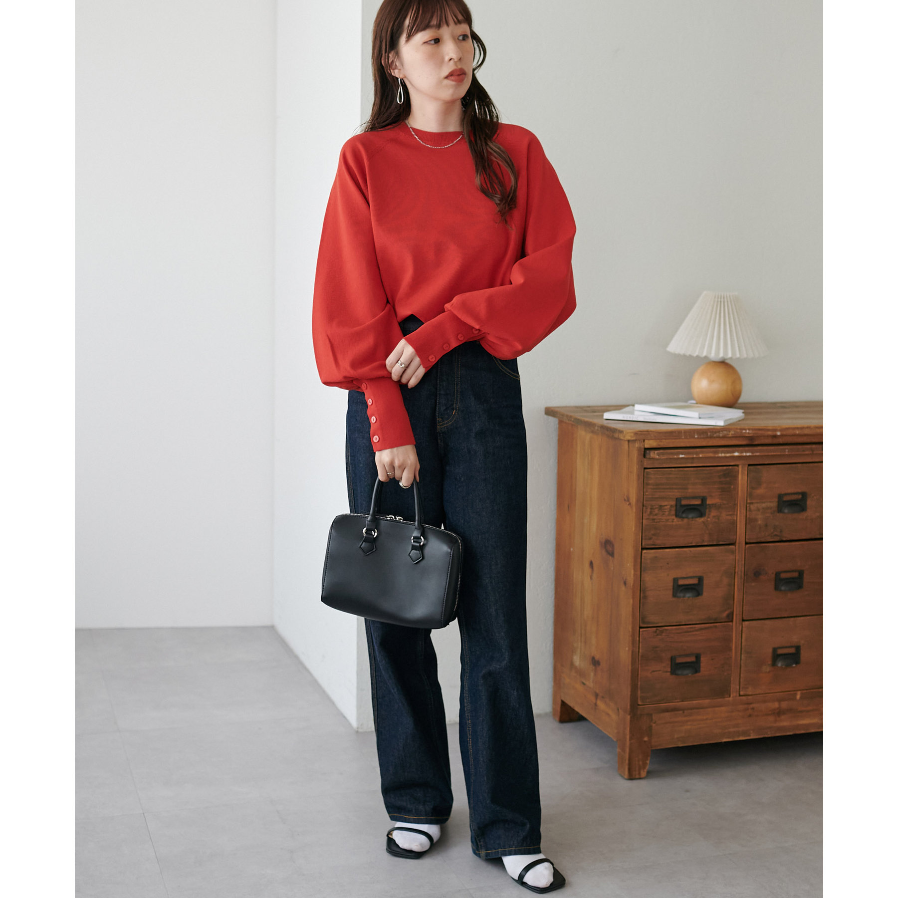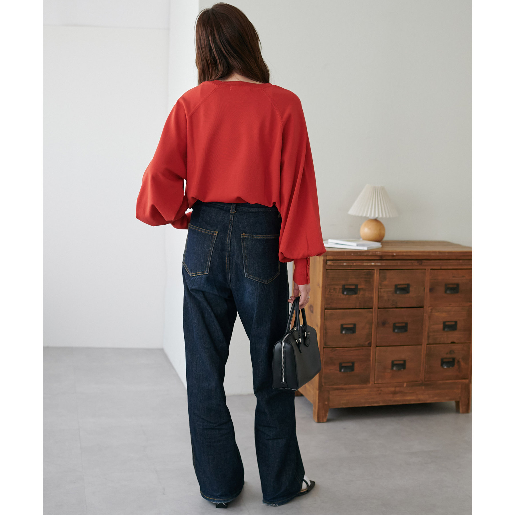 ラグラン切り替えに、丸みのあるボリュームスリーブがフェミニンな雰囲気を演出。