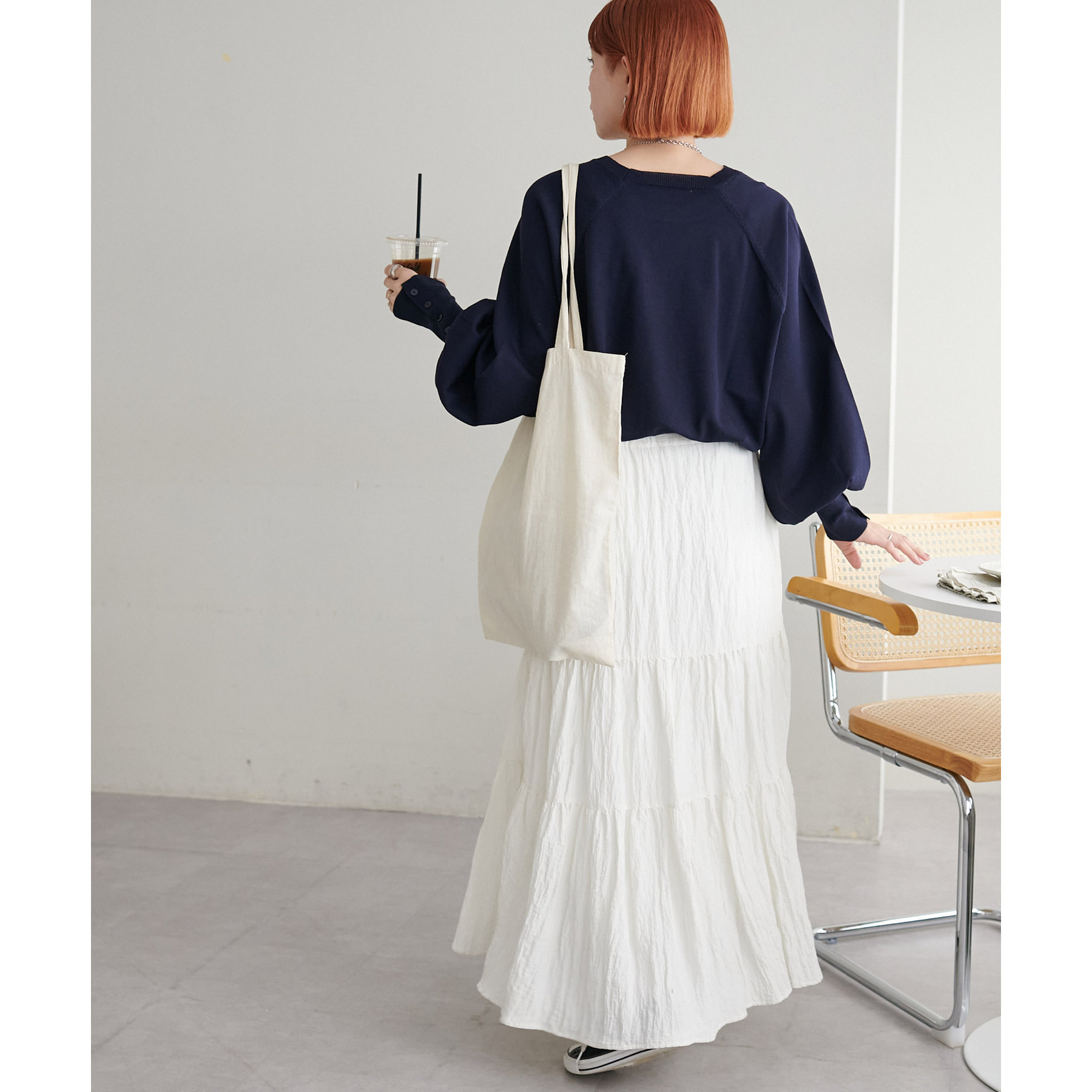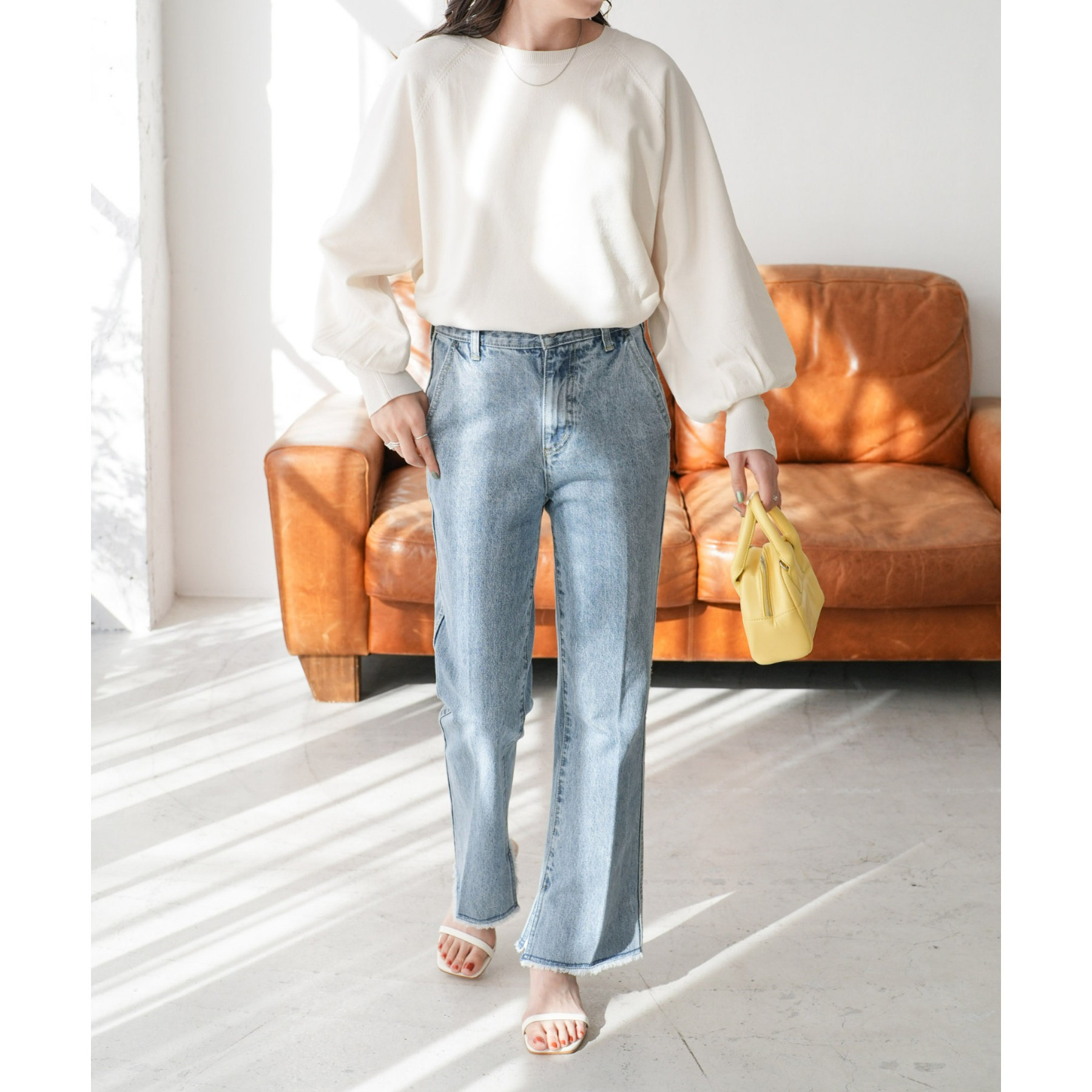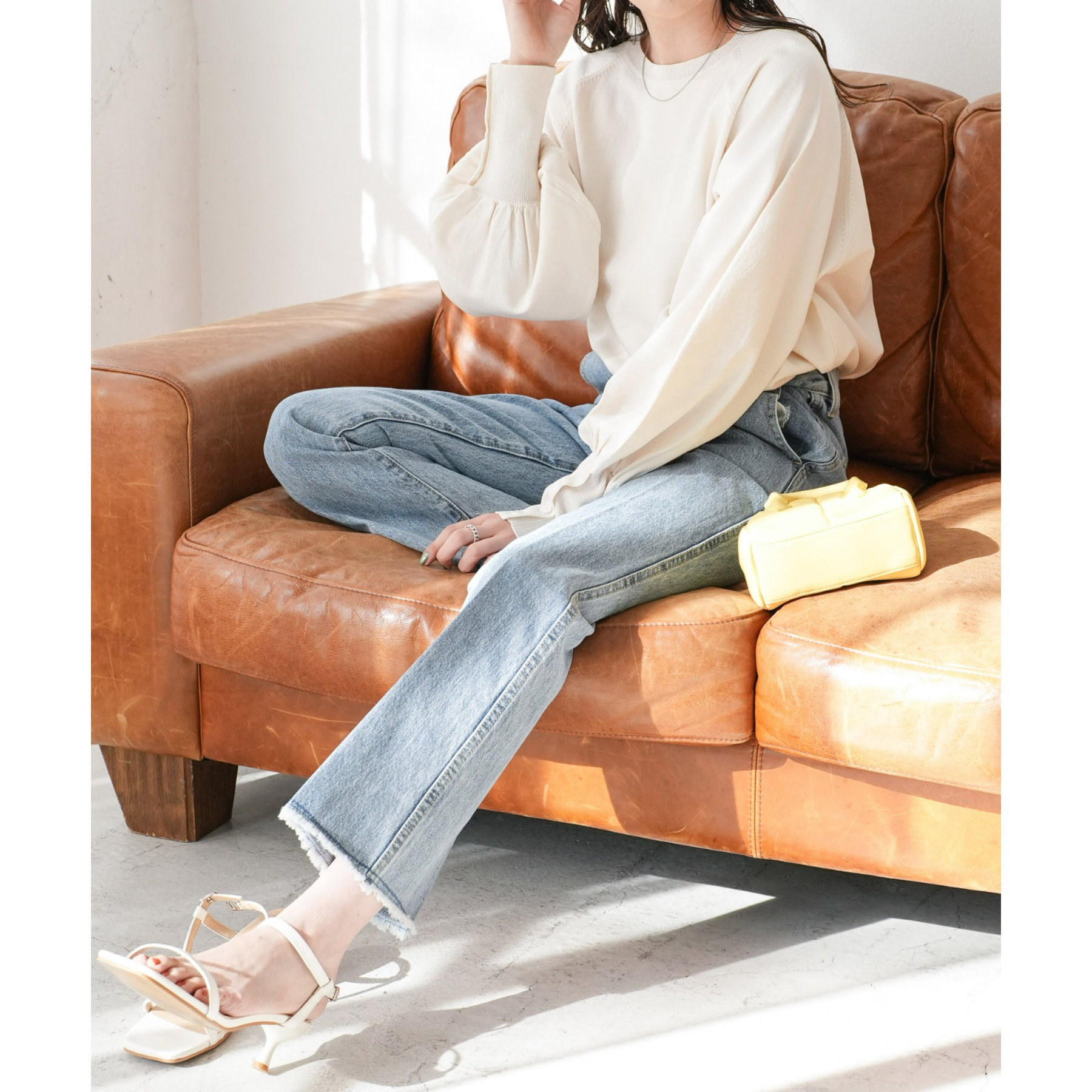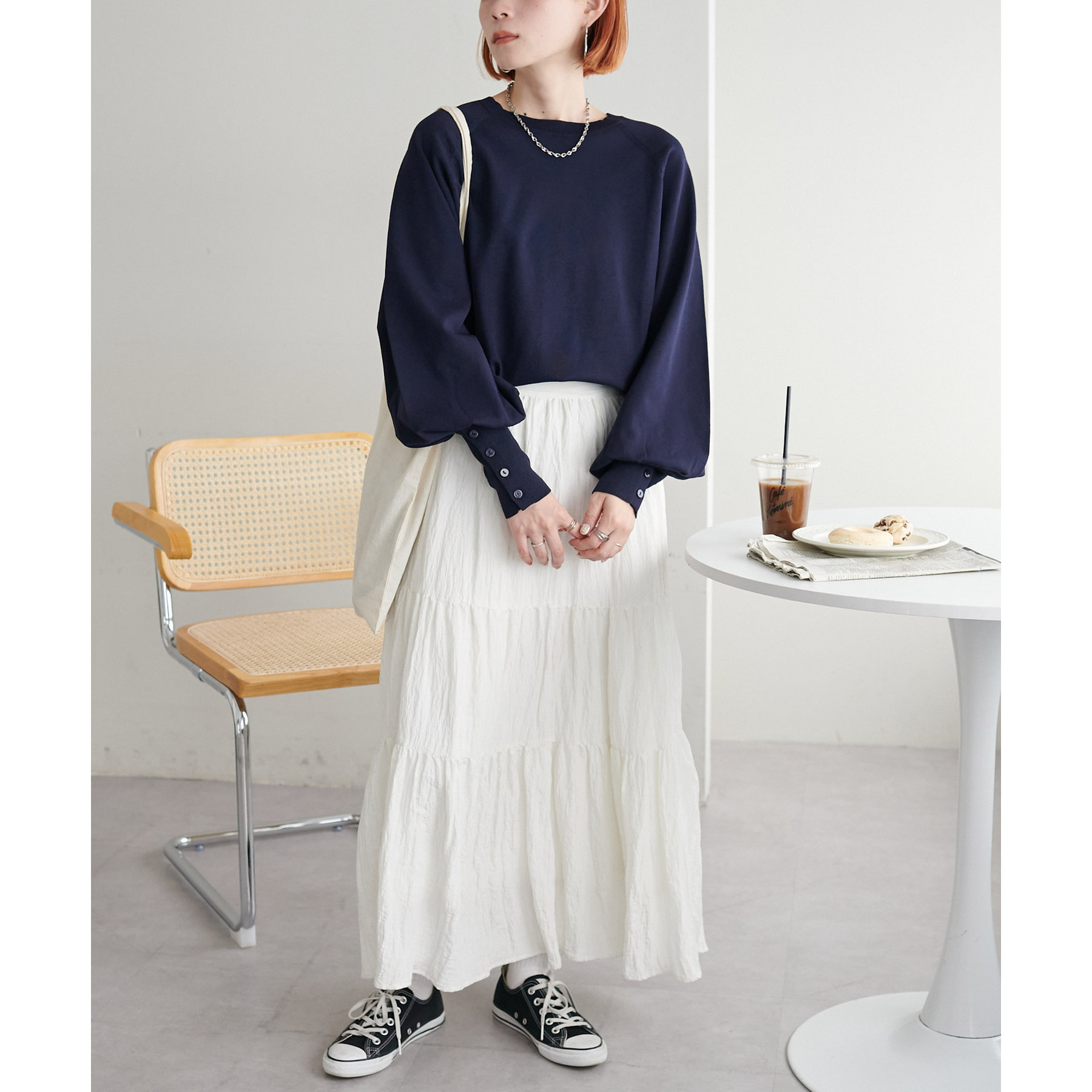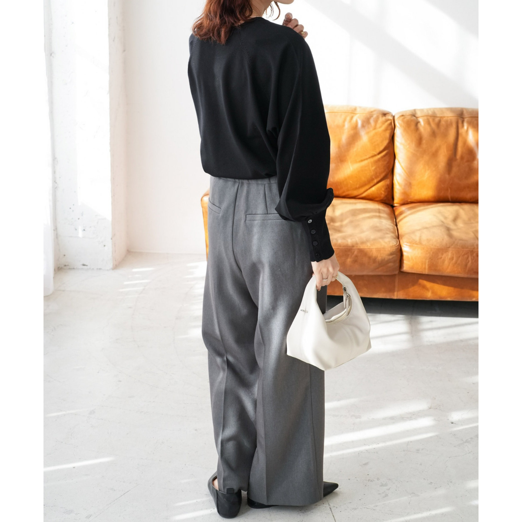 ラグラン切り替えに、丸みのあるボリュームスリーブがフェミニンな雰囲気を演出。