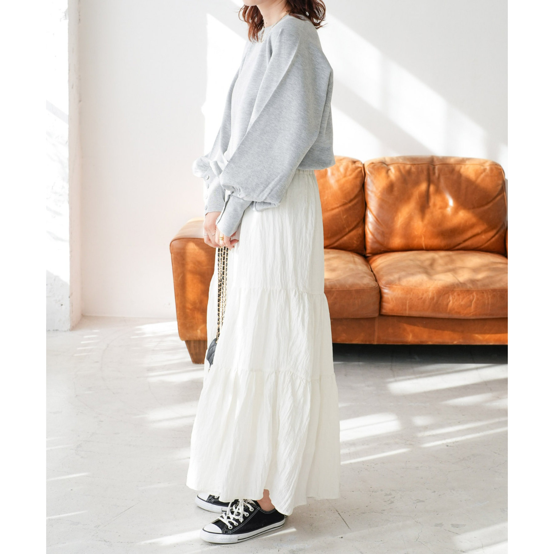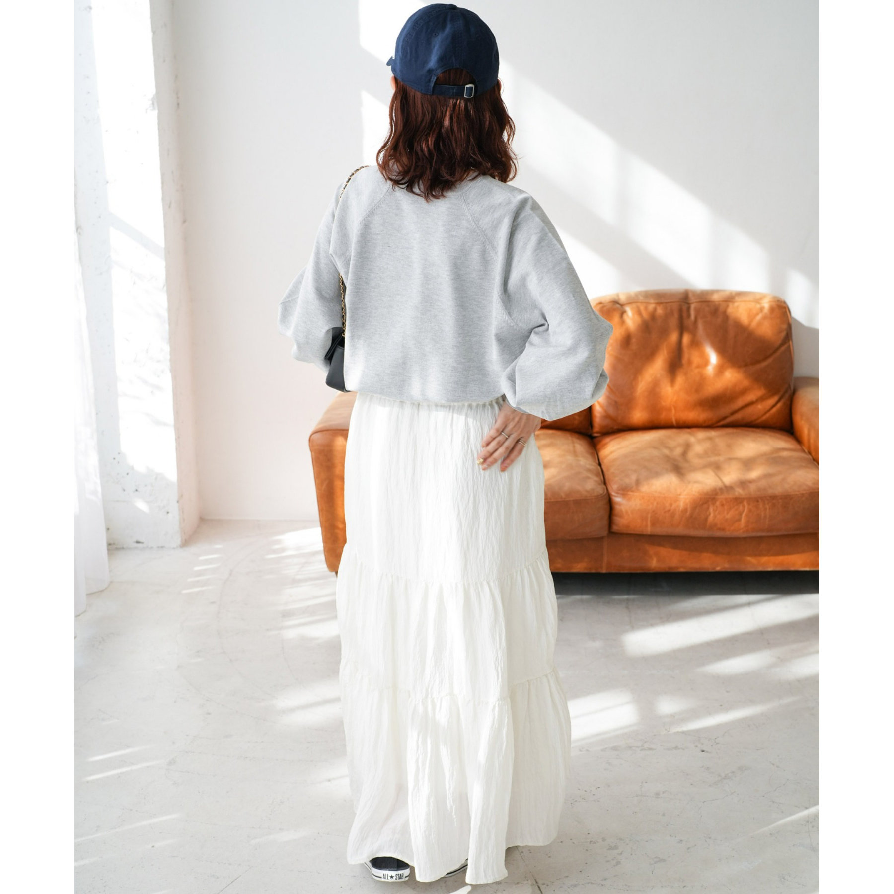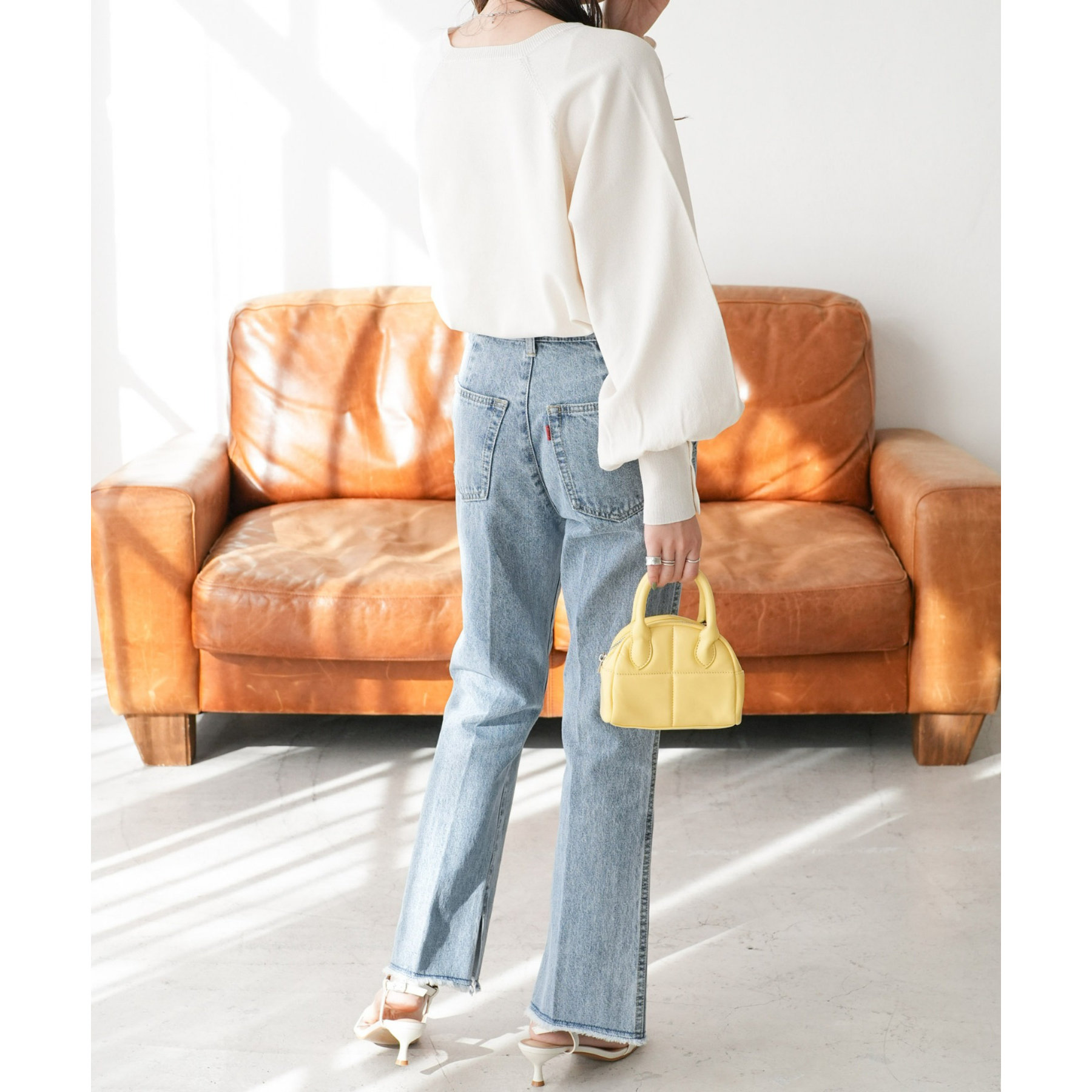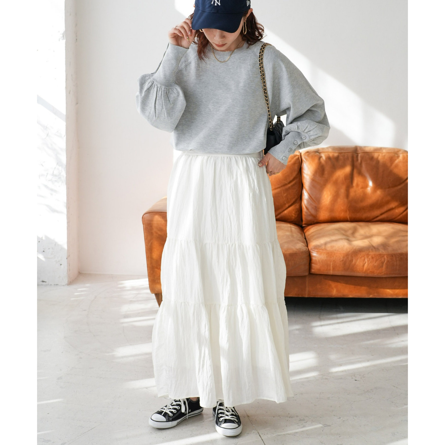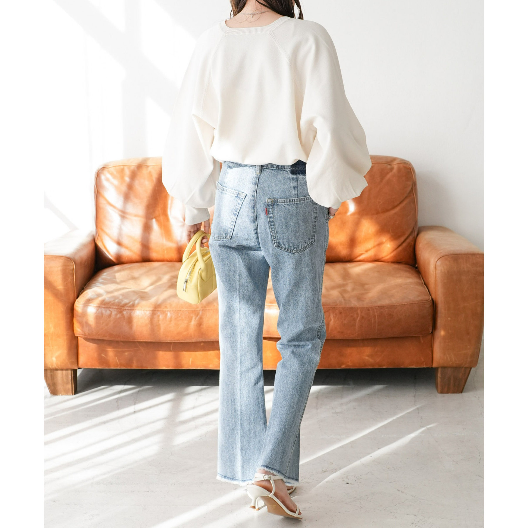 ラグラン切り替えに、丸みのあるボリュームスリーブがフェミニンな雰囲気を演出。