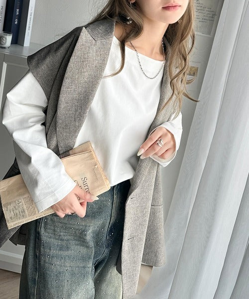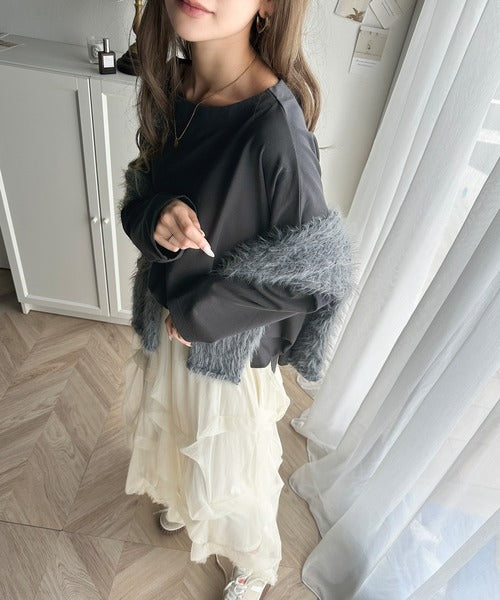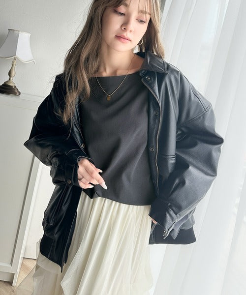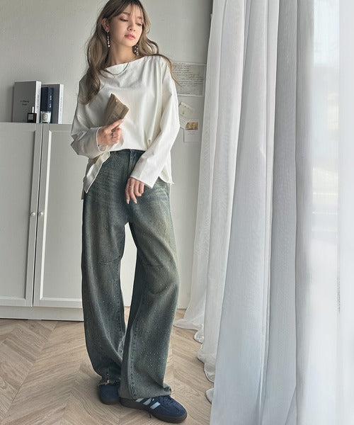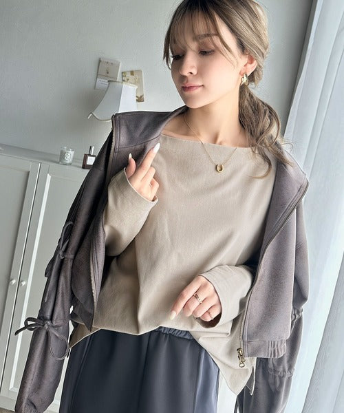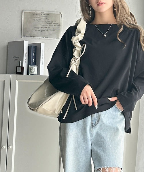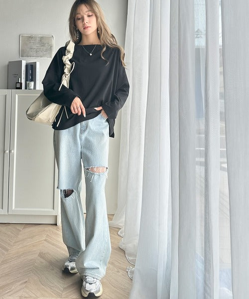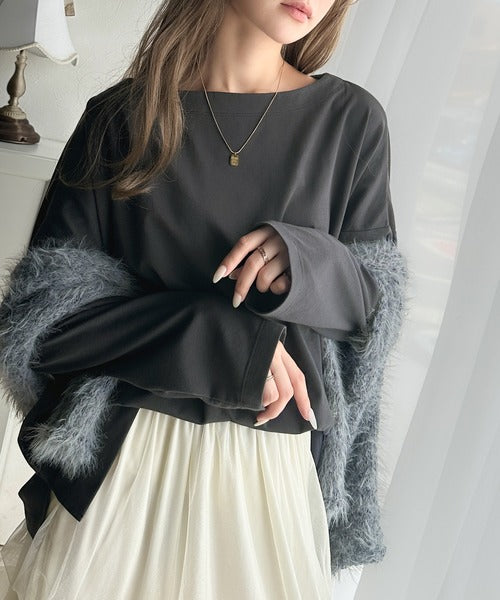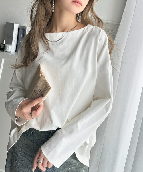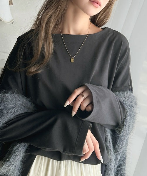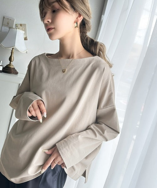 肩落ちシルエットにボートネックが上品な抜け感のロンT。