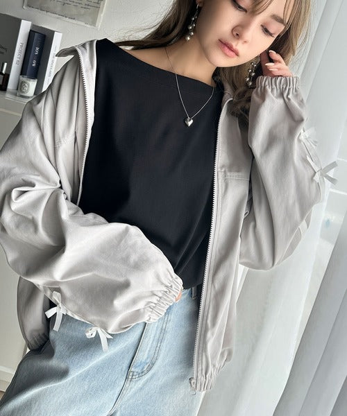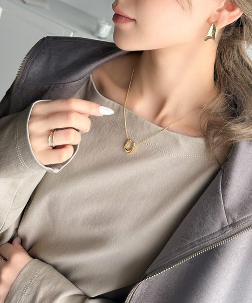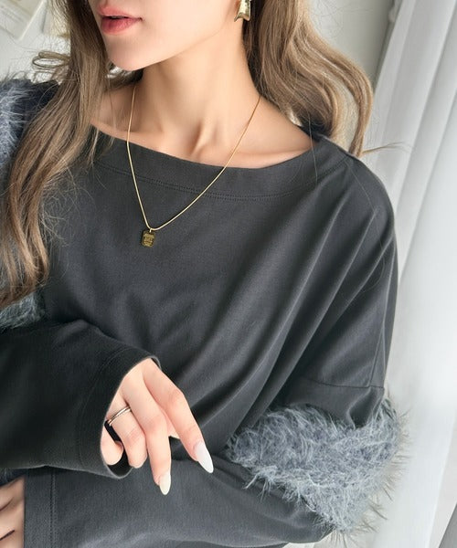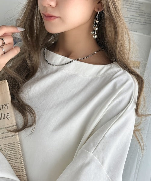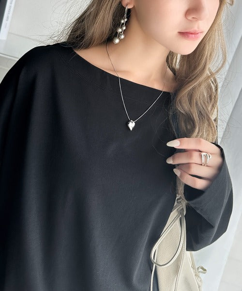 ボートネックデザインですっきりとした首元にはネックレスを合わせるとより一層オシャレな雰囲気に。