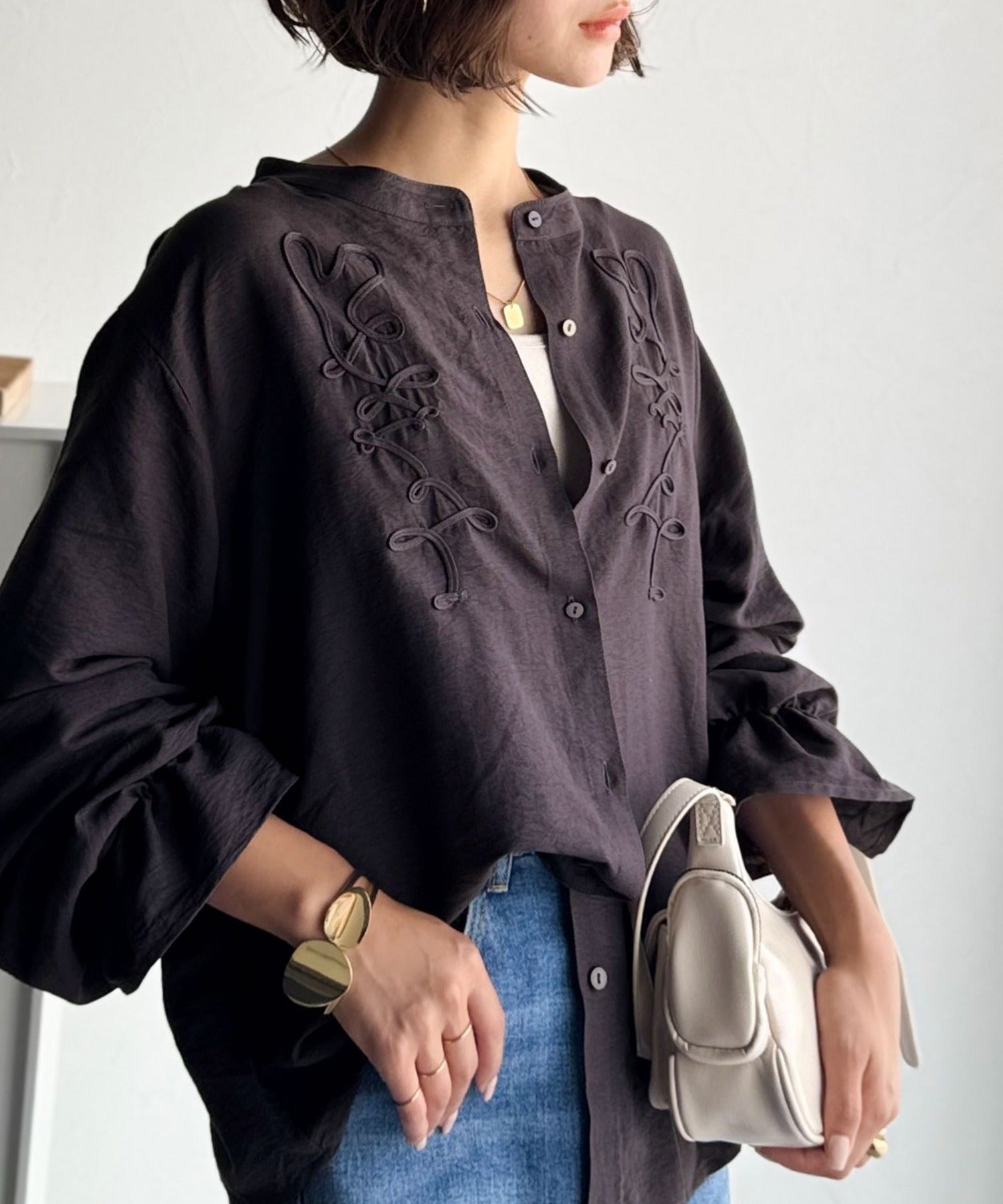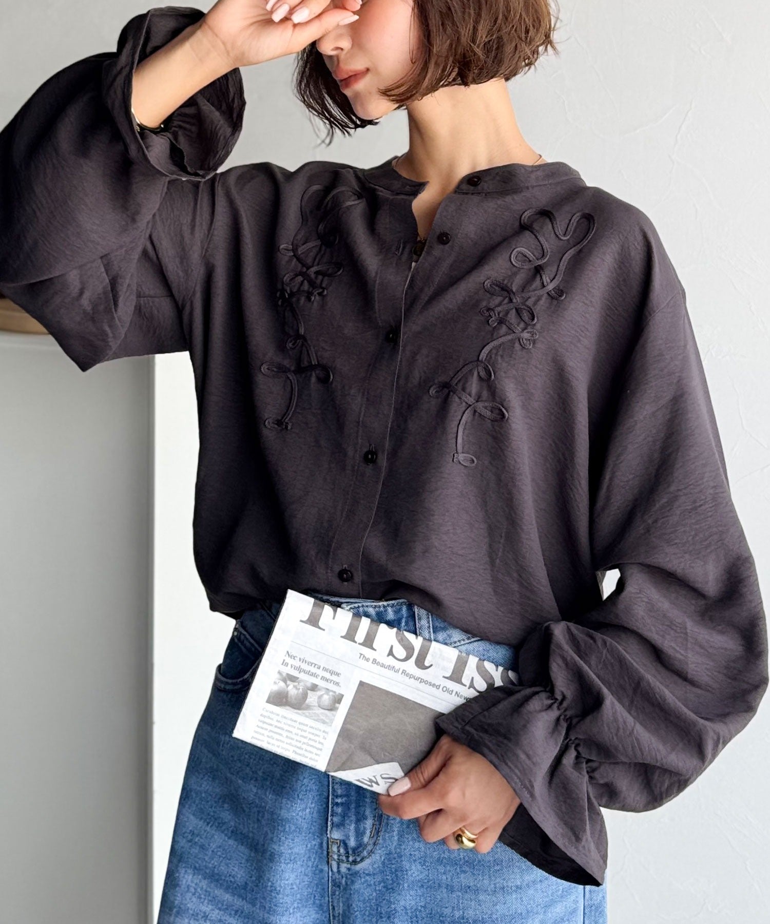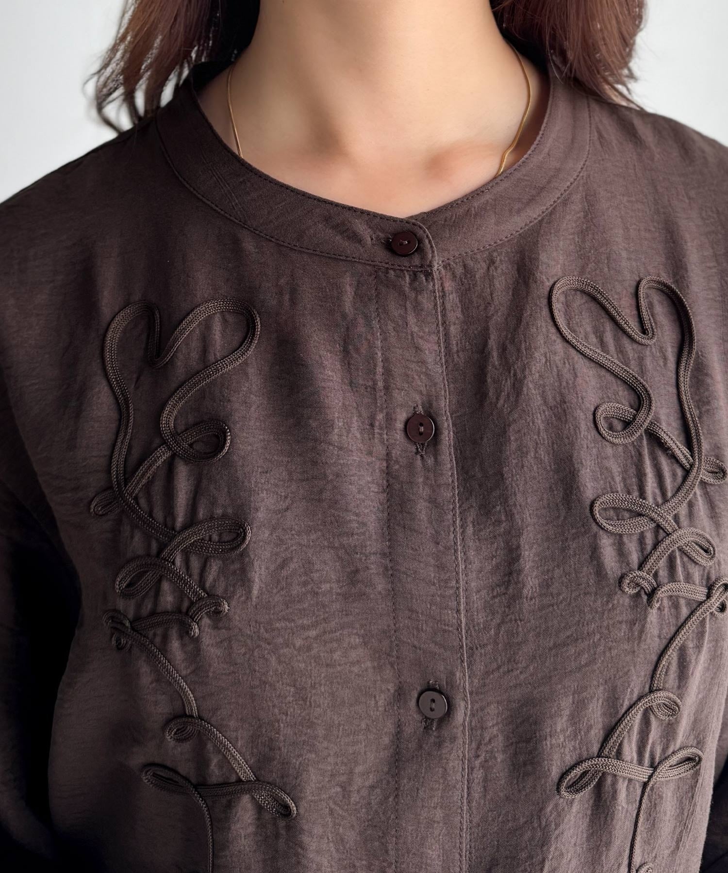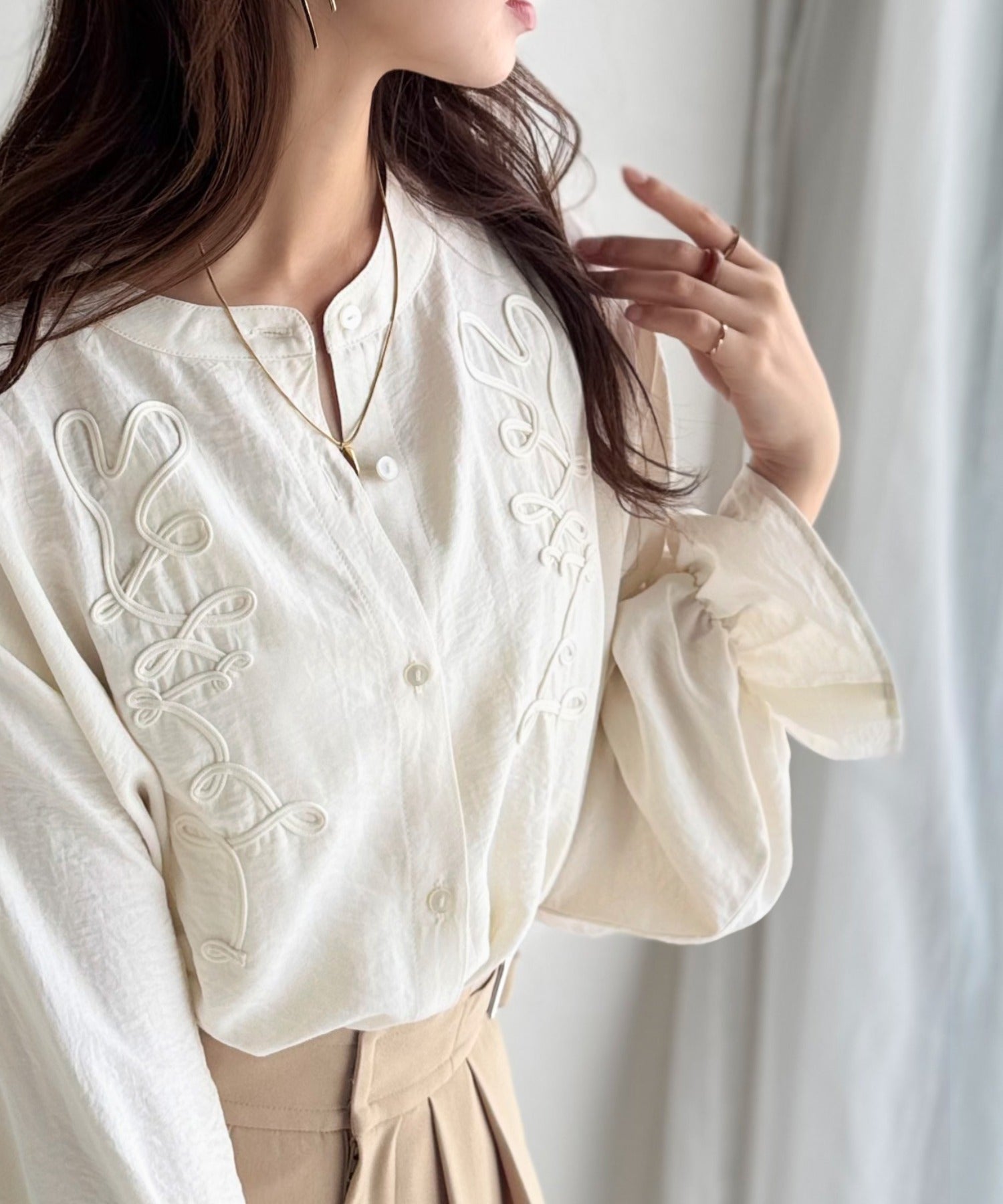 ぽこっと立体感のあるコード刺繍を施した、華やかさと着やすさを兼ねたシャツ♪