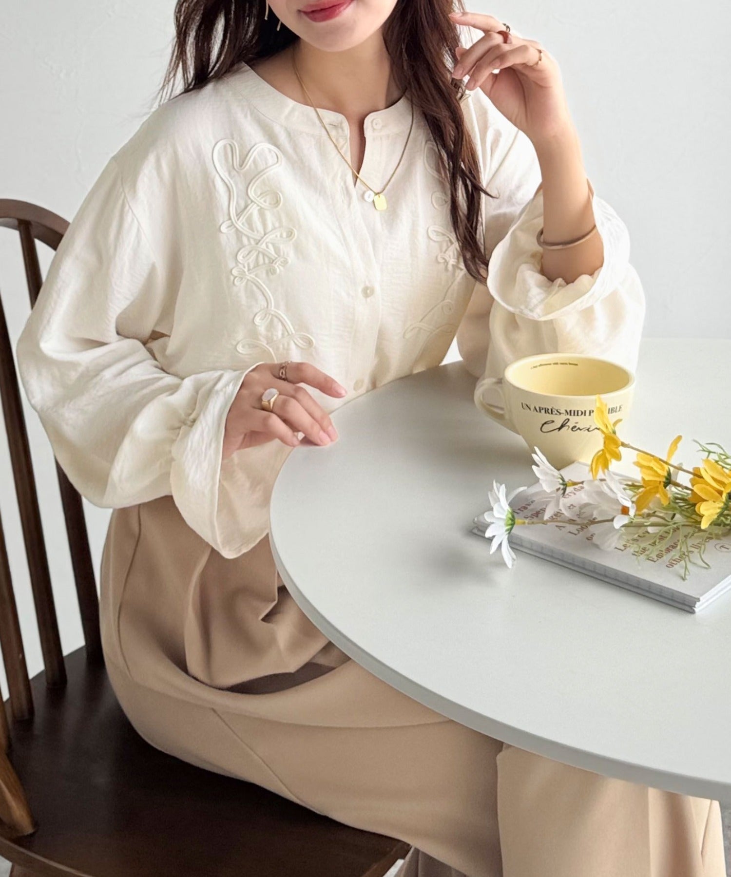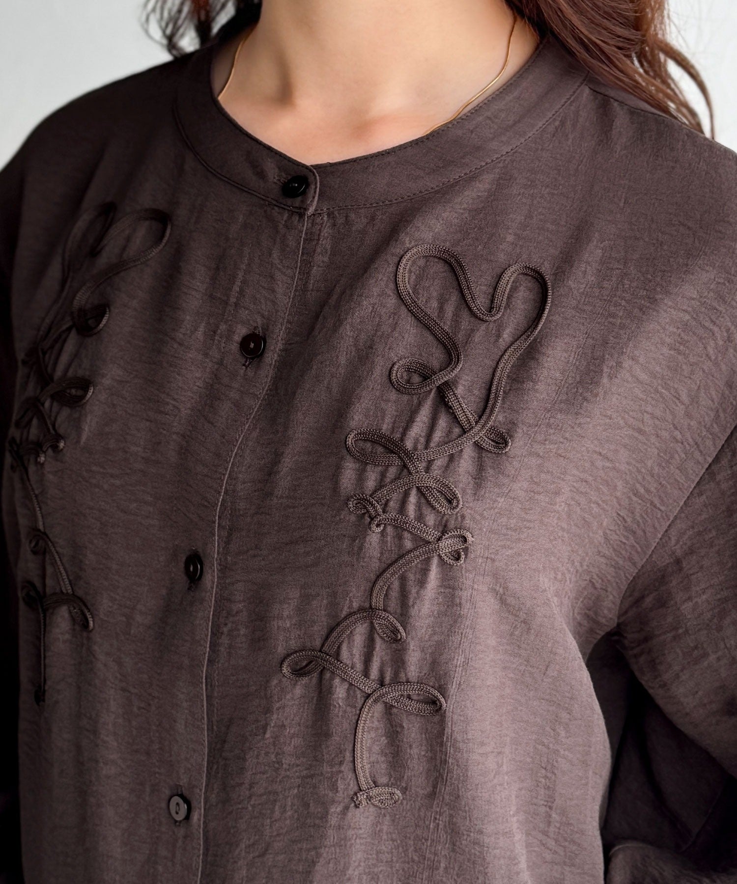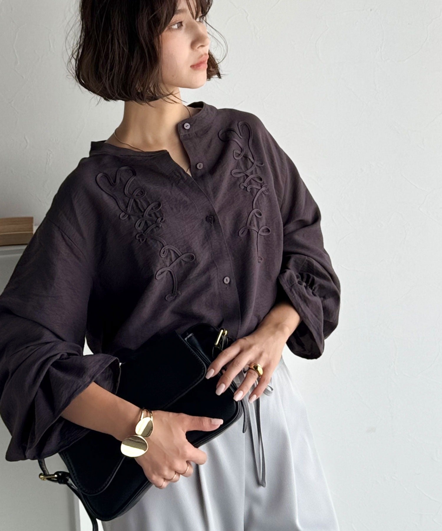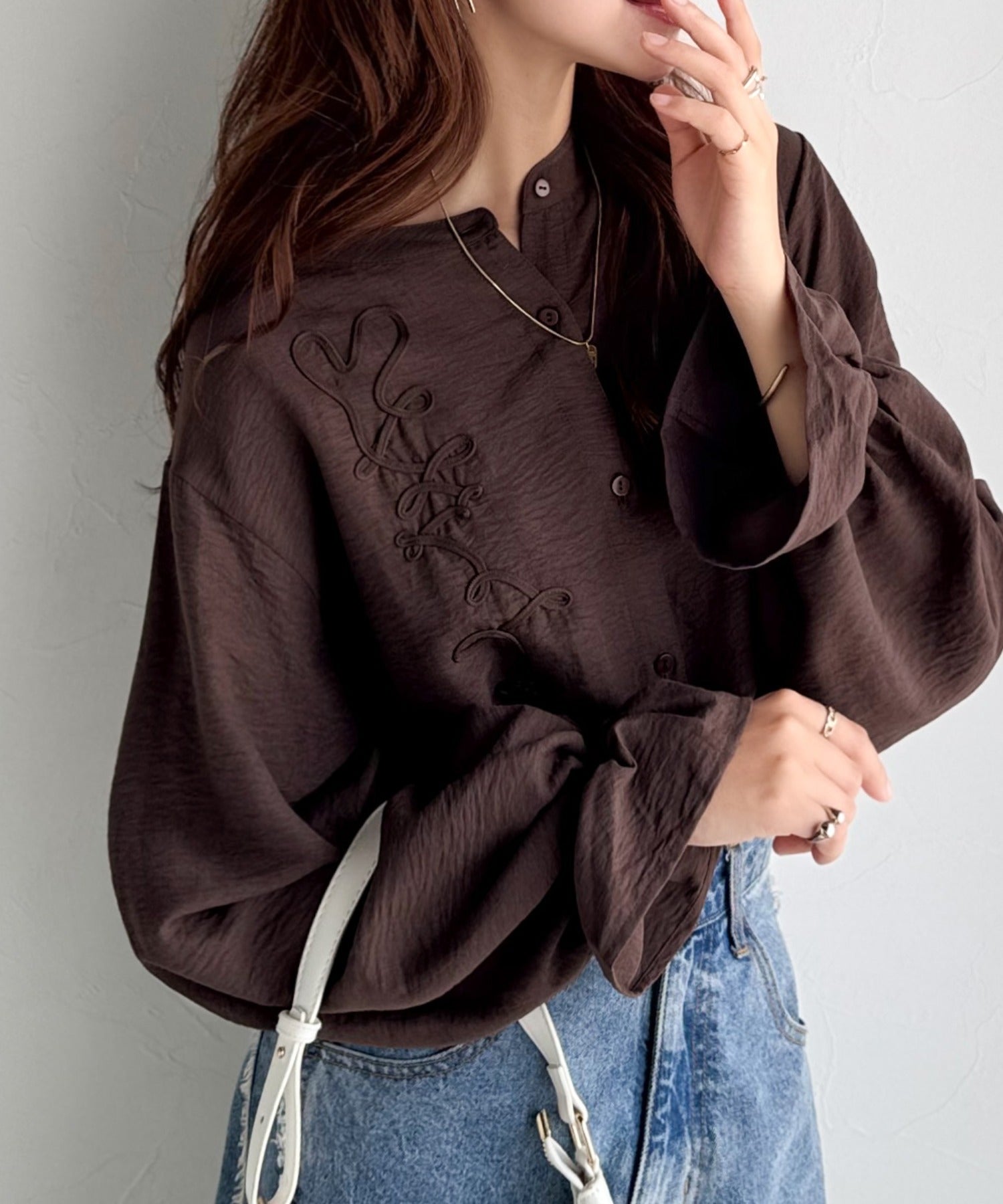 ぽこっと立体感のあるコード刺繍を施した、華やかさと着やすさを兼ねたシャツ♪