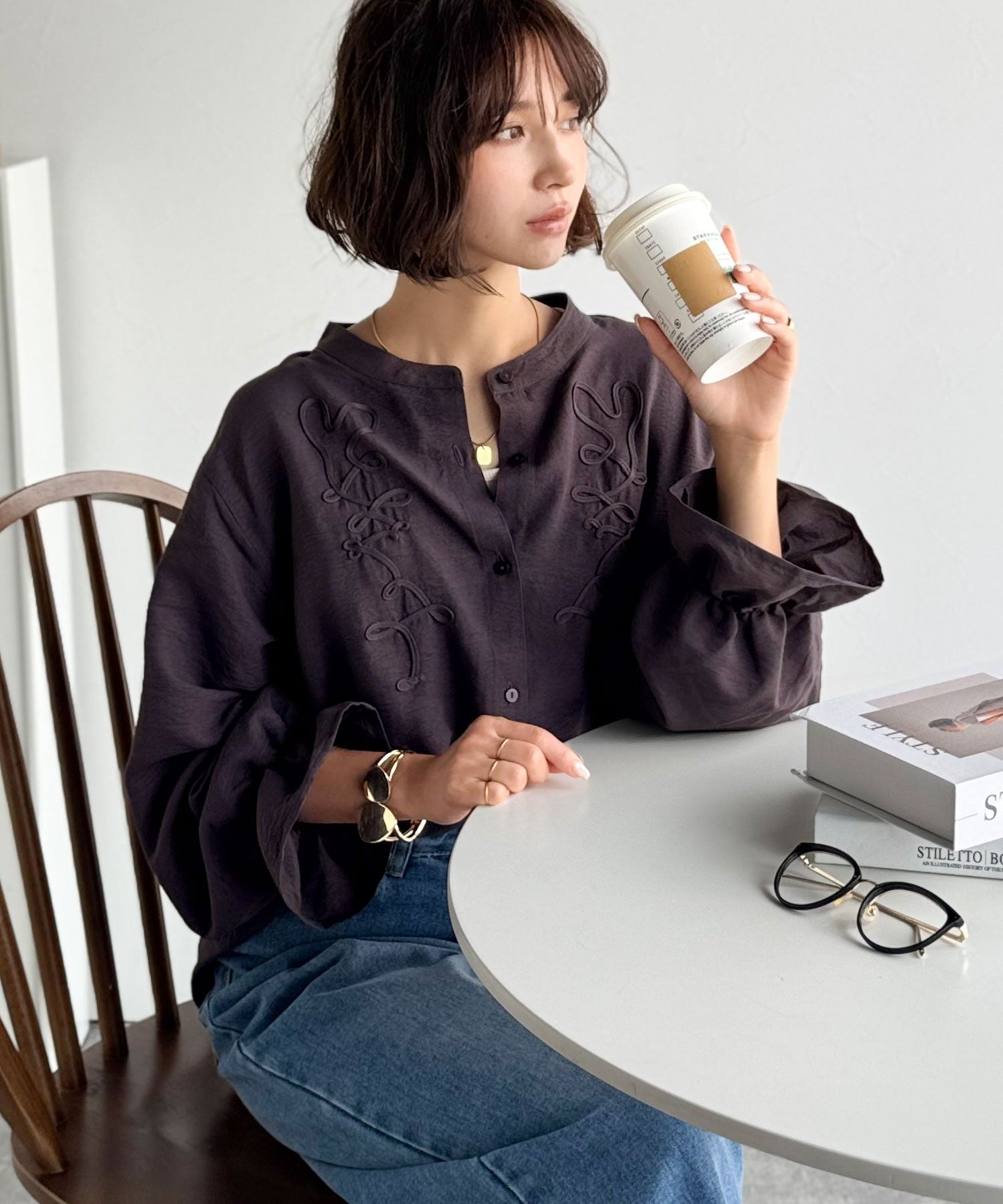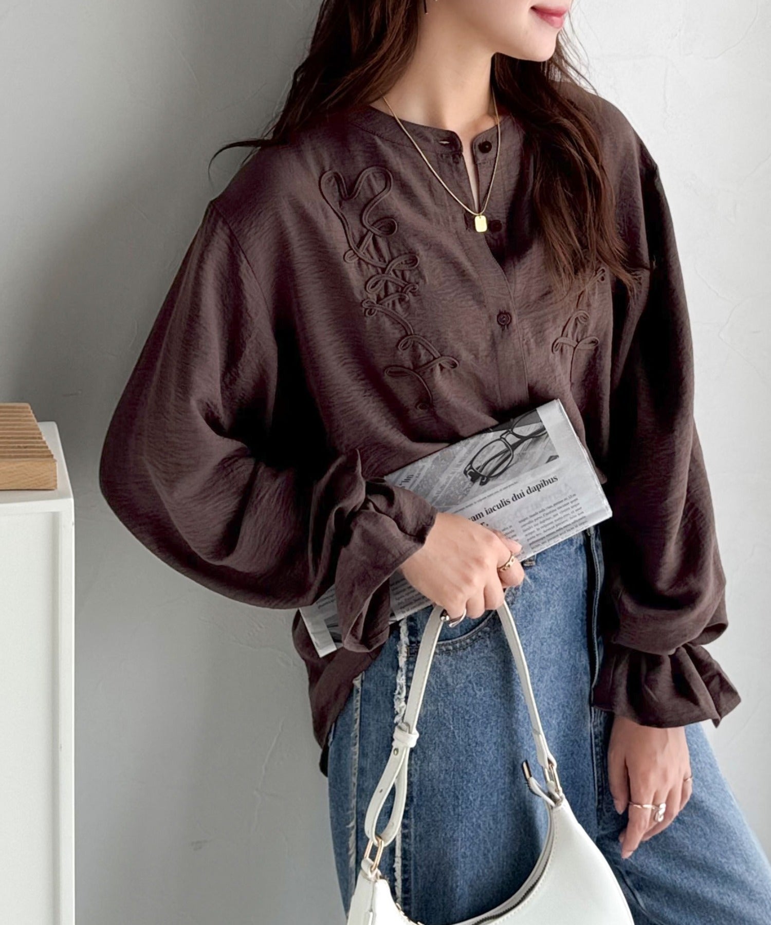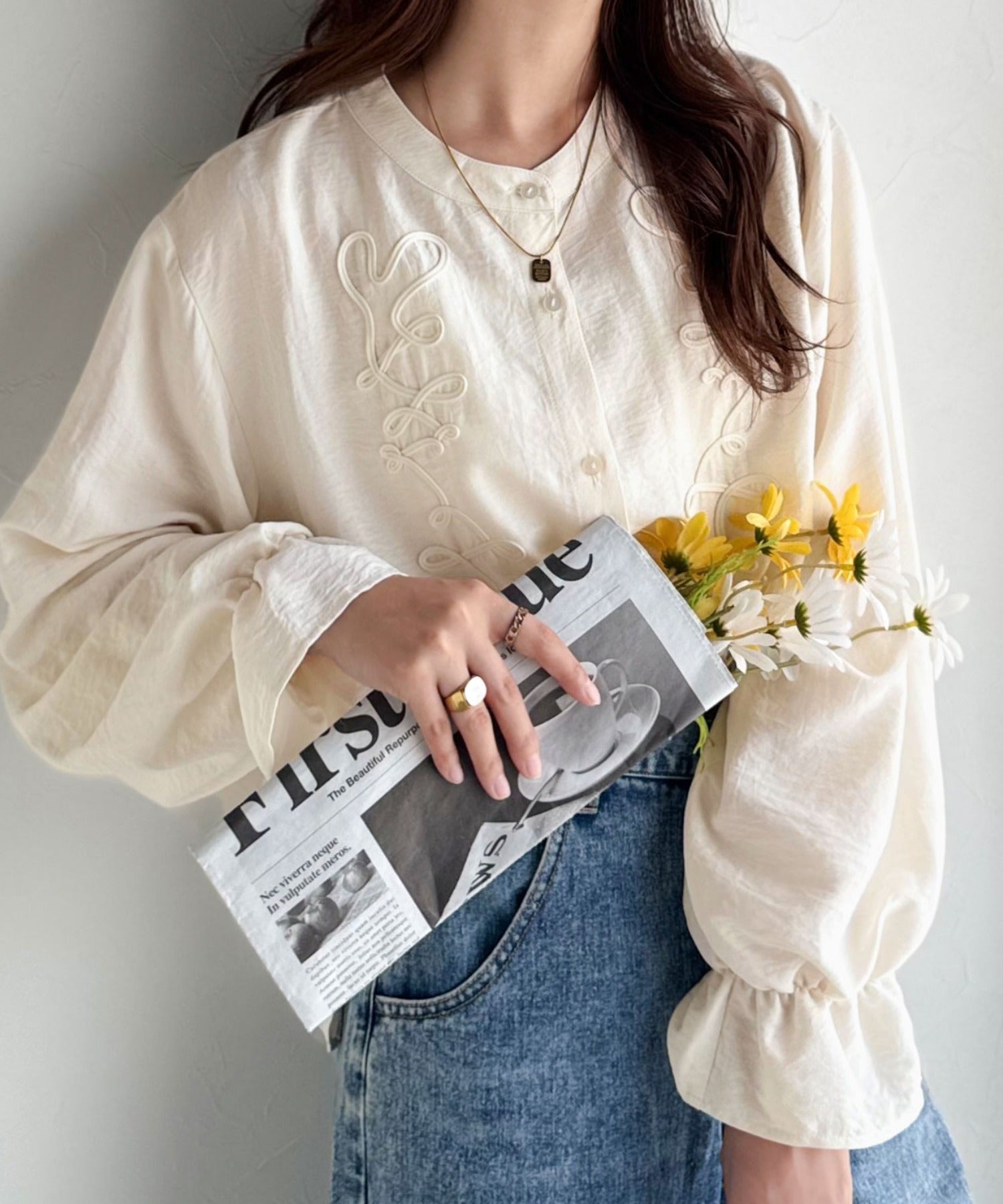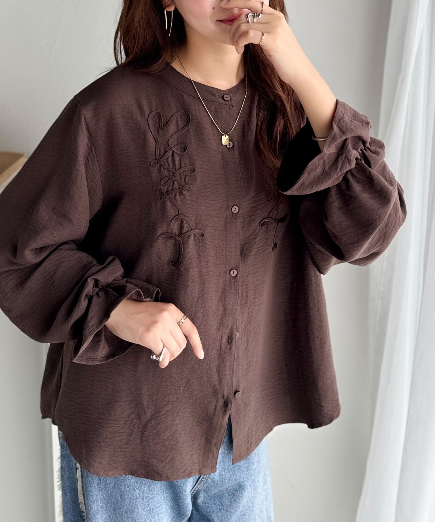 ぽこっと立体感のあるコード刺繍を施した、華やかさと着やすさを兼ねたシャツ♪