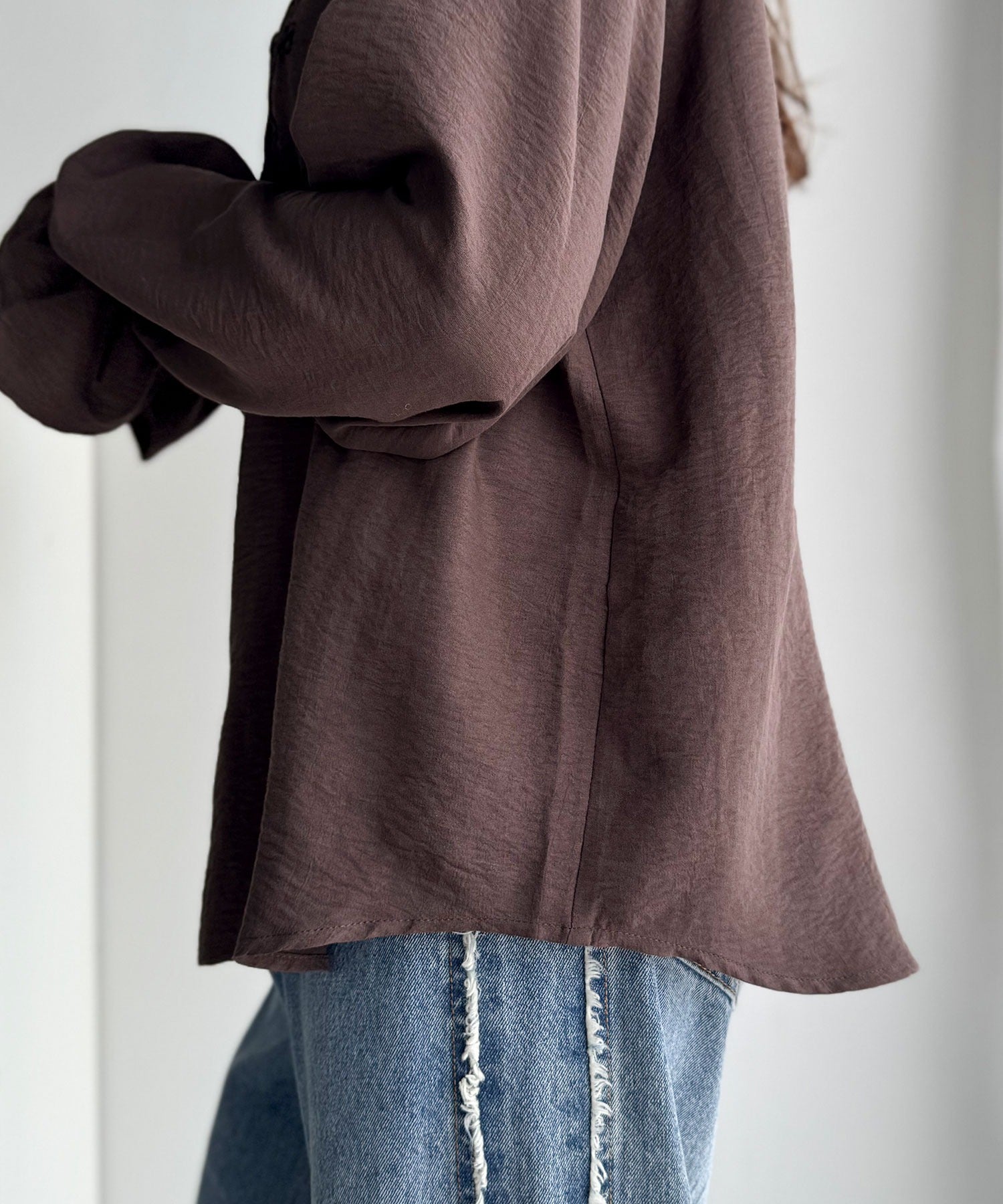 しぼ感のあるパウダーデシン素材。軽やかで肌なじみも良く、春秋にぴったりです。