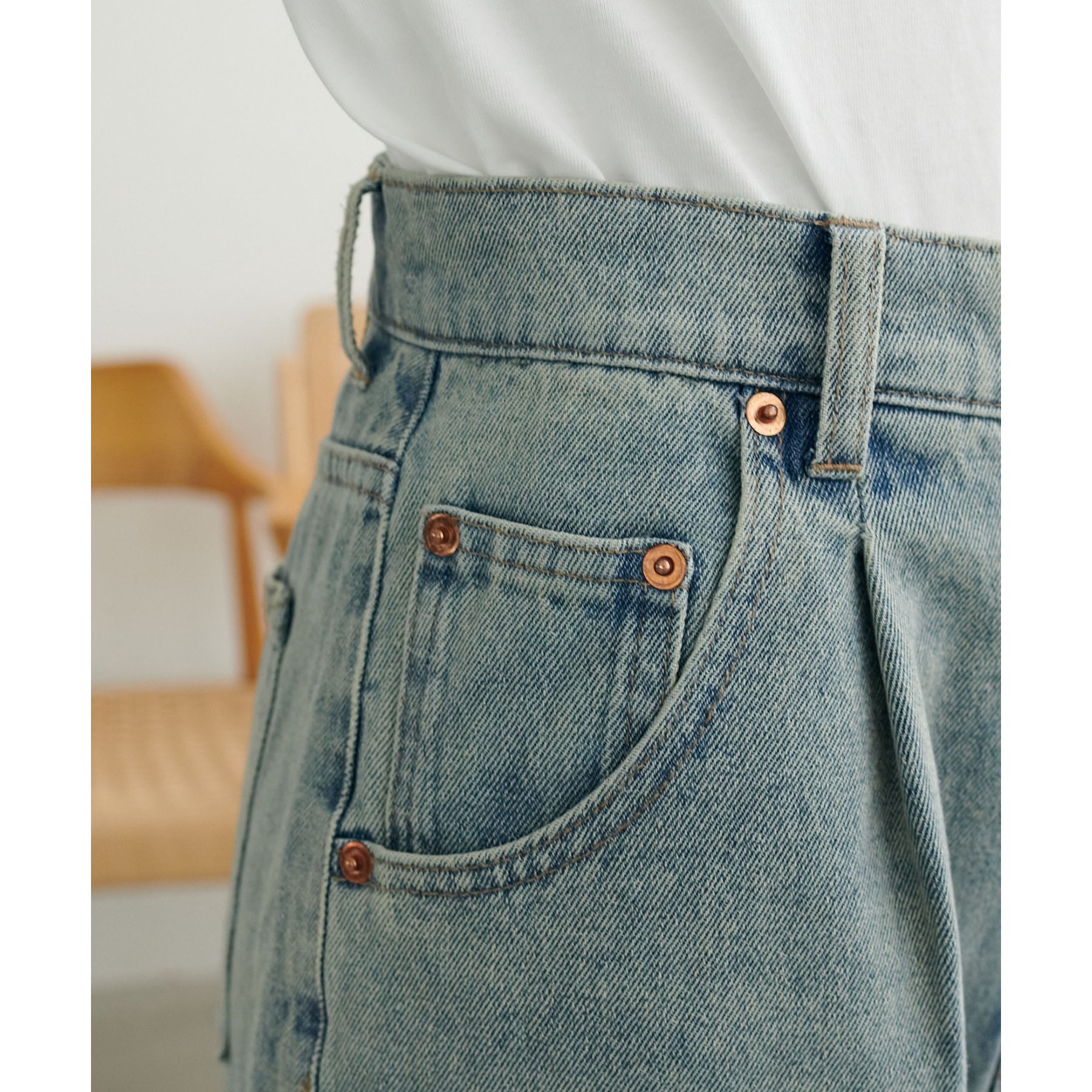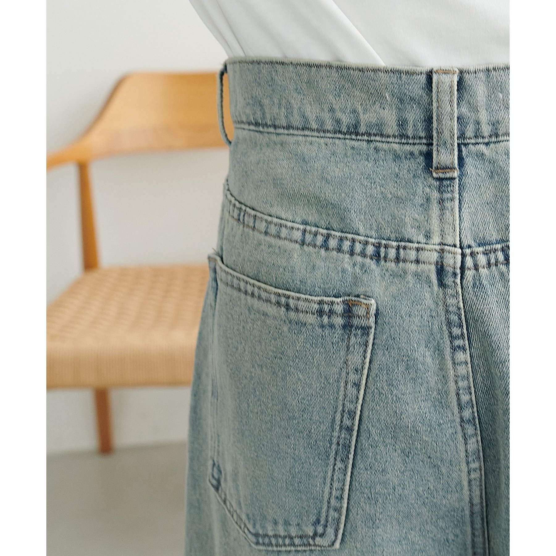 また、オーバーダイ加工を施すことで、単調にならない奥行きのある色味に。ヴィンテージ感のある風合いが、大人カジュアルにぴったりです。ウエスト位置は高めに設定されており、脚長効果も抜群。ボディラインを拾いすぎないので、体型カバーにも◎