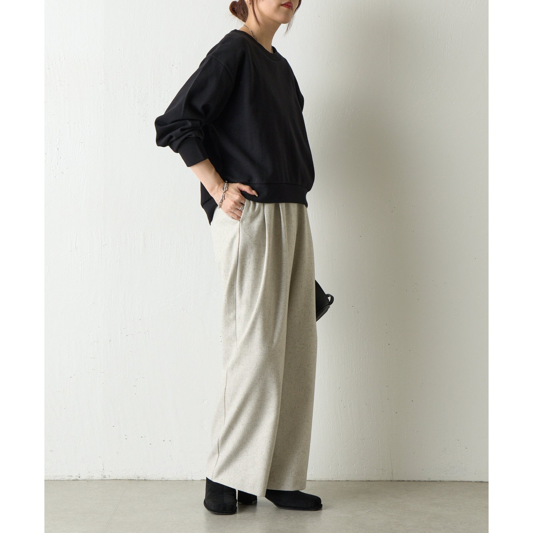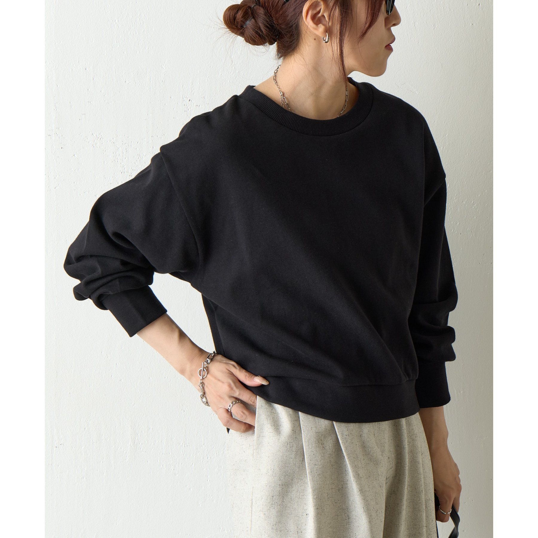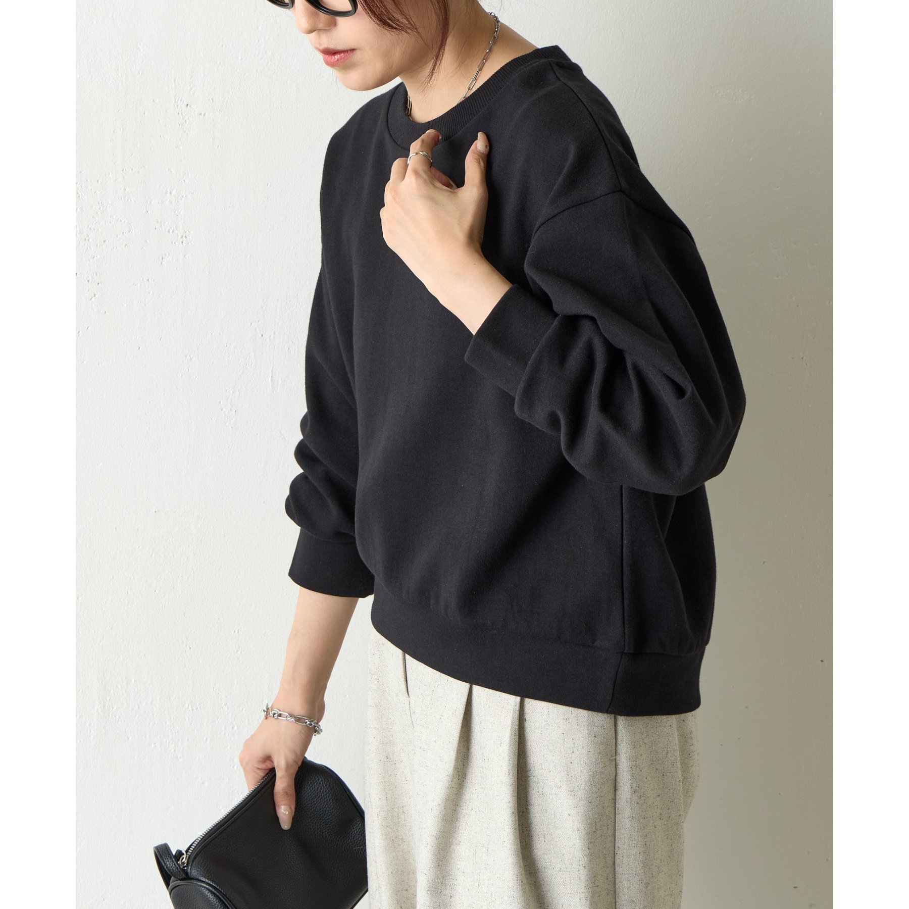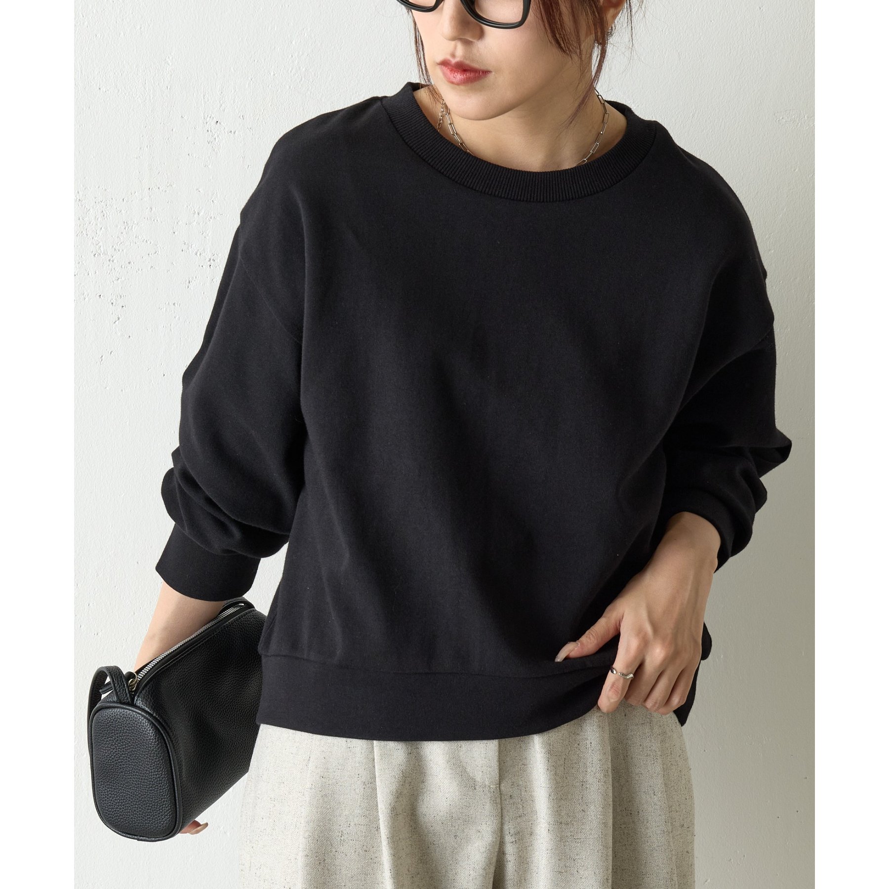 袖口や裾のリブ切替がメリハリを生み、バランスよく着こなせます。
