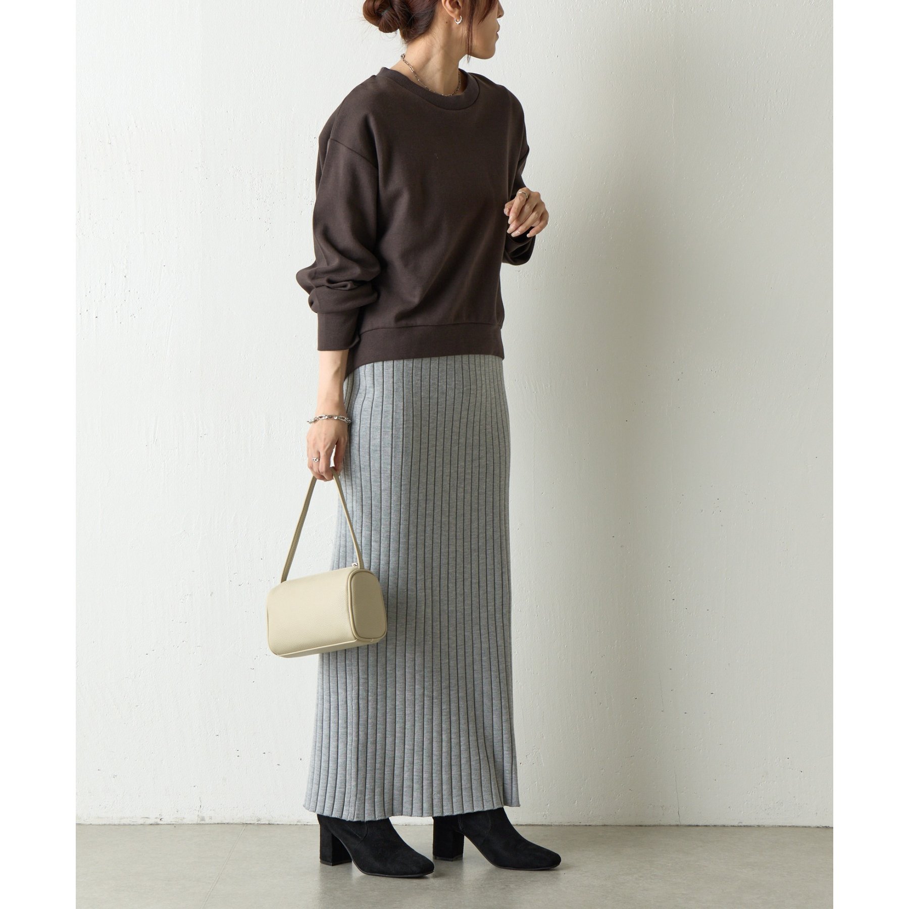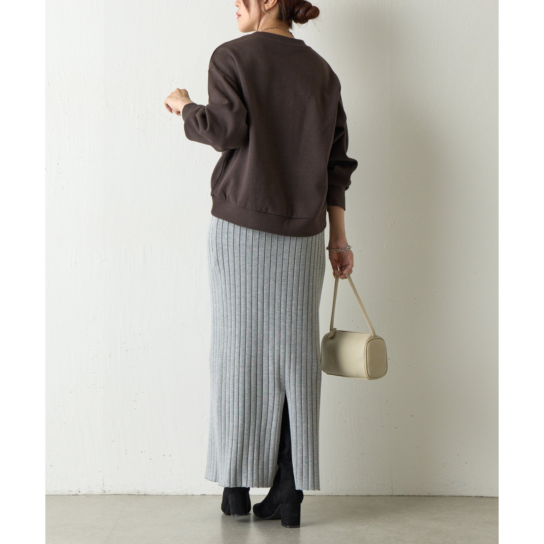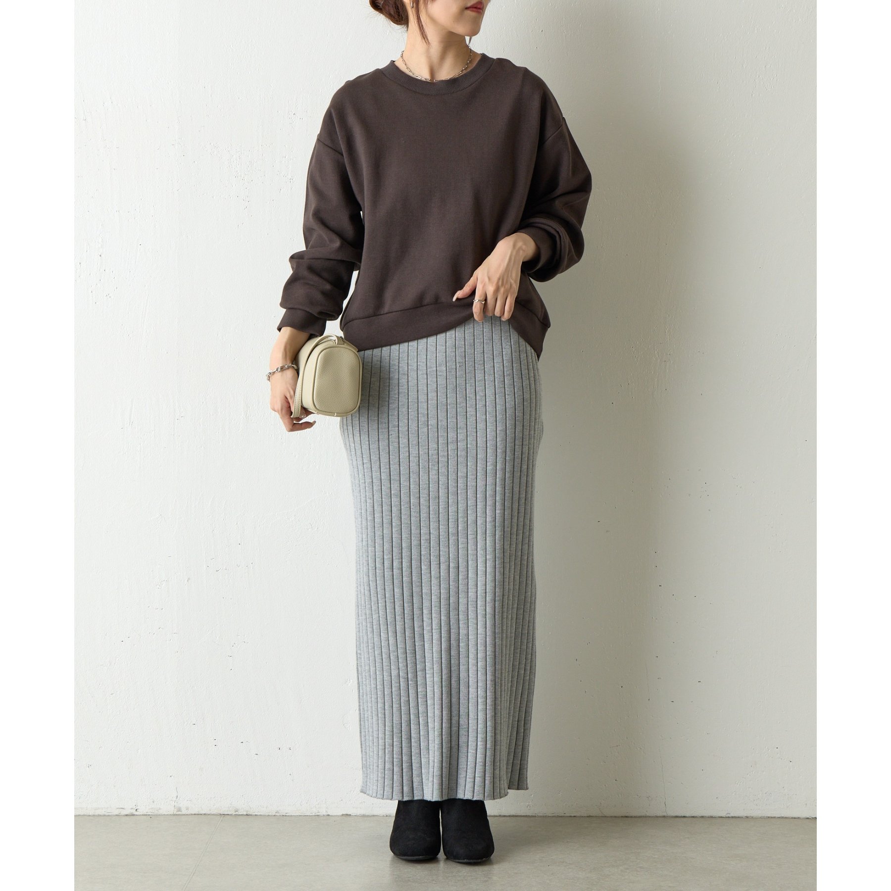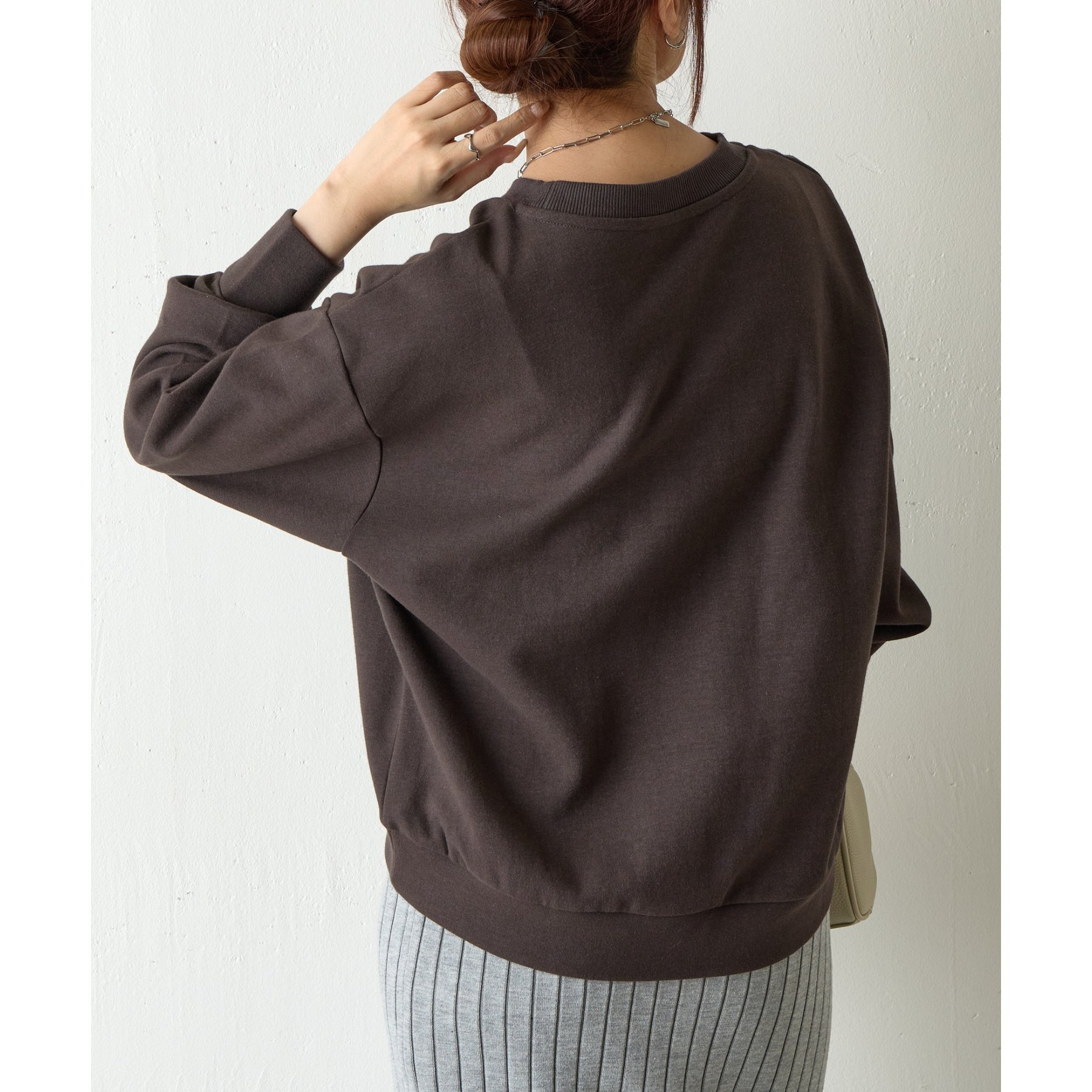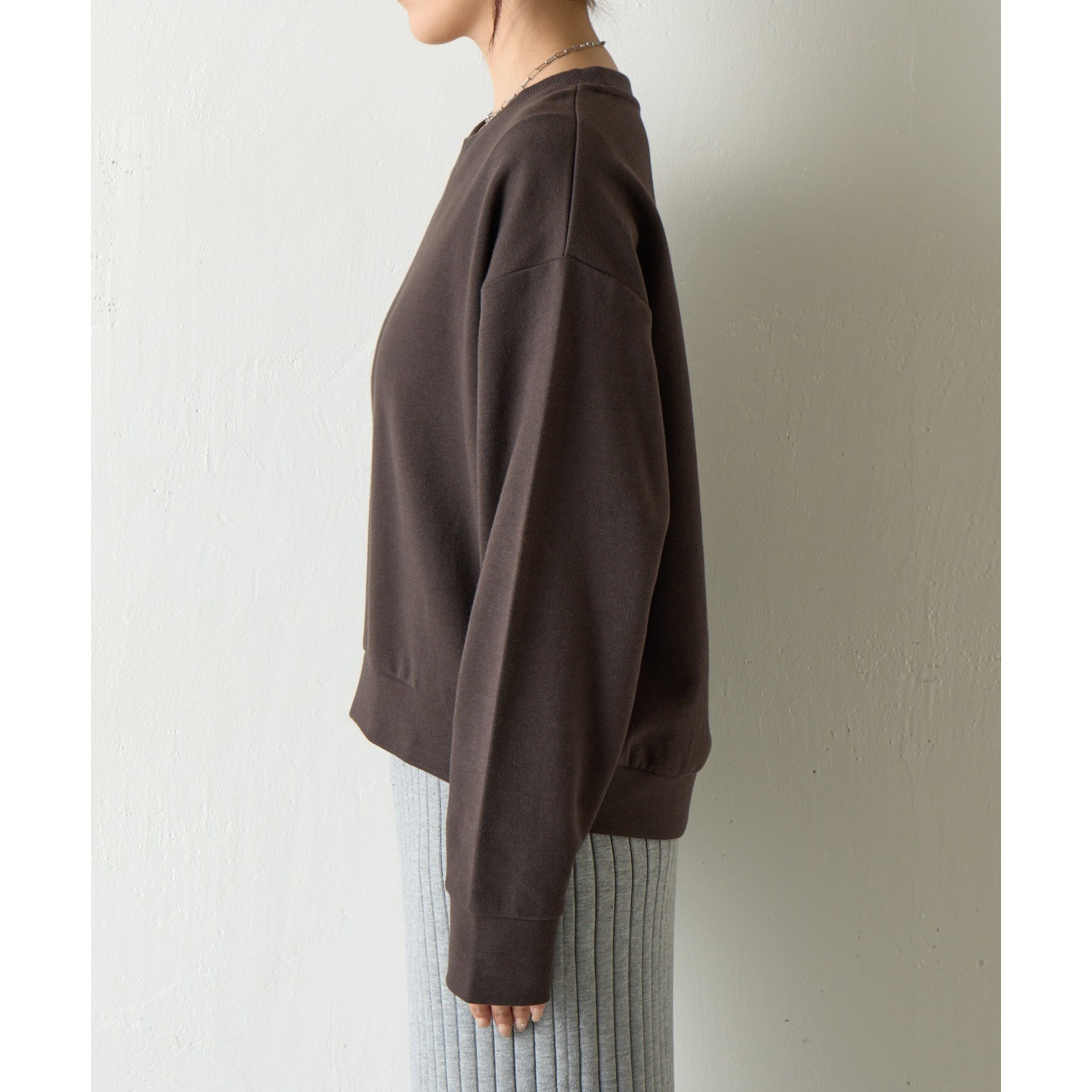 袖口や裾のリブ切替がメリハリを生み、バランスよく着こなせます。