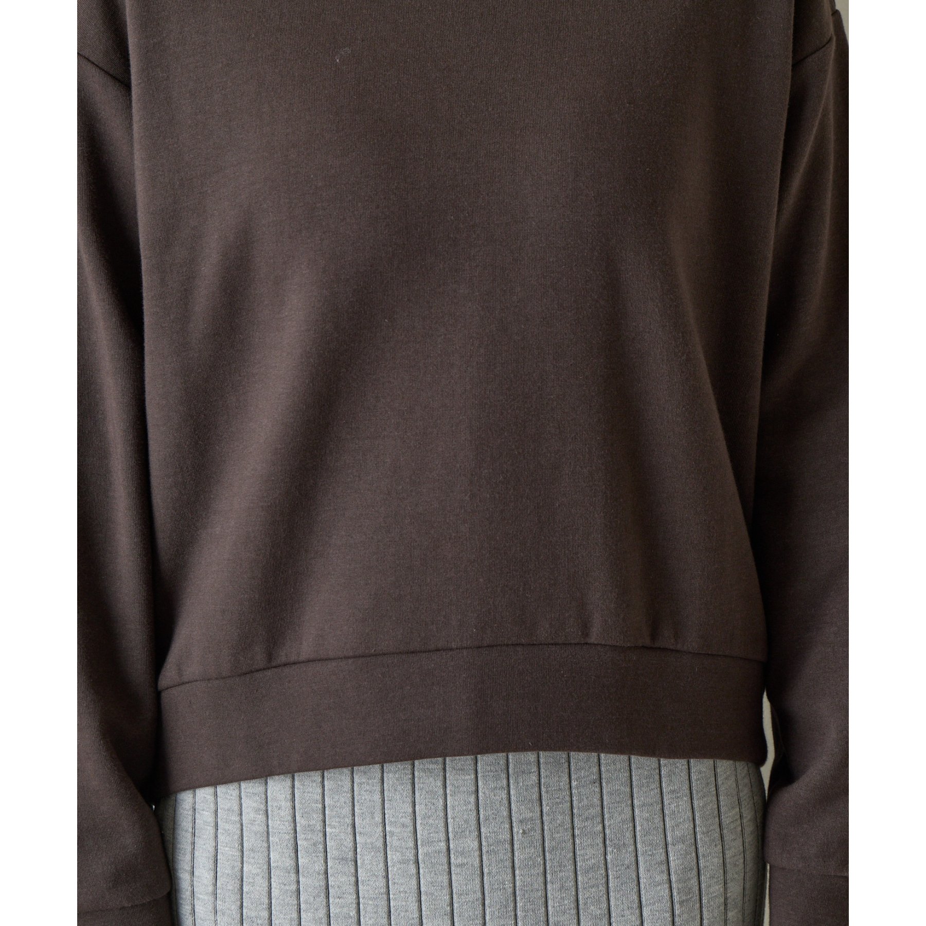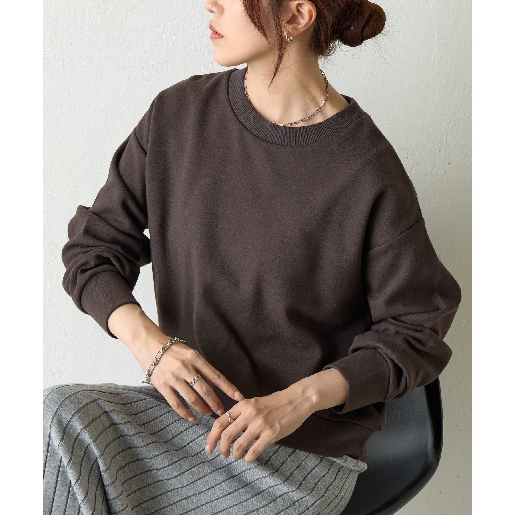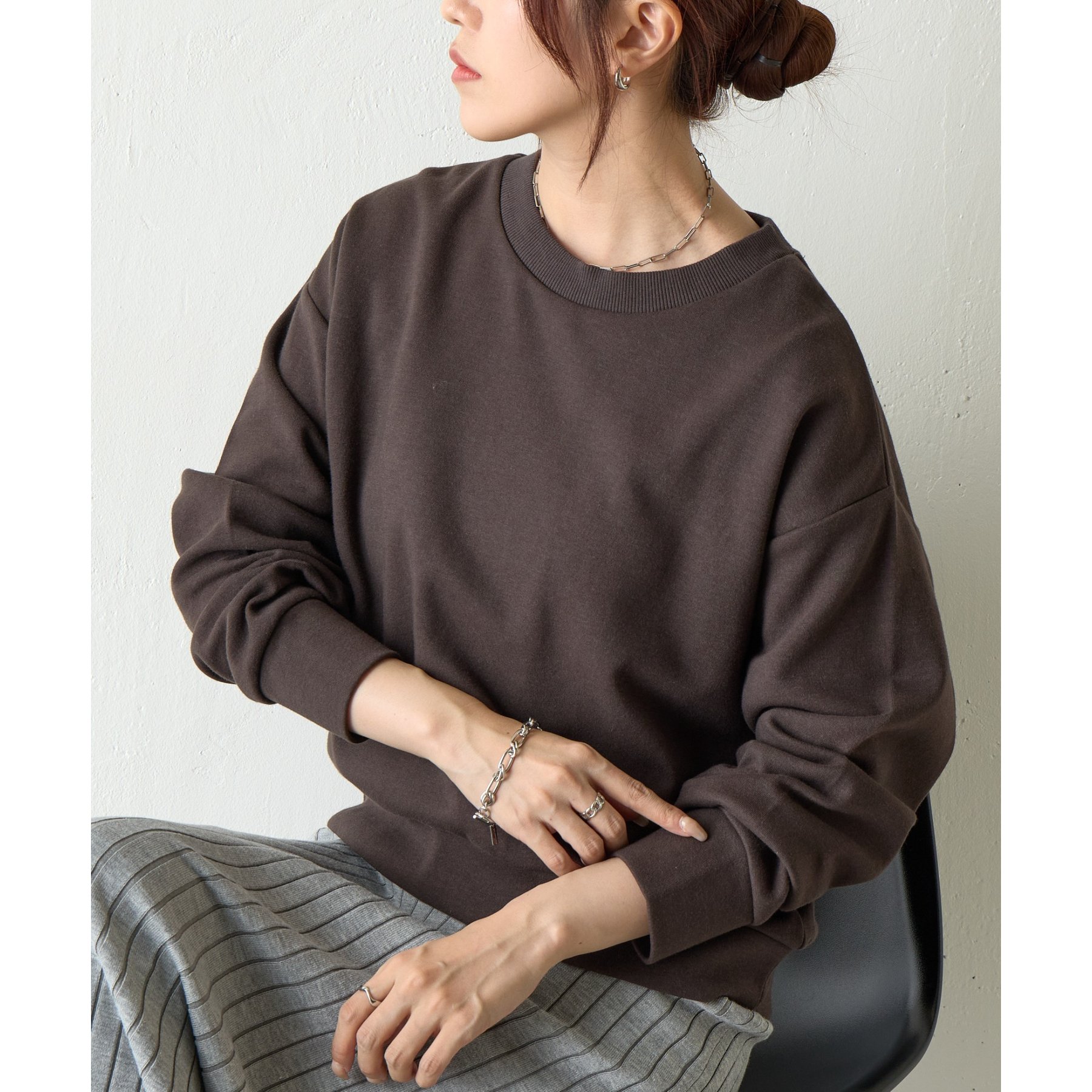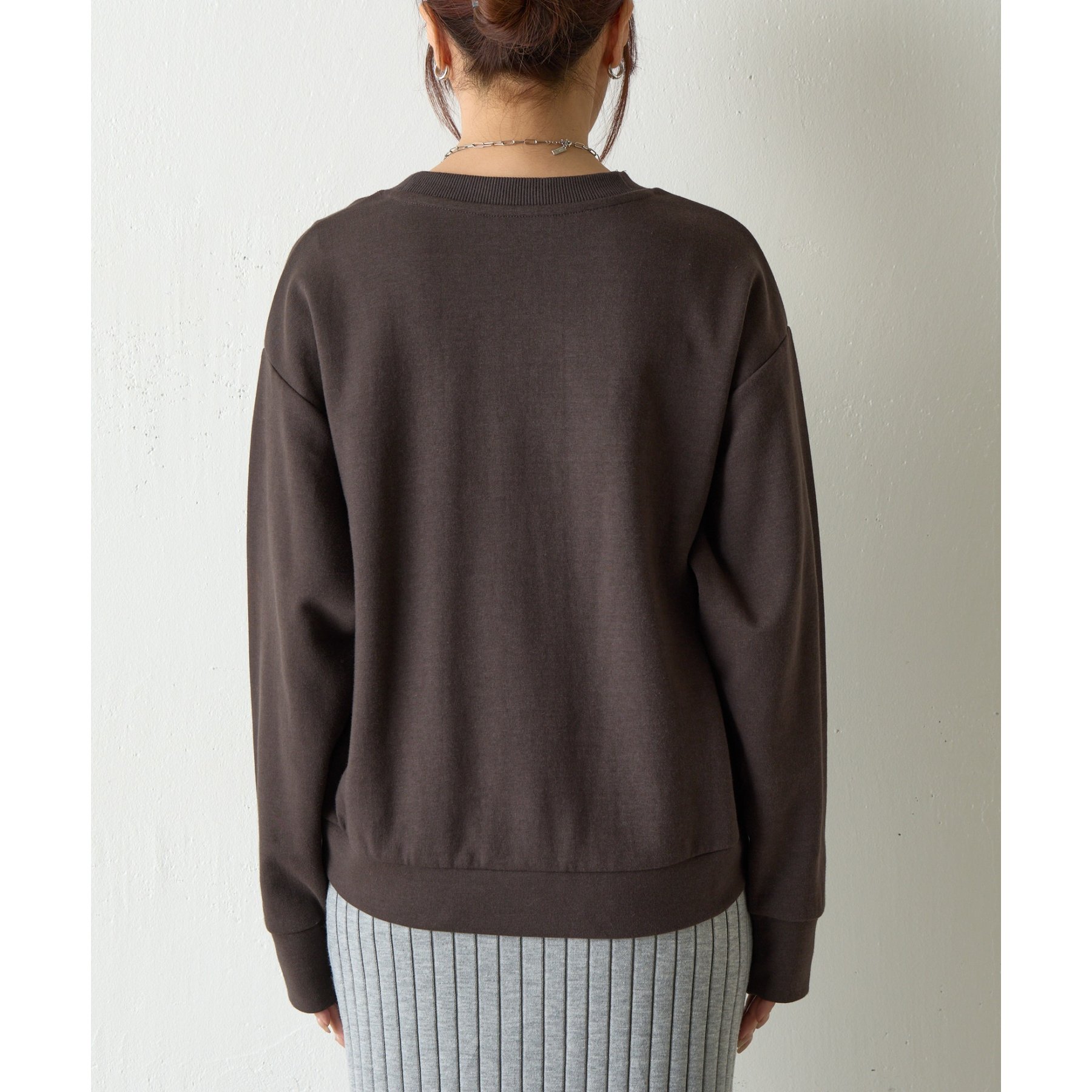 袖口や裾のリブ切替がメリハリを生み、バランスよく着こなせます。
