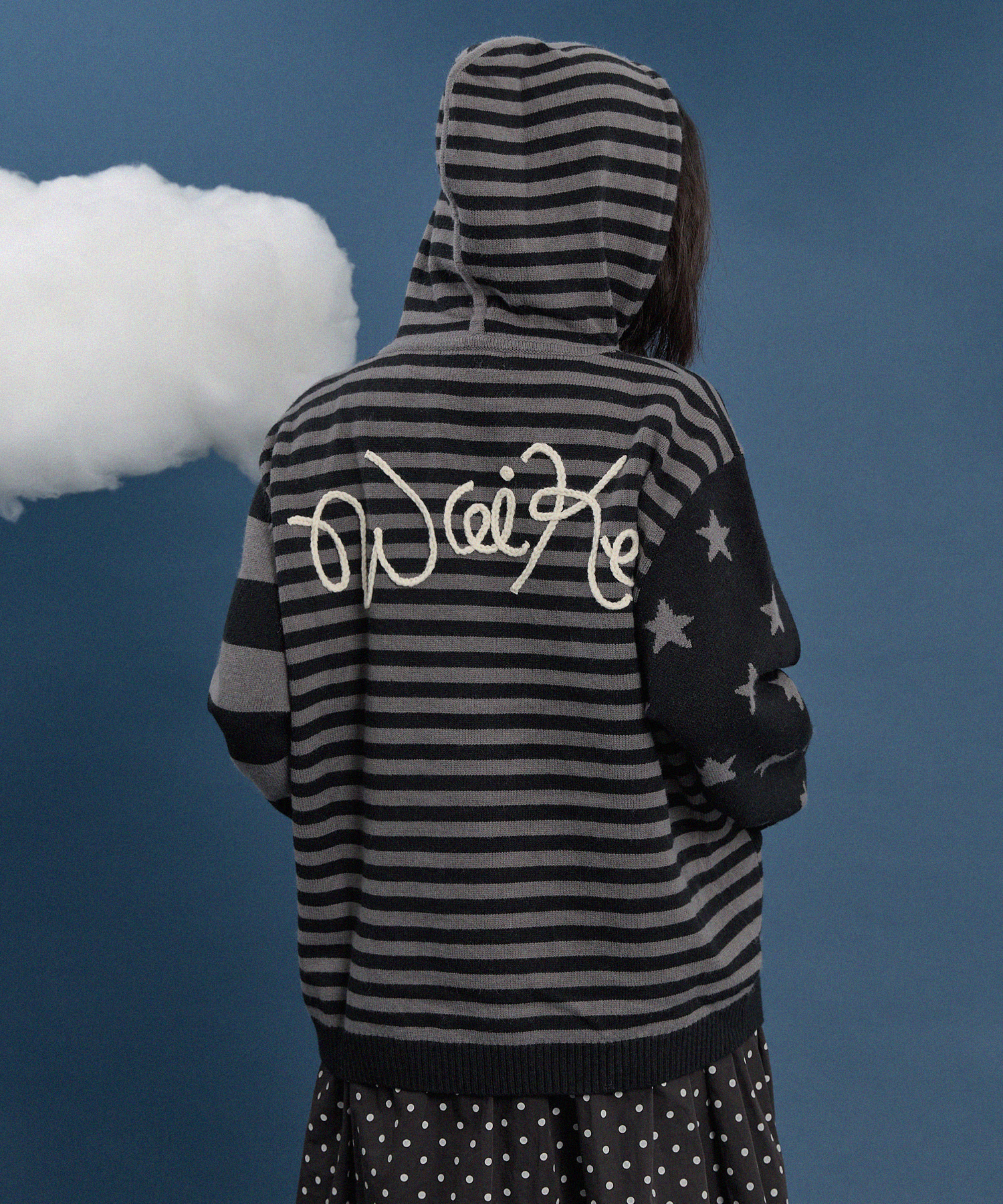 [K-POPアイドル着用] Stripe Star Hood Knit Zip Up BLACK