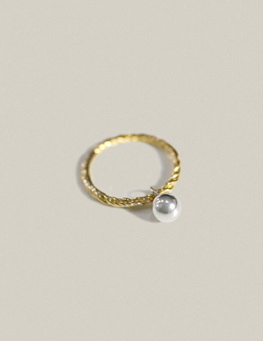 繊細にねじれた形のリングに銀ボールが付いていて移動するデザインの指輪です。