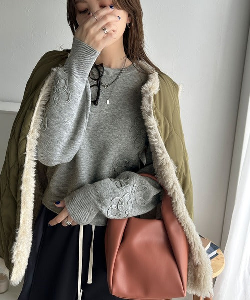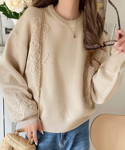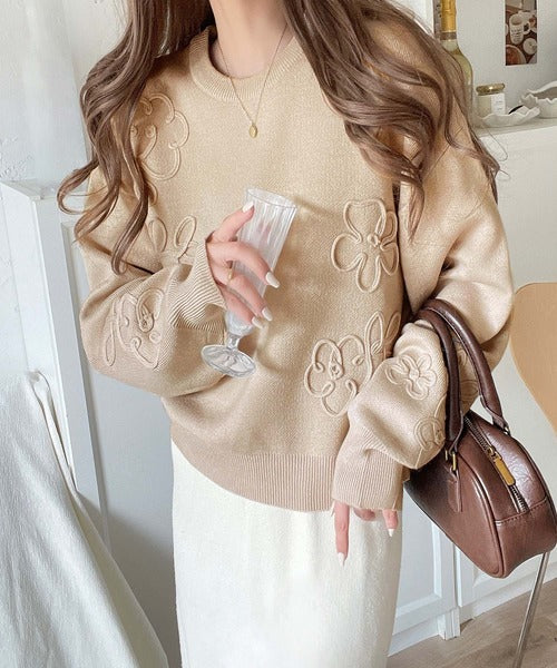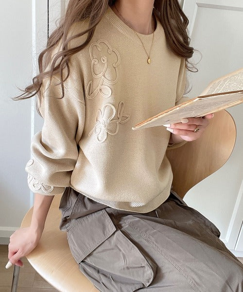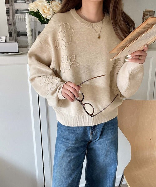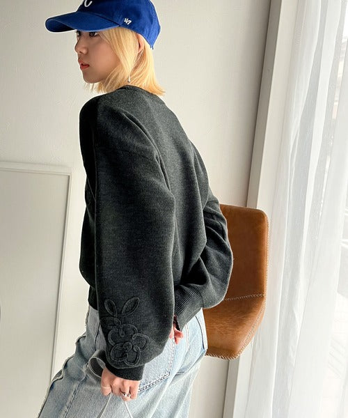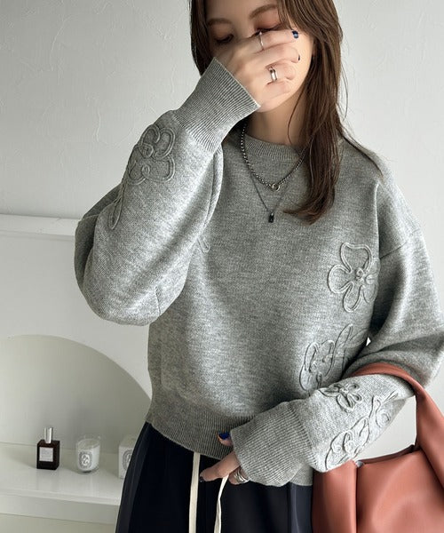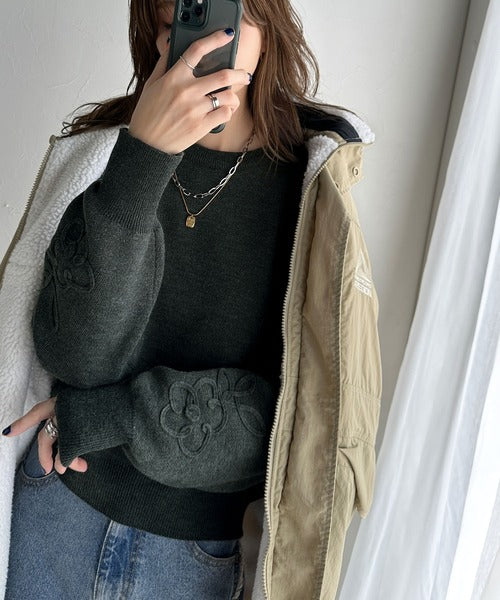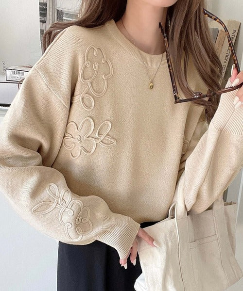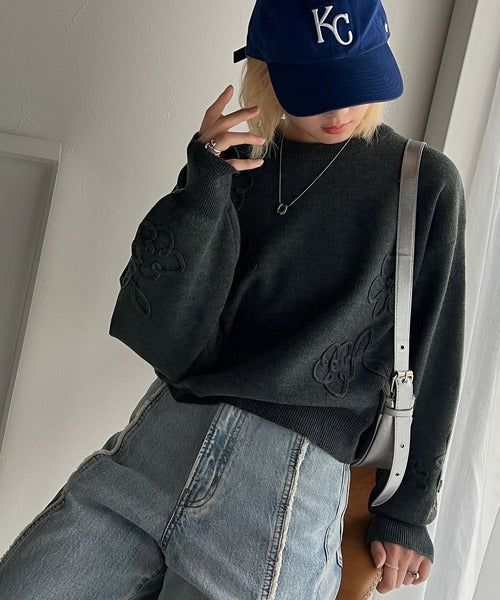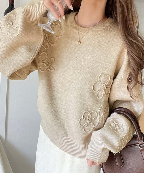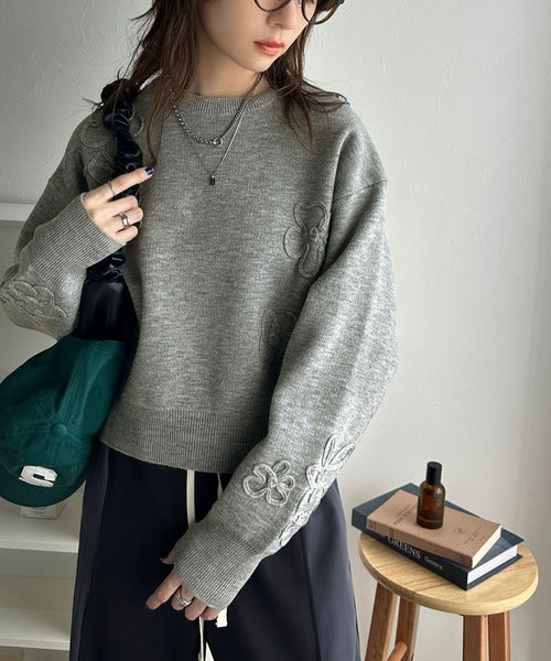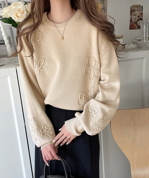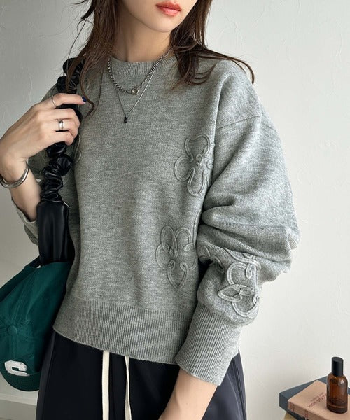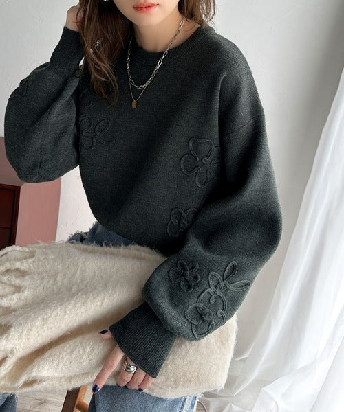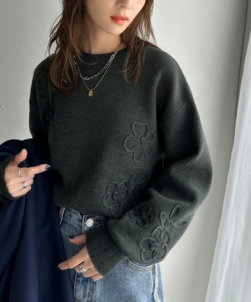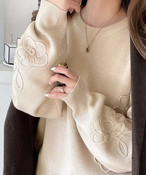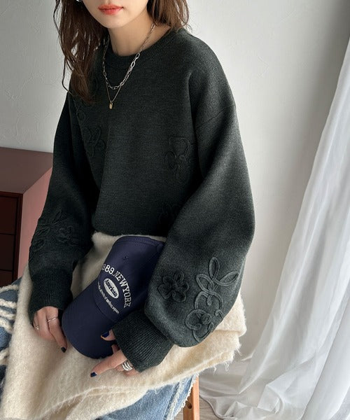 ぽわん袖が心をつかむ!コードフラワー使いクロップド丈ジャカードニット ce1260358