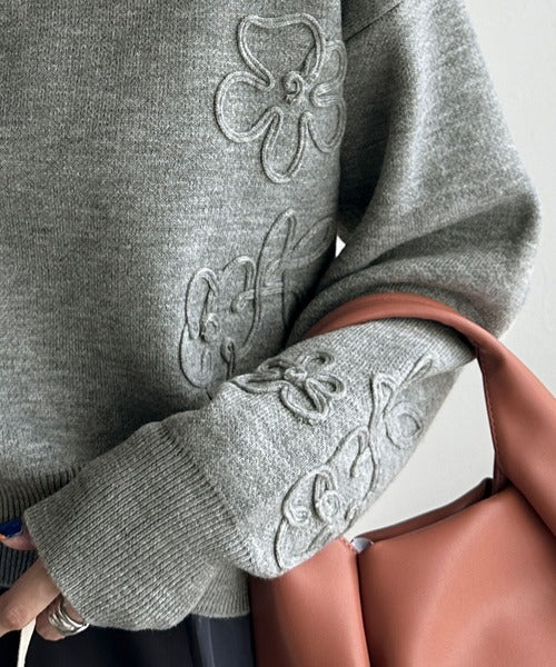 コードフラワーをあしらったジャカードニットトップス。