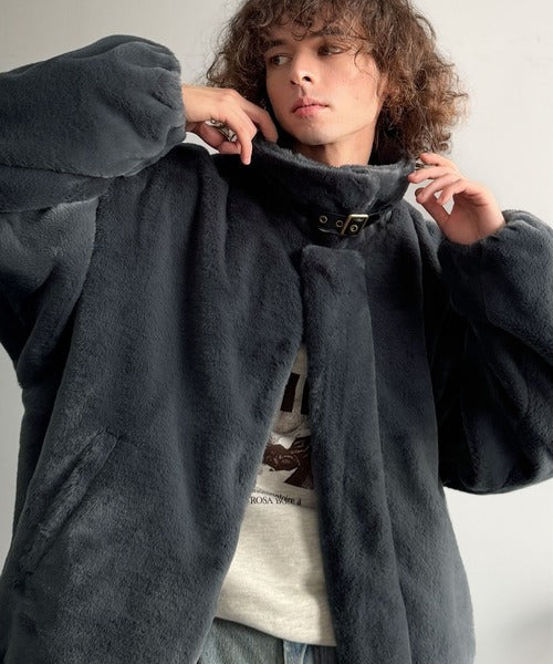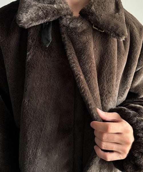 「ベルト襟フェイクファー素材ジャケット/Belted Collar Faux Fur Jacket」