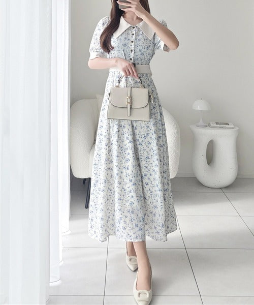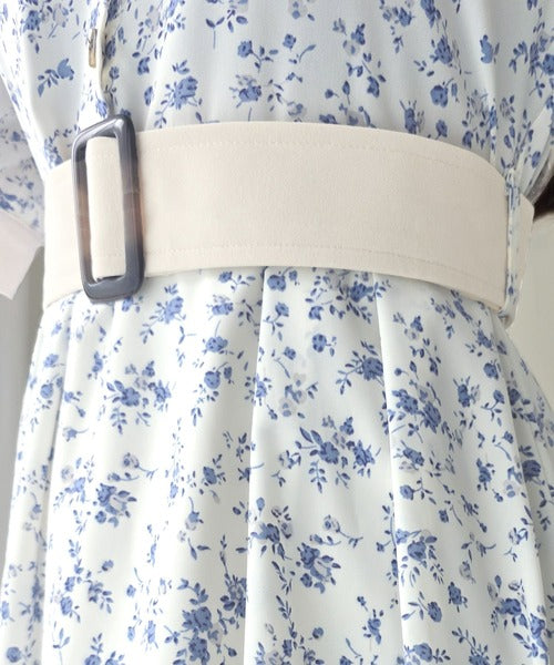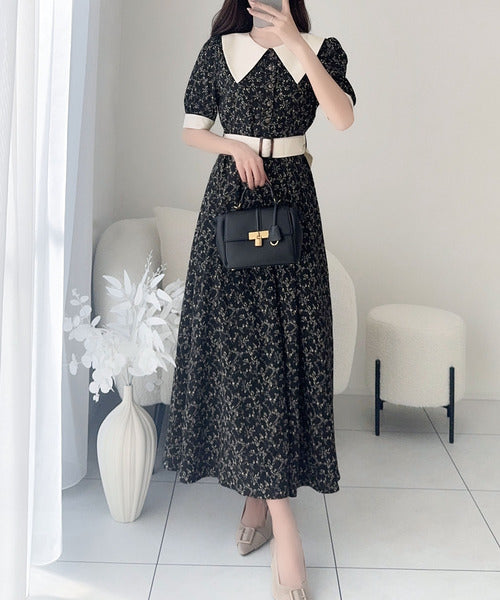 【mily bilet】トレンドのレトロガーリー♪小花柄ベルト付きビッグカラーワンピース(ロング丈) mi1139044